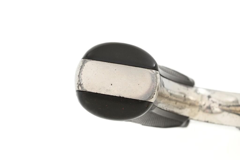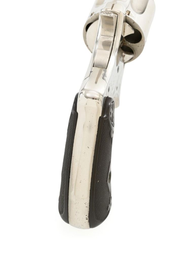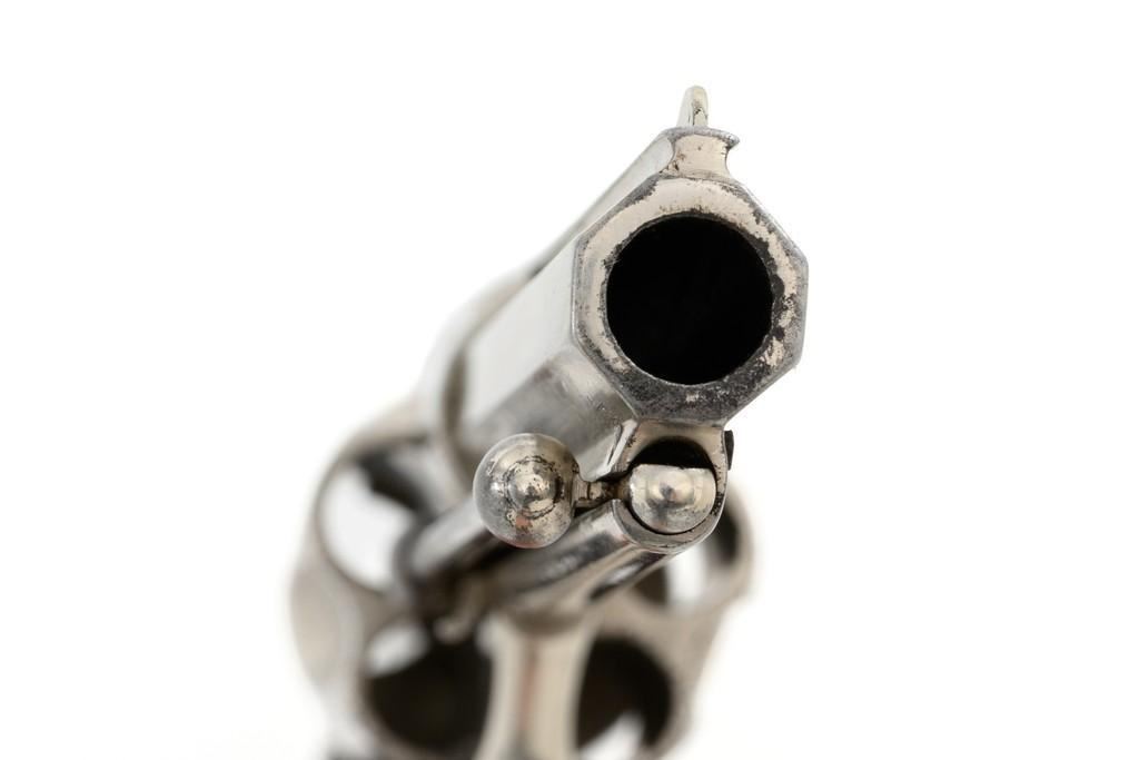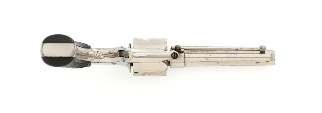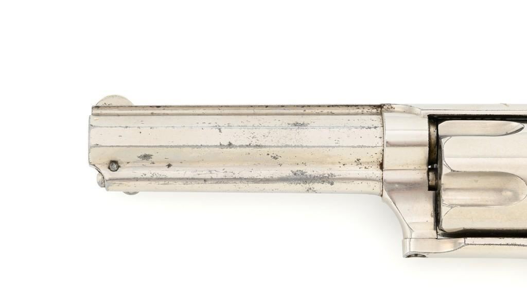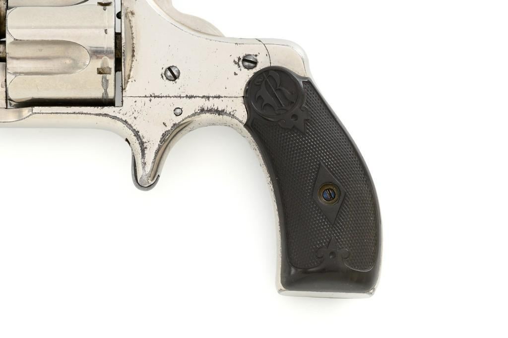 Remington-Smoot New Model No. 3 ''Saw Handle'' Revolver, #NVSN, .38 Short CF cal., 3.75'' octagon barrel, nickel finish, two-piece black checkered hard rubber grips with ''R'' monogram, fixed half-moon blade front sight, and small notched rear sight. Top of the barrel is marked in one-line ''E. REMINGTON & SONS. ILION, N.Y. PAT. W.S. SMOOT OCT. 21, 1873.'' Approx. 6,000 were manufactured with the saw-handle grip. Revolver is in fine condition, retaining approx. 95% of its original nickel finish. Factory markings are clear. Grips are excellent. Action is crisp and cycles smoothly. Bore is very good with scattered light erosion, rifling is clear. Est.: $600-$800. (Antique)(Michael Strietbeck Collection)