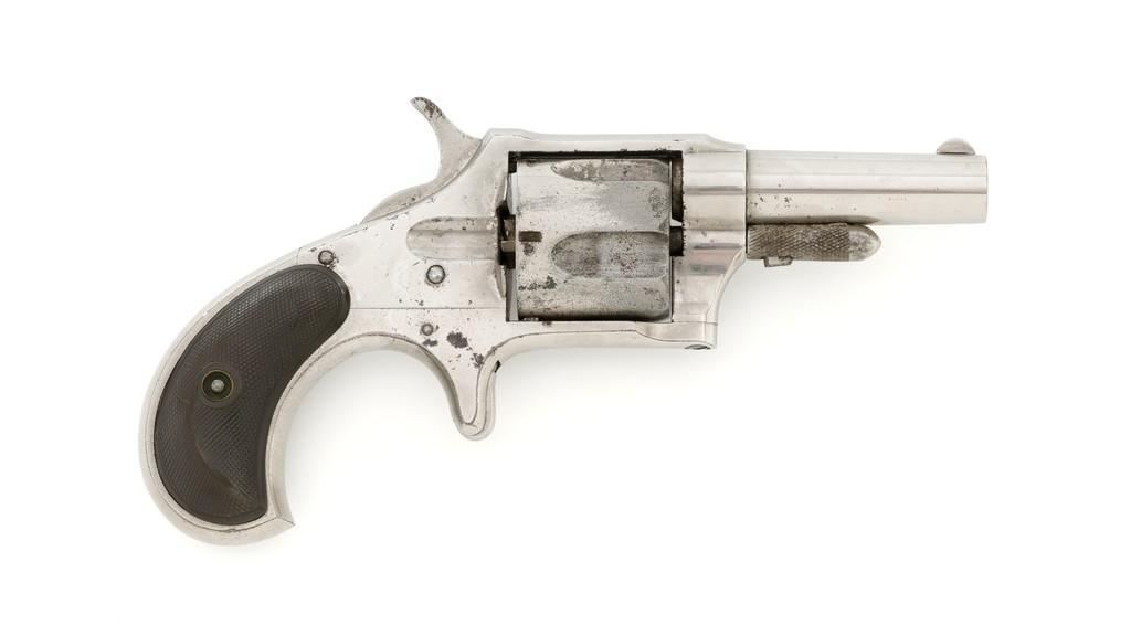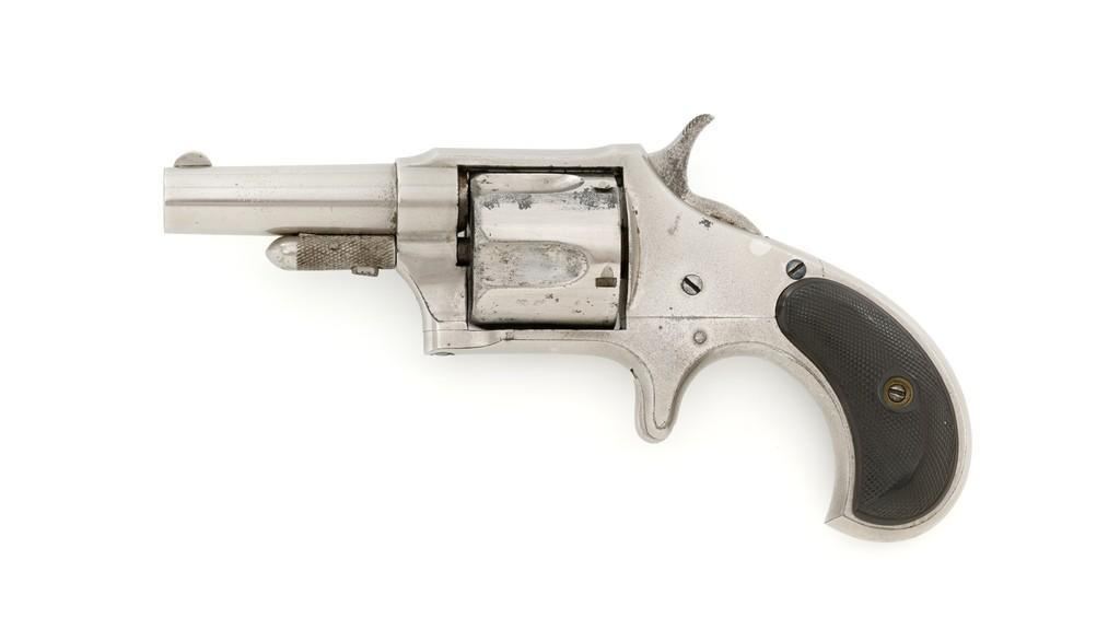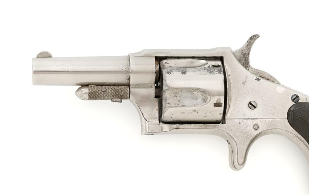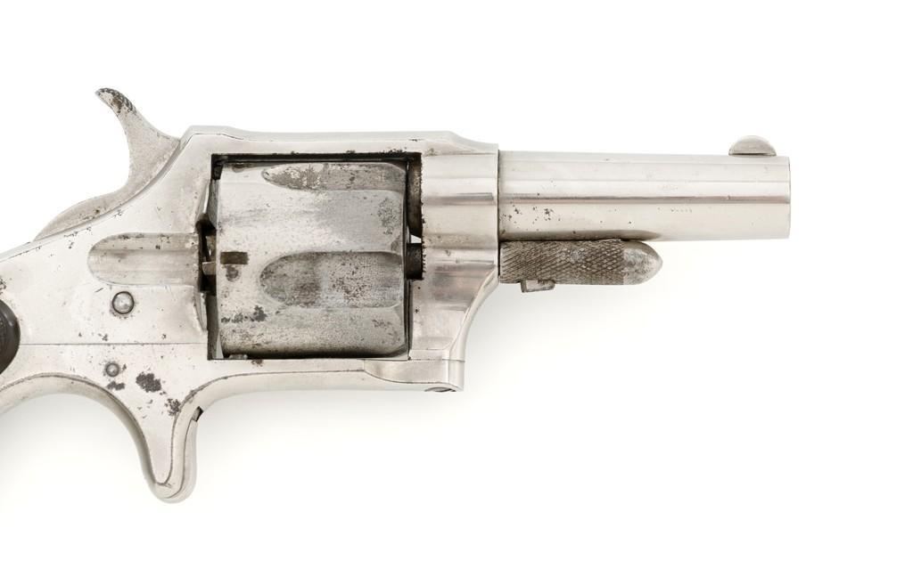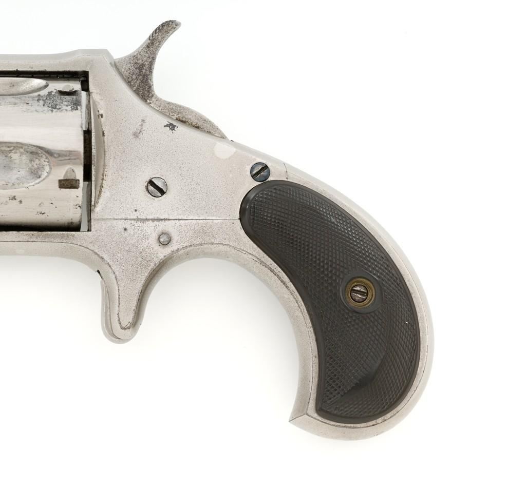 Remington New Model No. 4 Spur Trigger Revolver, #NVSN, .38 Short CF cal., 2.5'' round barrel, nickel finish, two-piece black checkered hard rubber grips, half-moon blade front sight, and small notched rear sight. Barrel address is marked in one-line ''E. REMINGTON & SONS. ILION. N.Y.'' Approx. 23,000 Mfg'd circa 1877-1888. Revolver is in very good overall condition, retaining approx. 80% of its original nickel finish, with some flaking and mild pitting on the receiver. Barrel address is clear. Grips show moderate signs of age and wear but have no significant blemishes. Hammer and cylinder cycle smoothly but the action needs to be repaired as the hammer will not stay at full cock. Rifling is clearly defined, bore with scattered spots of light to moderate erosion. Est.: $300-$500. (Antique)(Michael Strietbeck Collection)