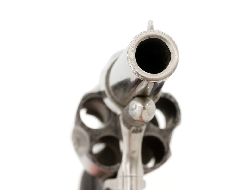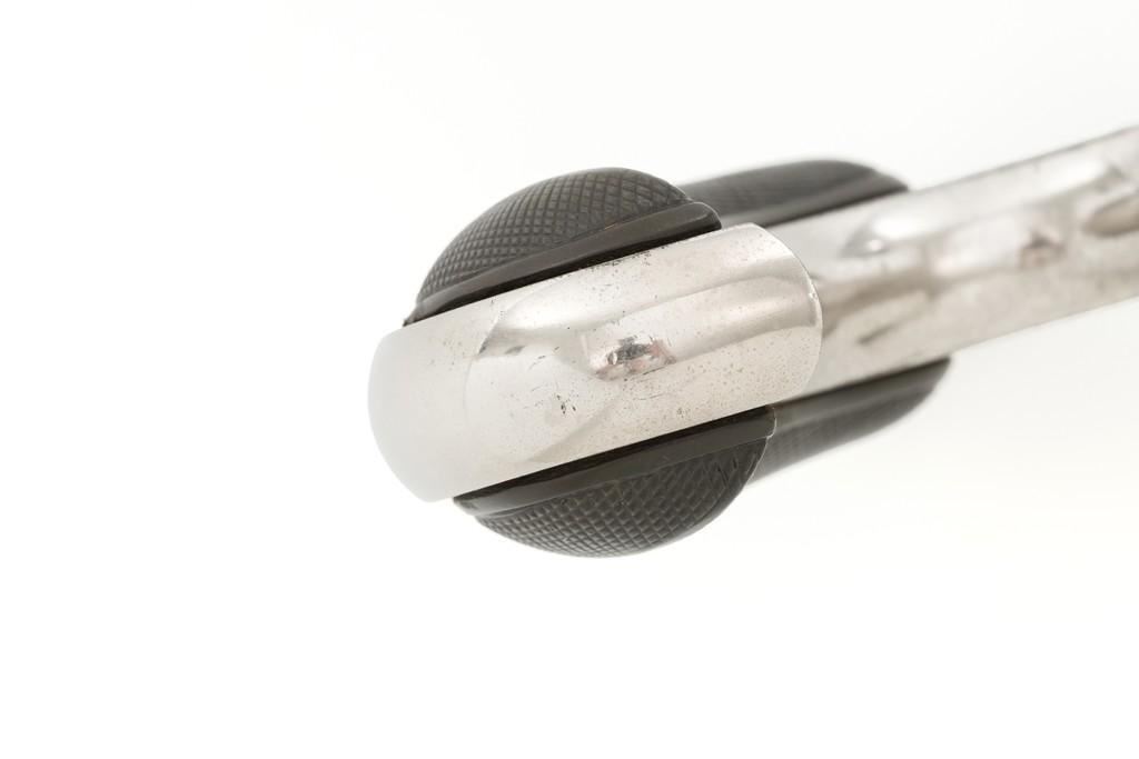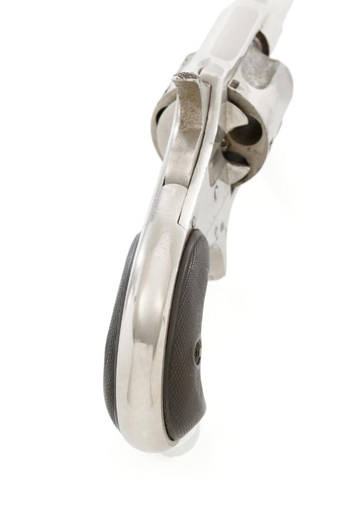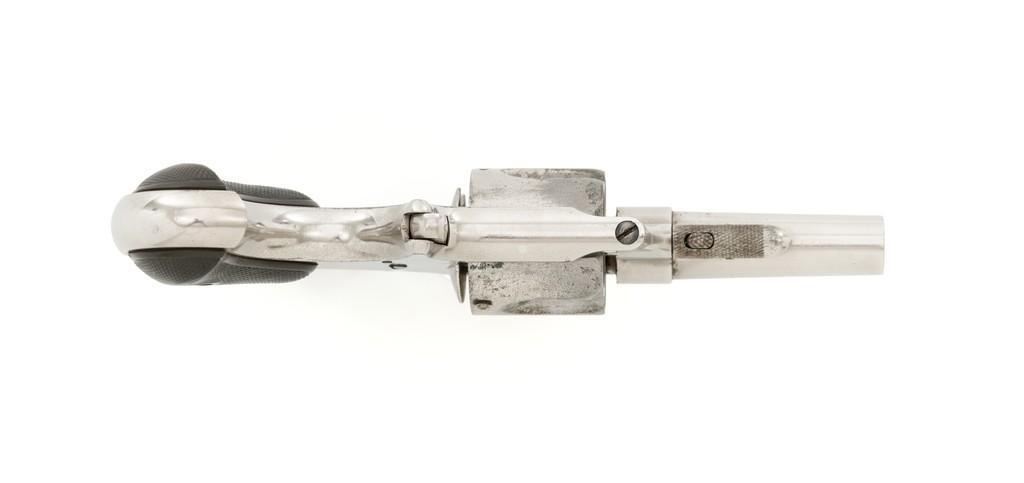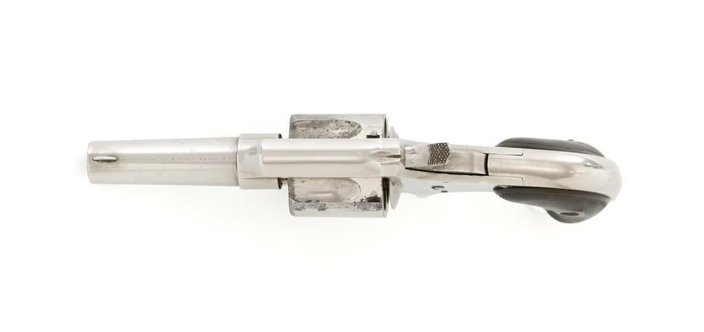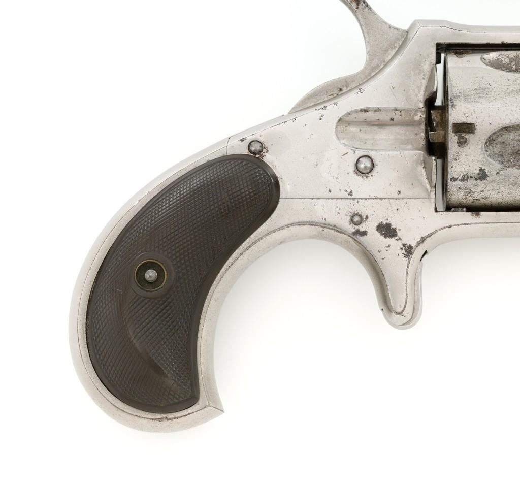 Remington New Model No. 4 Spur Trigger Revolver, #NVSN, .38 Short CF cal., 2.5'' round barrel, nickel finish, two-piece black checkered hard rubber grips, half-moon blade front sight, and small notched rear sight. Barrel address is marked in one-line ''E. REMINGTON & SONS. ILION. N.Y.'' Approx. 23,000 Mfg'd circa 1877-1888. Revolver is in very good overall condition, retaining approx. 80% of its original nickel finish, with some flaking and mild pitting on the receiver. Barrel address is clear. Grips show moderate signs of age and wear but have no significant blemishes. Hammer and cylinder cycle smoothly but the action needs to be repaired as the hammer will not stay at full cock. Rifling is clearly defined, bore with scattered spots of light to moderate erosion. Est.: $300-$500. (Antique)(Michael Strietbeck Collection)