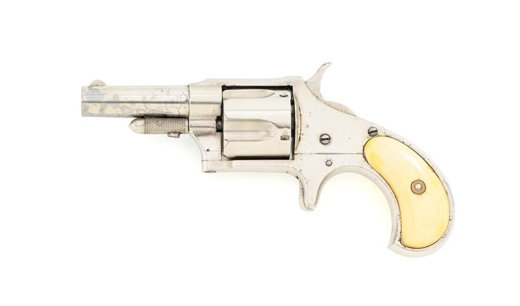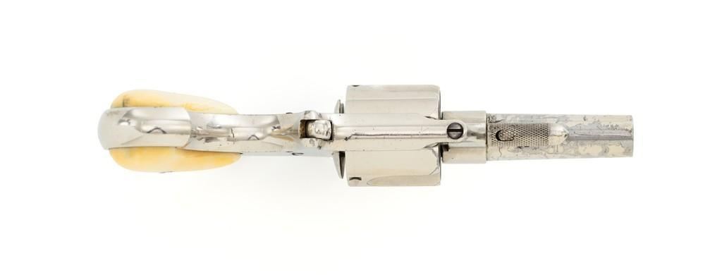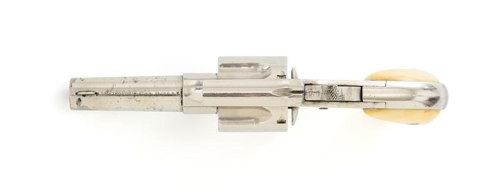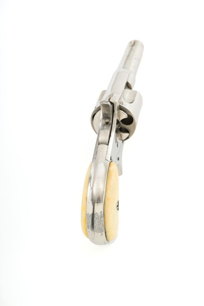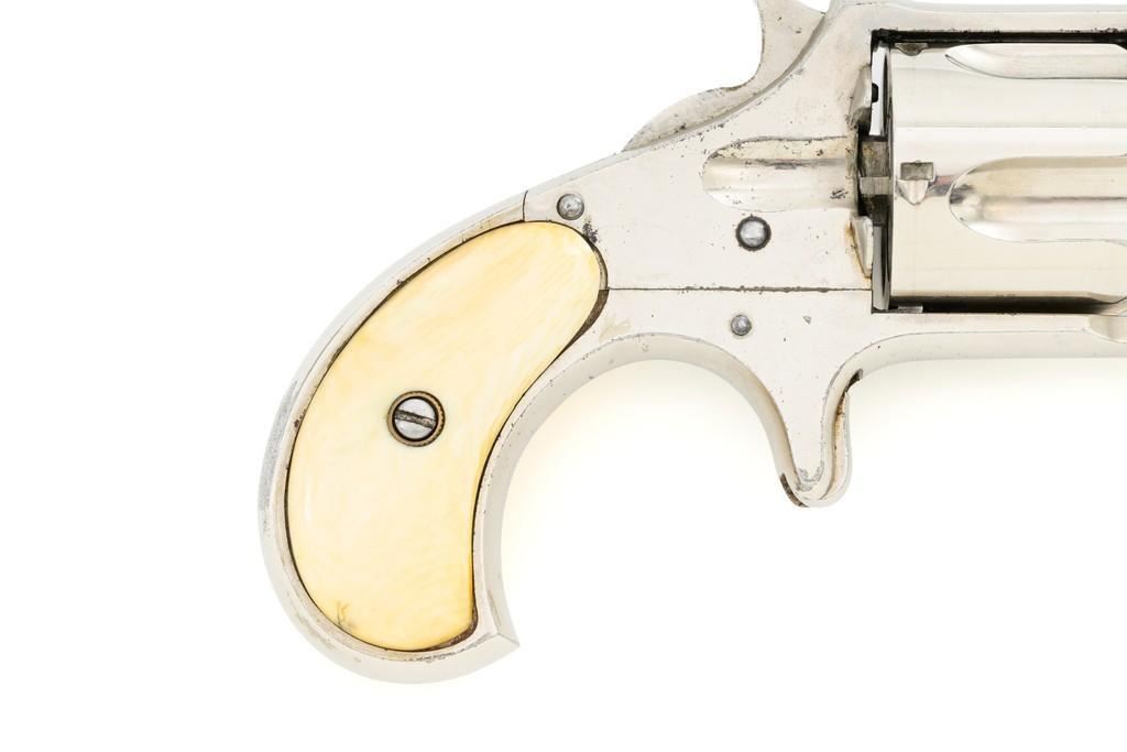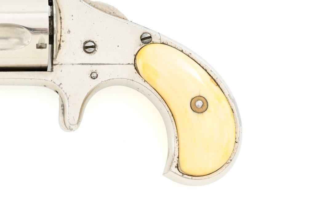 Remington New Model No. 4 Spur Trigger Revolver, #NVSN, .38 Short CF cal., 2.5'' round barrel without ejector rod, nickel finish, two-piece antique ivory grips, half-moon blade front sight, and small notched rear sight. Barrel address is marked in one-line ''E. REMINGTON & SONS. ILION. N.Y.'' Approx. 23,000 Mfg'd circa 1877-1888. Revolver is in fine overall condition, retaining approx. 95% of its original nickel finish, with a spot of flaking to the backstrap, scattered typical light handling marks. Barrel address is clear. Grips show moderate yellowing from age, with only a few minor blemishes. Action is crisp and cycles smoothly. Bore rates very good+ and has a few spots of very mild erosion. Est.: $400-$600. (Antique)(Michael Strietbeck Collection)