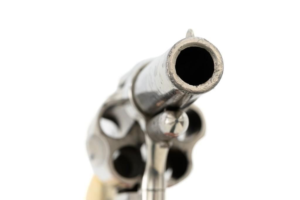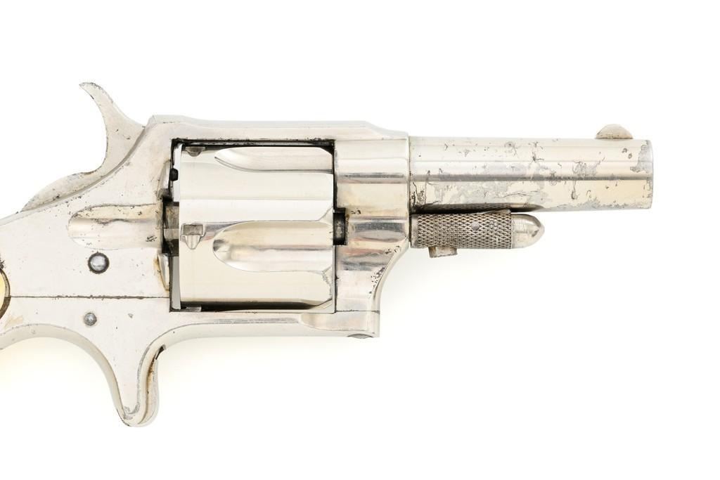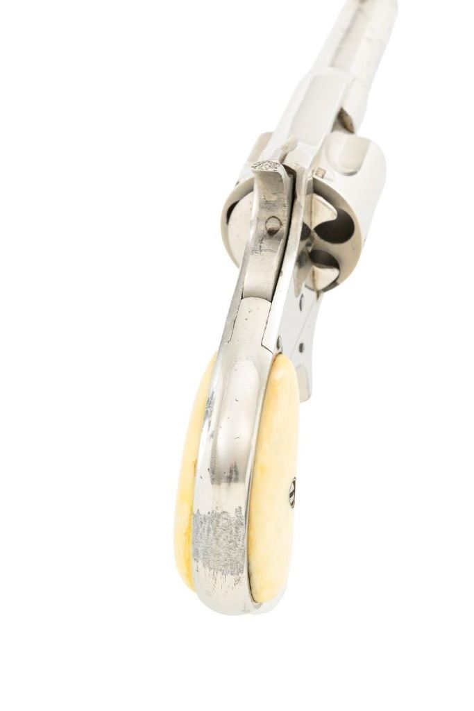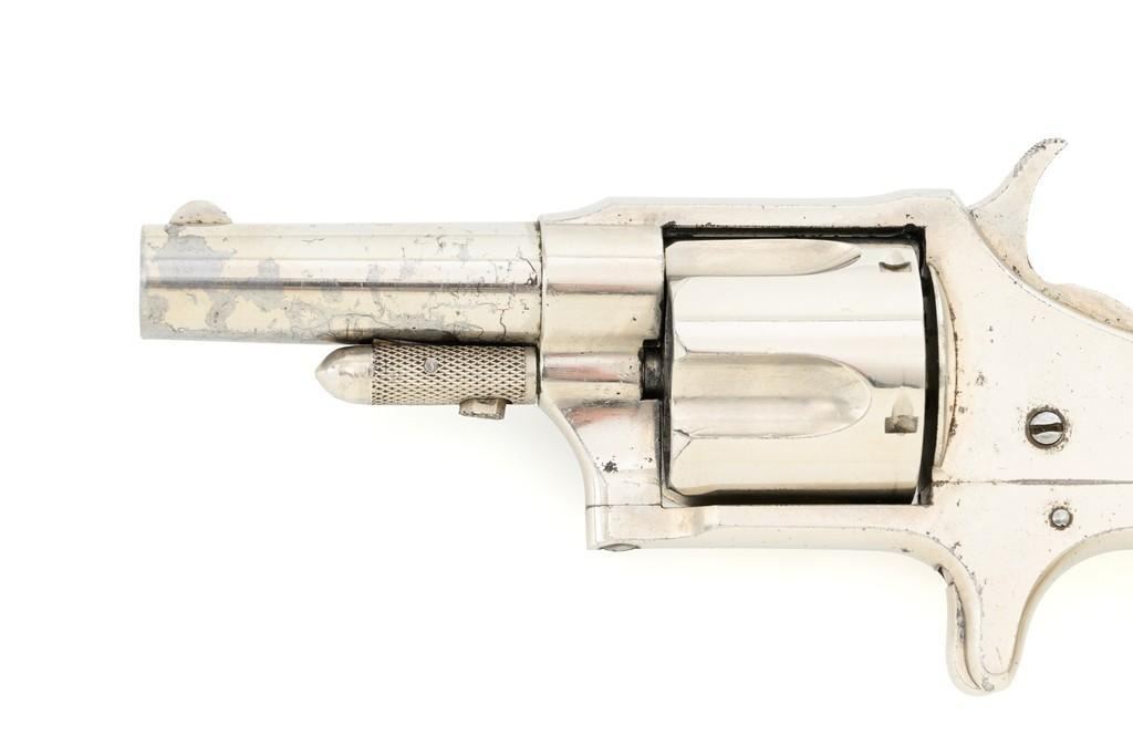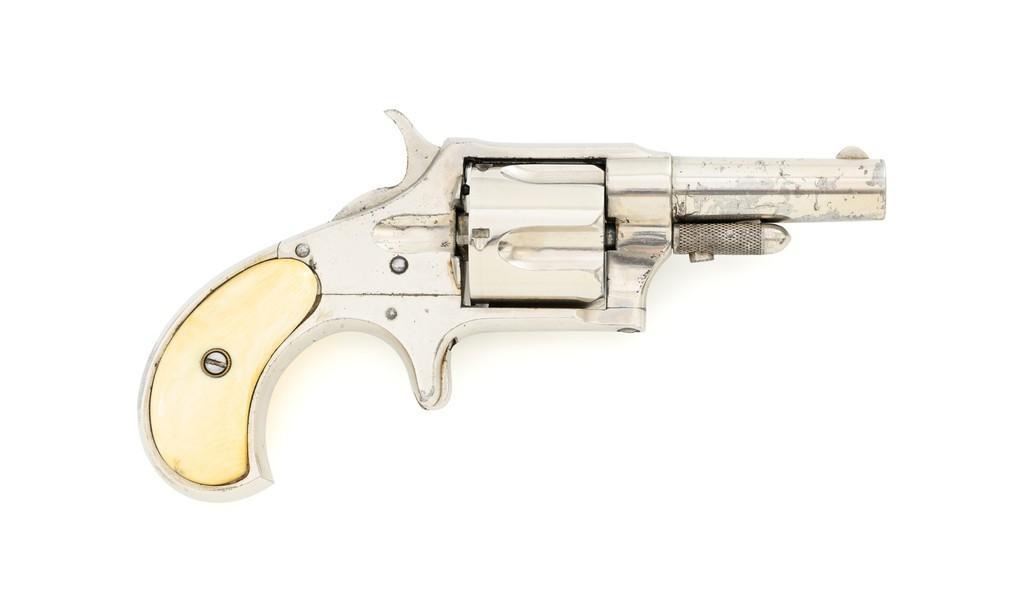 Remington New Model No. 4 Spur Trigger Revolver, #NVSN, .38 Short CF cal., 2.5'' round barrel without ejector rod, nickel finish, two-piece antique ivory grips, half-moon blade front sight, and small notched rear sight. Barrel address is marked in one-line ''E. REMINGTON & SONS. ILION. N.Y.'' Approx. 23,000 Mfg'd circa 1877-1888. Revolver is in fine overall condition, retaining approx. 95% of its original nickel finish, with a spot of flaking to the backstrap, scattered typical light handling marks. Barrel address is clear. Grips show moderate yellowing from age, with only a few minor blemishes. Action is crisp and cycles smoothly. Bore rates very good+ and has a few spots of very mild erosion. Est.: $400-$600. (Antique)(Michael Strietbeck Collection)