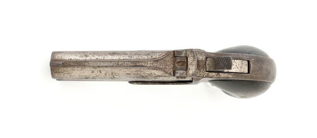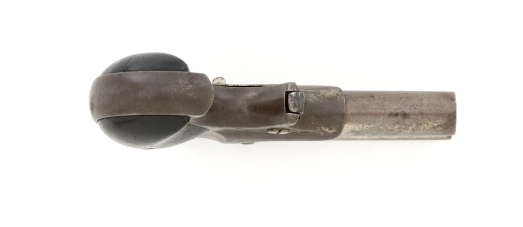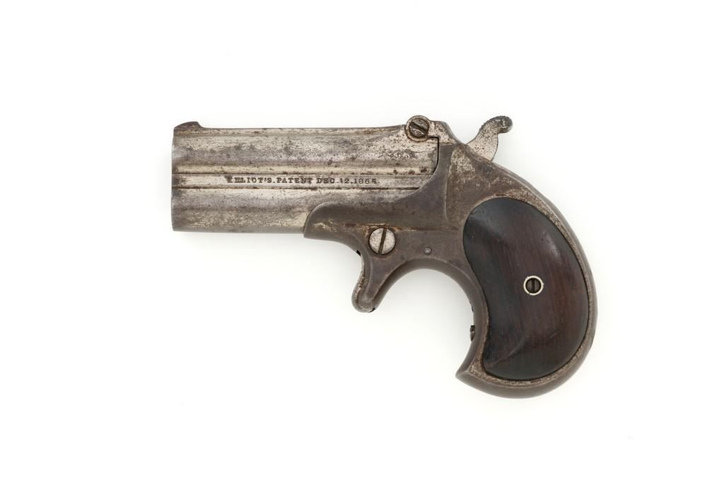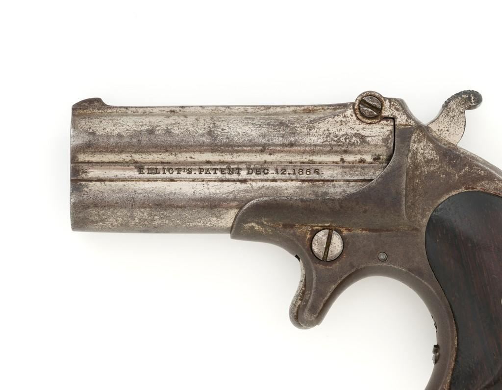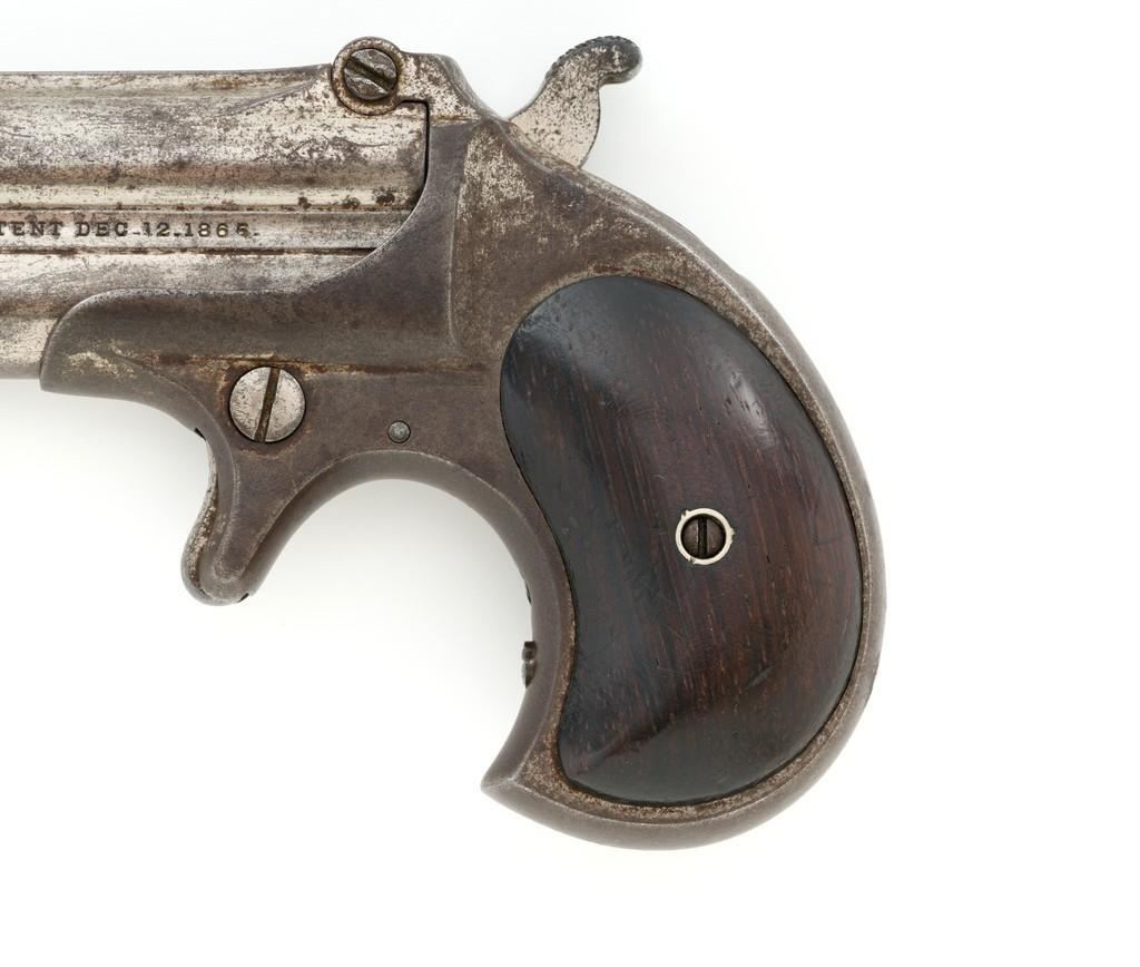 Early production Type I Remington-Elliot Double Derringer, #1180, .41 RF short cal., 3'' barrels, nickel finish, no extractor, two-piece rosewood grips, integral blade front sight, and fixed notched rear sight. Left side of the barrel is marked "ELLIOTS. PATENT DEC 12, 1865". Right side "E. REMINGTON & SONS. ILION, N.Y.". Matching number on left side of the grip frame and underside of the barrel. Mfg'd circa 1866, with less than 2,000 Type I produced without the extractor. Overall condition is good, retaining approx. 25% nickel finish. Factory markings are clear. Grips are very good, with light handling marks; right panel was cracked and neatly repaired. Action is crisp. Bore and rifling are good with scattered spots of moderate erosion. Est.: $800-$1,200. (Antique)(Michael Strietbeck Collection)