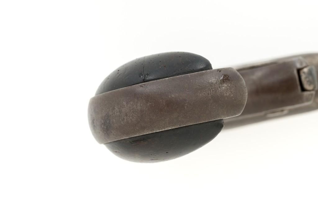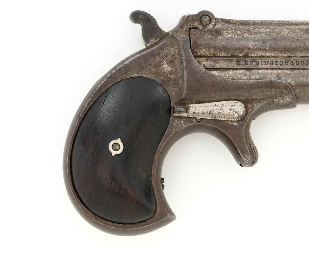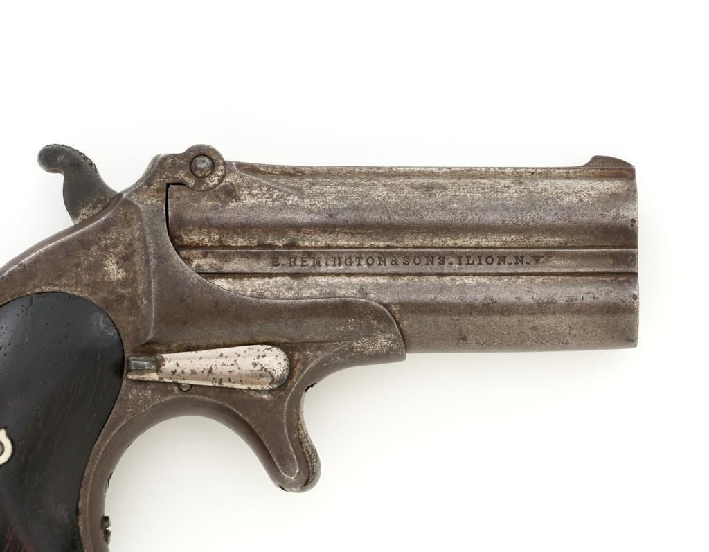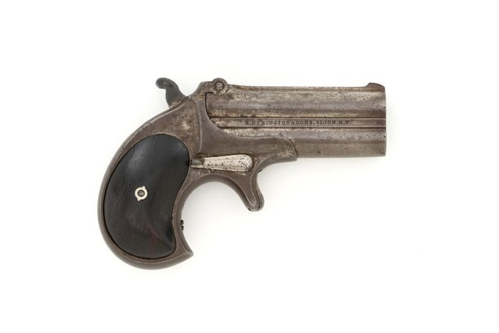 Early production Type I Remington-Elliot Double Derringer, #1180, .41 RF short cal., 3'' barrels, nickel finish, no extractor, two-piece rosewood grips, integral blade front sight, and fixed notched rear sight. Left side of the barrel is marked "ELLIOTS. PATENT DEC 12, 1865". Right side "E. REMINGTON & SONS. ILION, N.Y.". Matching number on left side of the grip frame and underside of the barrel. Mfg'd circa 1866, with less than 2,000 Type I produced without the extractor. Overall condition is good, retaining approx. 25% nickel finish. Factory markings are clear. Grips are very good, with light handling marks; right panel was cracked and neatly repaired. Action is crisp. Bore and rifling are good with scattered spots of moderate erosion. Est.: $800-$1,200. (Antique)(Michael Strietbeck Collection)