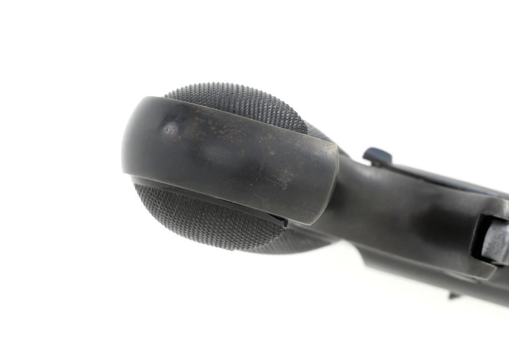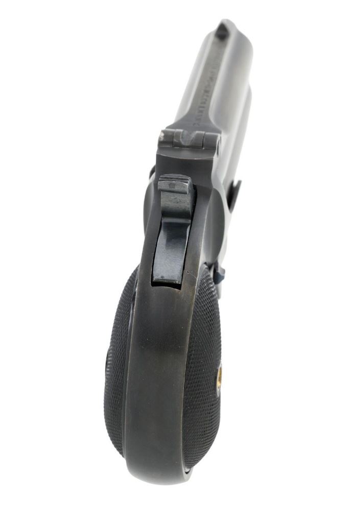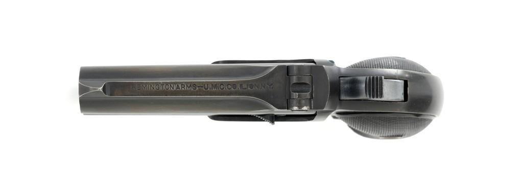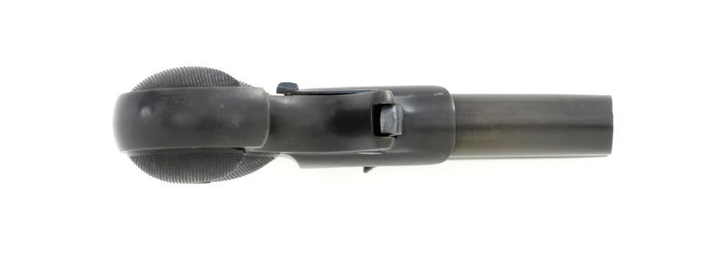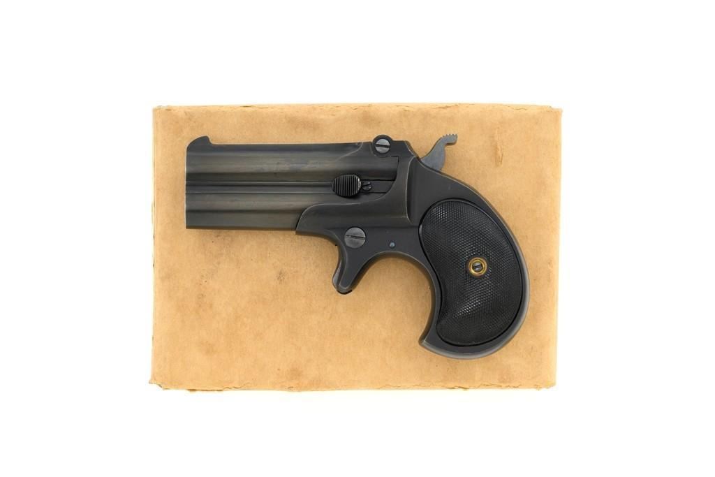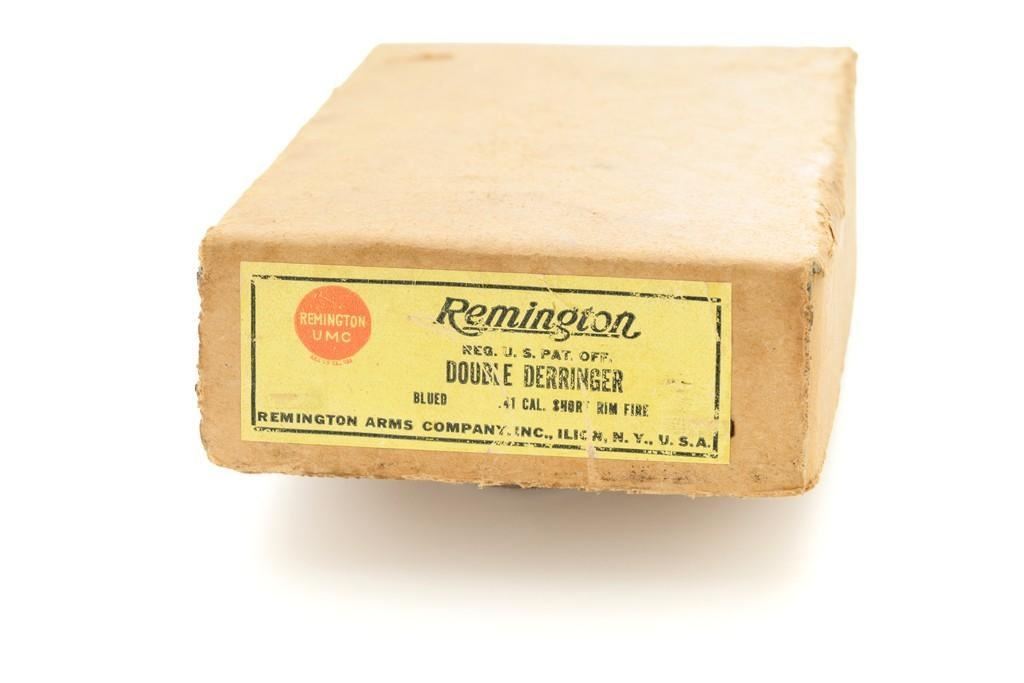 Remington Type III Model No. 4 Double Derringer, #L99789, .41 RF short cal., 3'' barrel group, blued finish, two-piece checkered hard rubber grips, integral blade front sight, and small ''U''-notched rear sight. Top of the barrel is marked "REMINGTON ARMS U.M.C. CO. ILION, N.Y." Matching number on left side of the grip frame and underside of the barrel. Approx. 55,000 produced circa 1912-1935. This derringer is in excellent condition, retaining approx. 97%-98% of its original blue finish, with a little toning to the barrel, and a few light handling marks. Factory markings are sharp. Checkered black hard rubber grips are also excellent. Action is crisp. Bores are excellent with well-defined rifling. Includes two-piece cardboard box with Remington-UMC end label and blued cleaning rod. Box is in very good condition, showing typical discoloration from age, end label shows some age and wear but is still mostly legible. Est.: $700-$900. (C&R/PPT)(Michael Strietbeck Collection)