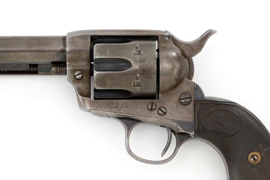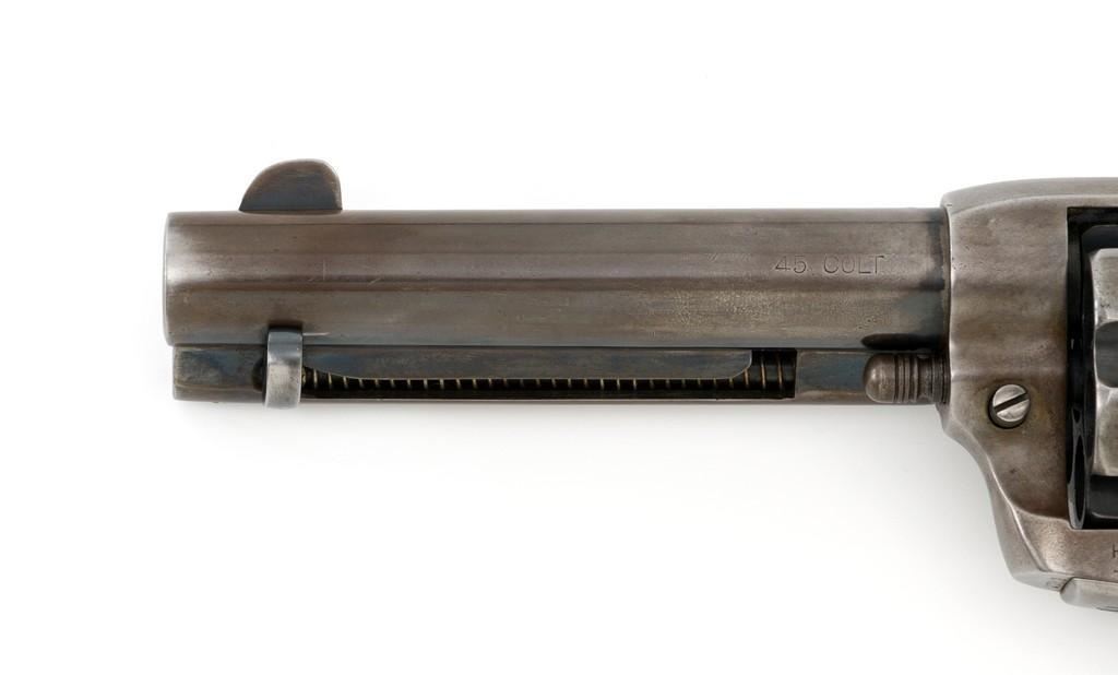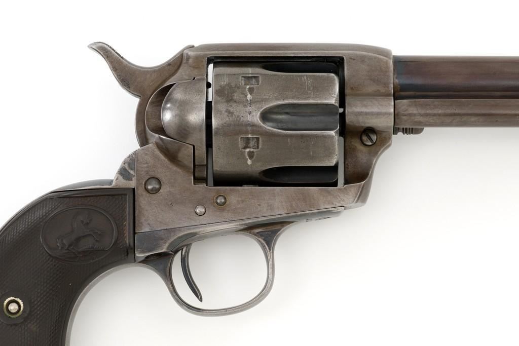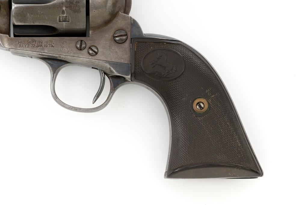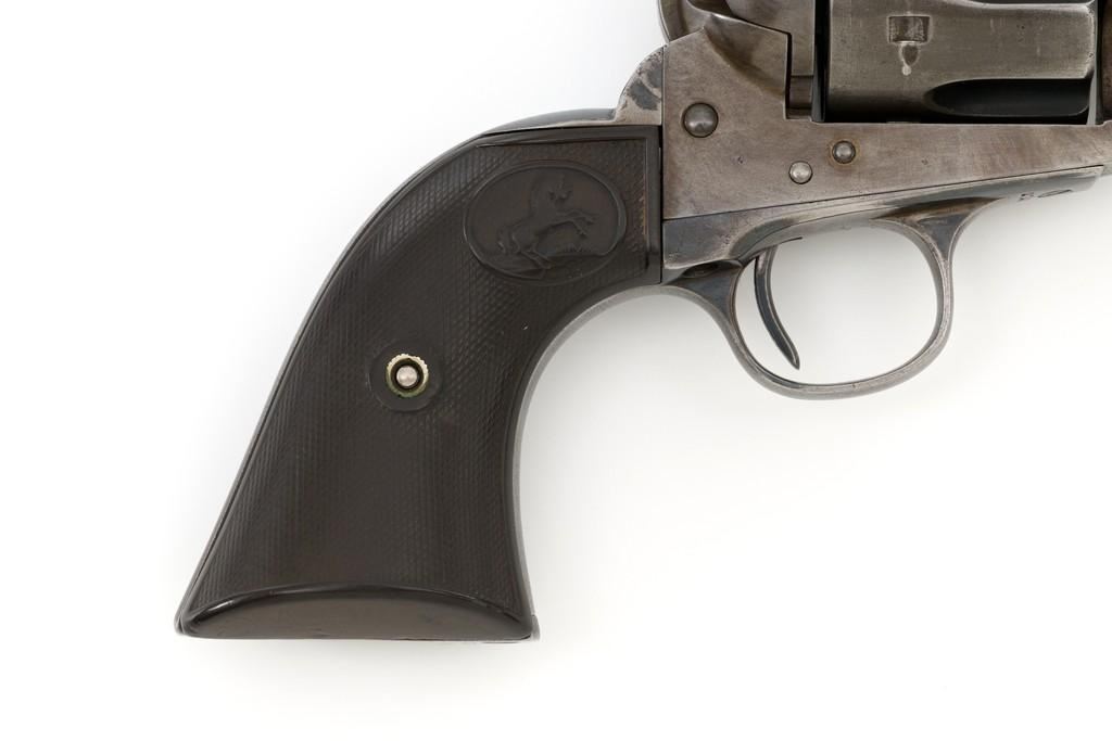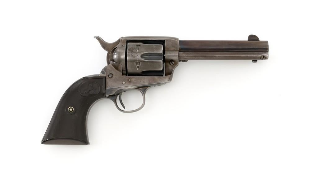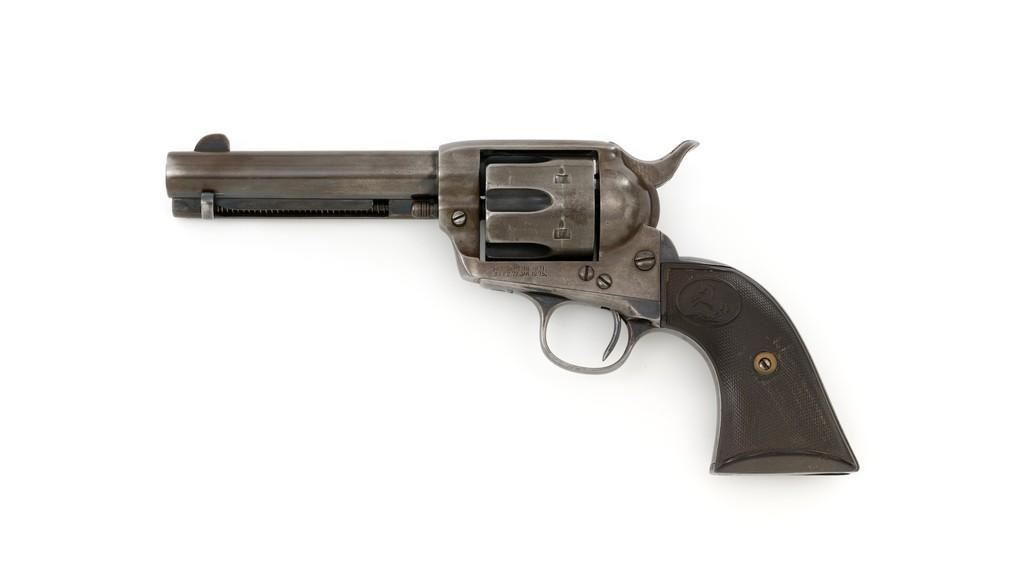 Colt 1st Generation Single Action Army Revolver, #272801, .45 Colt cal., 4.75'' barrel, blued finish, checkered black hard rubber grips with Rampant Colt logo at the top of each panel. Standard sights include a blade front and fixed ''V''-notch rear. Top of the barrel with two-line address; left side ''.45 Colt''. Lower left side of the frame with two-line patent dates and ''(Rampant Colt)''. Inside of the loading gate is marked with assembly number ''3120''. Visible matching numbers on the frame, trigger guard, and backstrap. Mfg'd 1905. Condition of this revolver is good, displaying approx. 10%-15% blue, mainly in the protected areas and underside of the barrel. Balance gone to a smooth, lightly cleaned gray/light brown patina. Factory markings are legible with the Rampant Colt on the frame being light but visible. Grips are good, showing moderate age, wear, and smoothing of the checkering. Action is crisp and cycles very smoothly (likely tuned), with all four clicks. Bore is very good with defined rifling. Est.: $1,800-$2,400. (C&R/PPT)