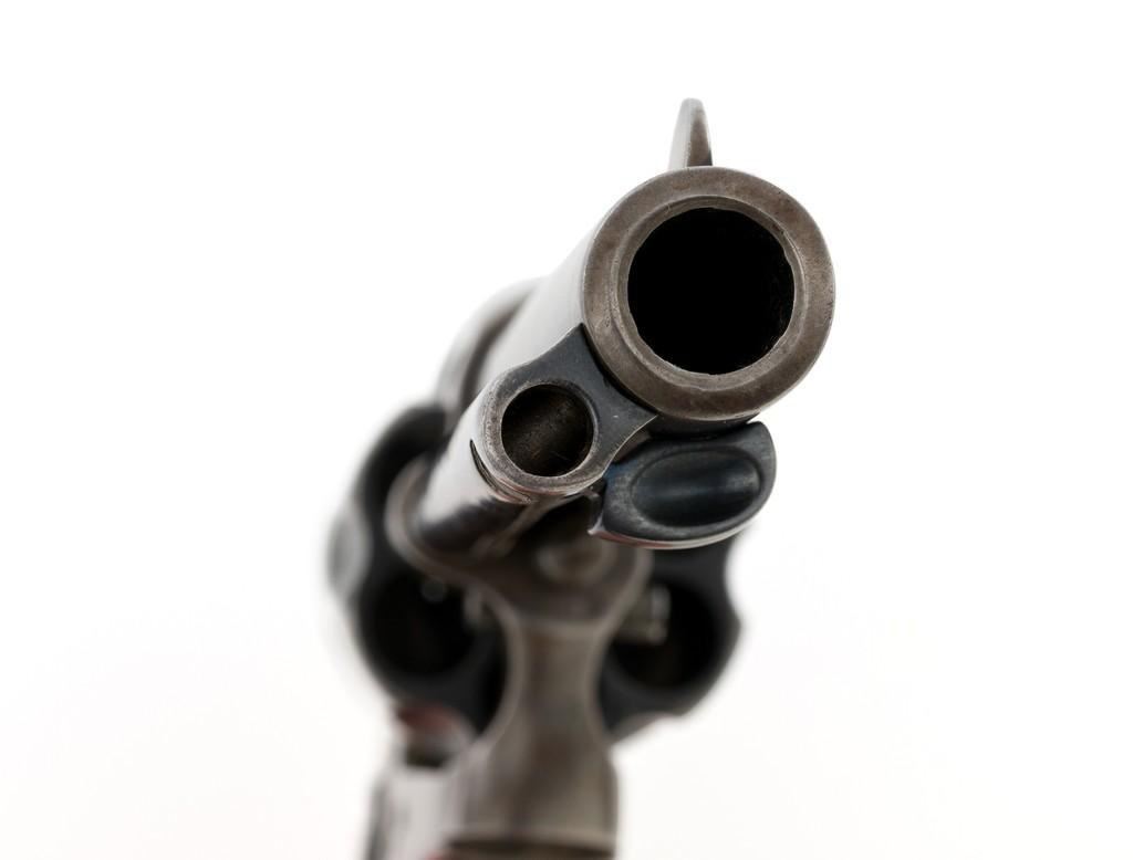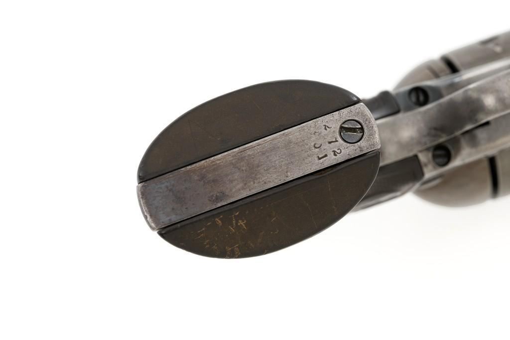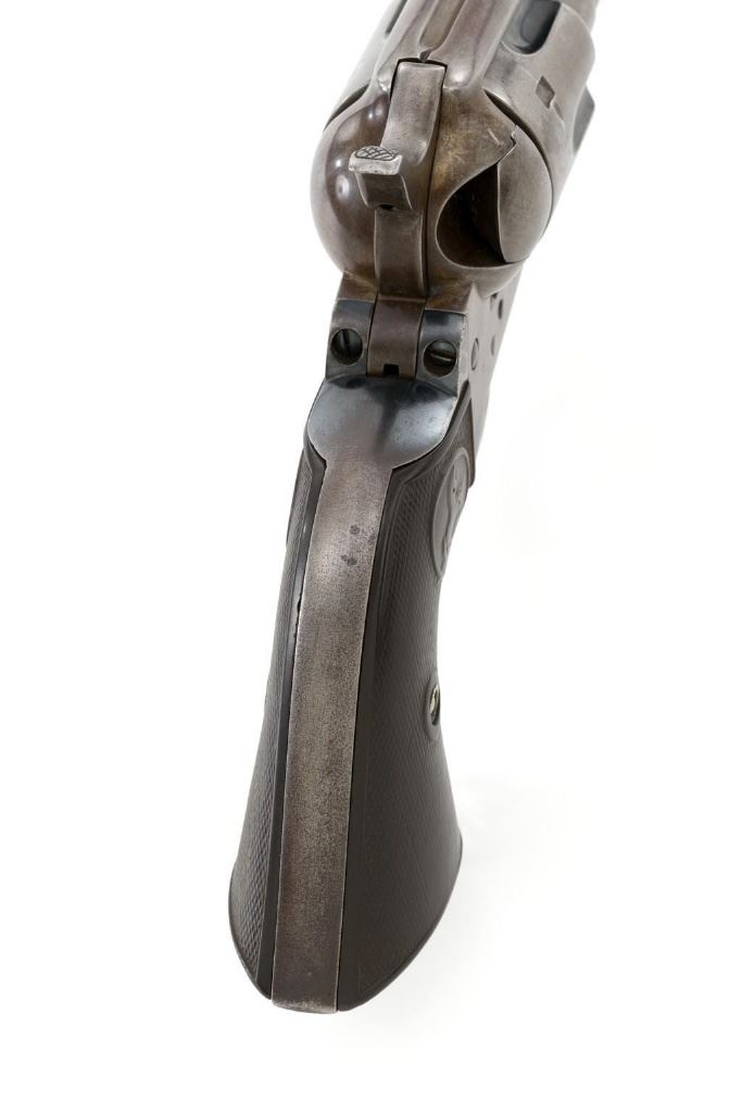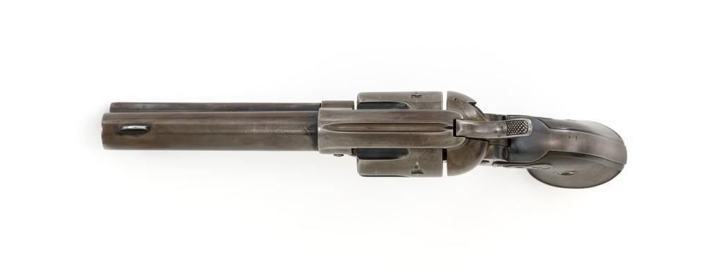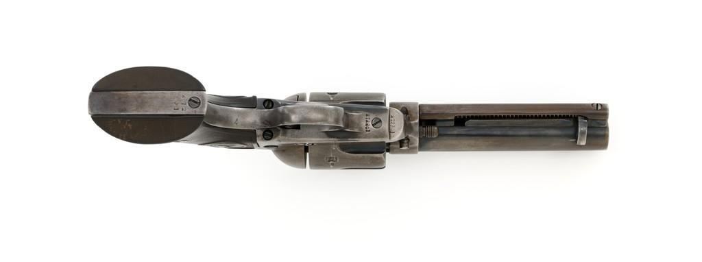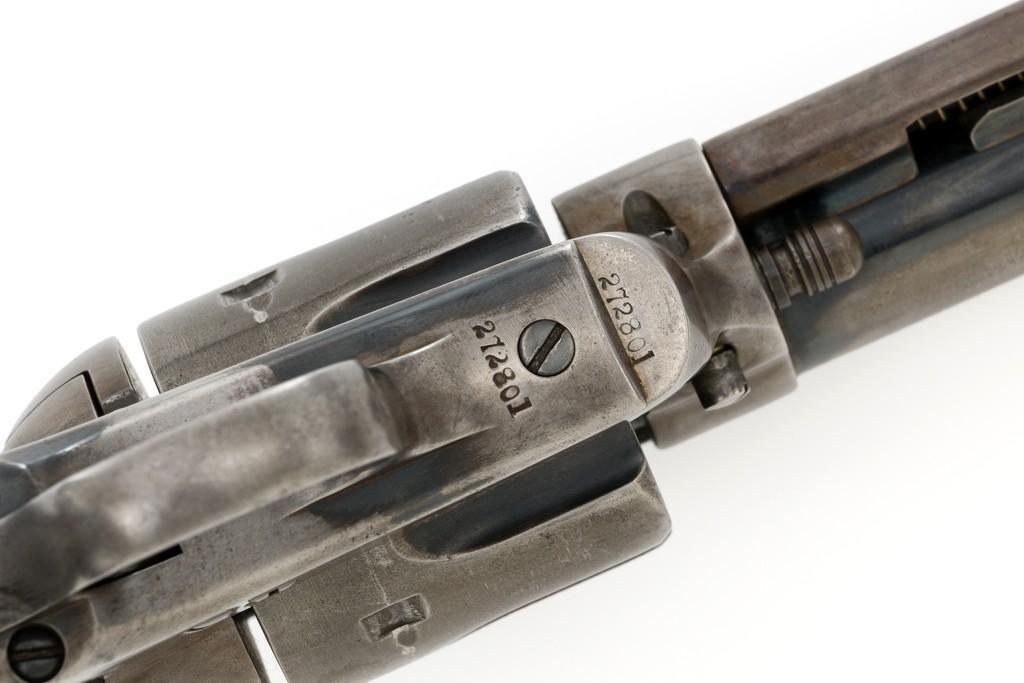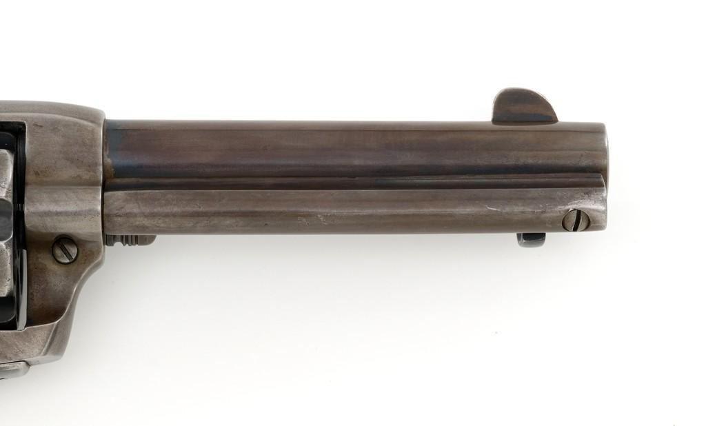 Colt 1st Generation Single Action Army Revolver, #272801, .45 Colt cal., 4.75'' barrel, blued finish, checkered black hard rubber grips with Rampant Colt logo at the top of each panel. Standard sights include a blade front and fixed ''V''-notch rear. Top of the barrel with two-line address; left side ''.45 Colt''. Lower left side of the frame with two-line patent dates and ''(Rampant Colt)''. Inside of the loading gate is marked with assembly number ''3120''. Visible matching numbers on the frame, trigger guard, and backstrap. Mfg'd 1905. Condition of this revolver is good, displaying approx. 10%-15% blue, mainly in the protected areas and underside of the barrel. Balance gone to a smooth, lightly cleaned gray/light brown patina. Factory markings are legible with the Rampant Colt on the frame being light but visible. Grips are good, showing moderate age, wear, and smoothing of the checkering. Action is crisp and cycles very smoothly (likely tuned), with all four clicks. Bore is very good with defined rifling. Est.: $1,800-$2,400. (C&R/PPT)