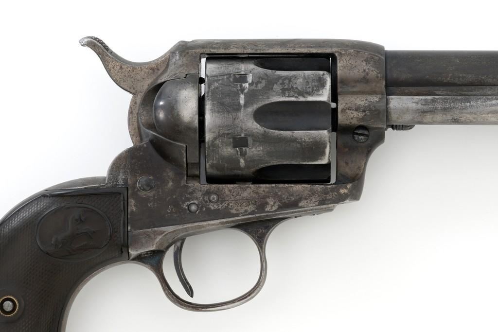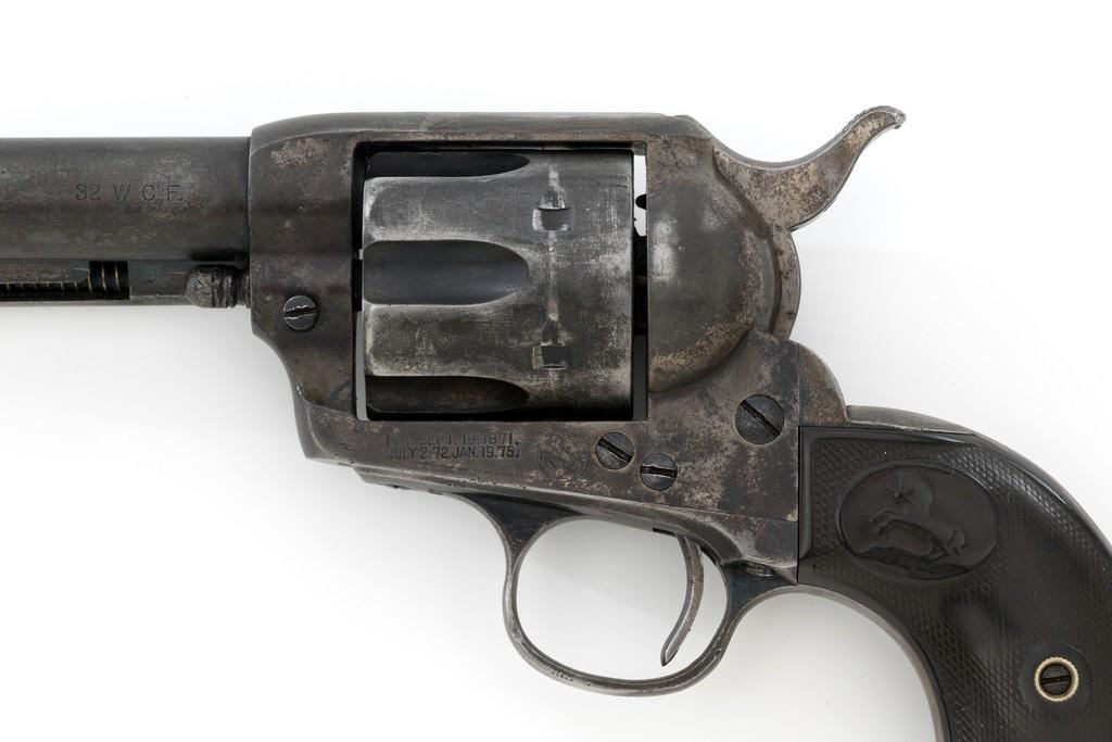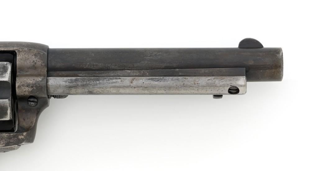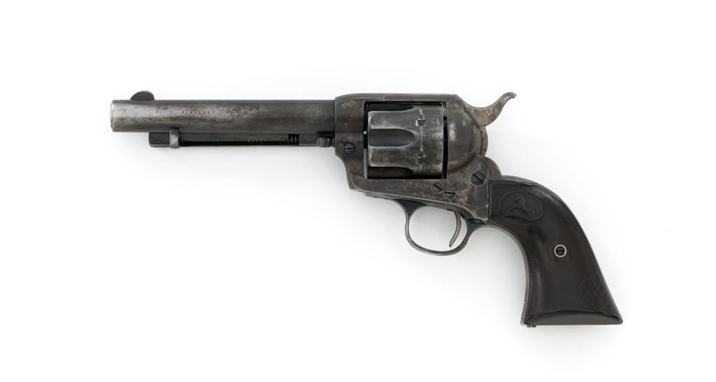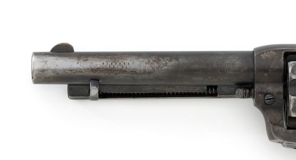 Colt 1st Generation Single Action Army Revolver, #213607, .32 W.C.F. cal., 5.5'' barrel, mottled blue finish with polished hammer, checkered black hard rubber two-piece Colt grips, blade front and fixed ''V''-notch rear sight. Barrel address is marked in one-line ''COLT'S PT. F.A. MFG. CO HARTFORD CT, U.S.A.''. With two-line patent dates and Rampant Colt on lower left side of the frame. Visible numbers on the frame, trigger guard, and backstrap are matching. Inside of the loading gate with assembly number ''177''. Mfg'd 1901. Condition is overall fair, displaying approx. 20% muted blue finish, with the balance gone to a mixture of dark and gray patina; traces of silvered case colors on the frame. There are several small marks on the left side of the barrel that look like tool marks. Factory markings are clear. Grips are worn but complete, showing old hand checkering to the rear bottom of the left grip panel, and their overall condition are consistent with the rest of the revolver. Action is crisp with all four clicks. Bore is very good with defined rifling, and a few spots of minor erosion near the muzzle. Est.: $1,400- $1,800. (C&R/PPT)