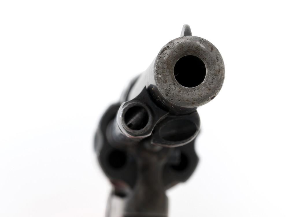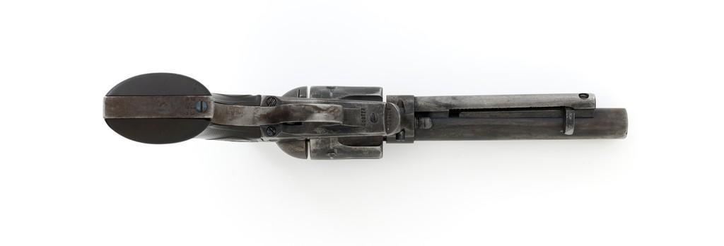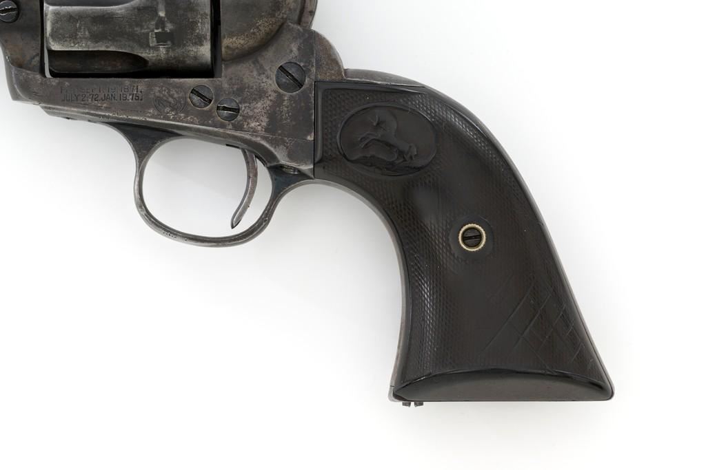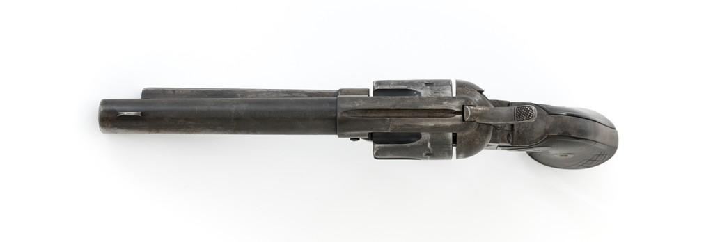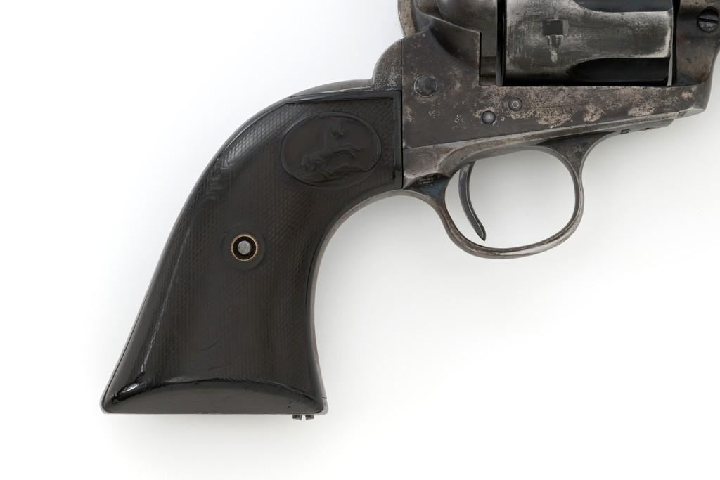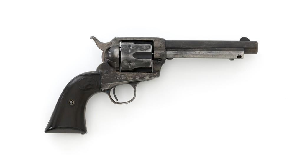 Colt 1st Generation Single Action Army Revolver, #213607, .32 W.C.F. cal., 5.5'' barrel, mottled blue finish with polished hammer, checkered black hard rubber two-piece Colt grips, blade front and fixed ''V''-notch rear sight. Barrel address is marked in one-line ''COLT'S PT. F.A. MFG. CO HARTFORD CT, U.S.A.''. With two-line patent dates and Rampant Colt on lower left side of the frame. Visible numbers on the frame, trigger guard, and backstrap are matching. Inside of the loading gate with assembly number ''177''. Mfg'd 1901. Condition is overall fair, displaying approx. 20% muted blue finish, with the balance gone to a mixture of dark and gray patina; traces of silvered case colors on the frame. There are several small marks on the left side of the barrel that look like tool marks. Factory markings are clear. Grips are worn but complete, showing old hand checkering to the rear bottom of the left grip panel, and their overall condition are consistent with the rest of the revolver. Action is crisp with all four clicks. Bore is very good with defined rifling, and a few spots of minor erosion near the muzzle. Est.: $1,400- $1,800. (C&R/PPT)