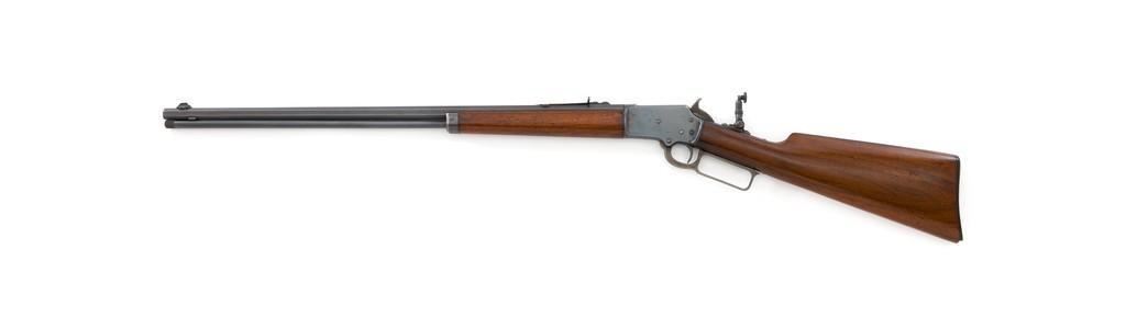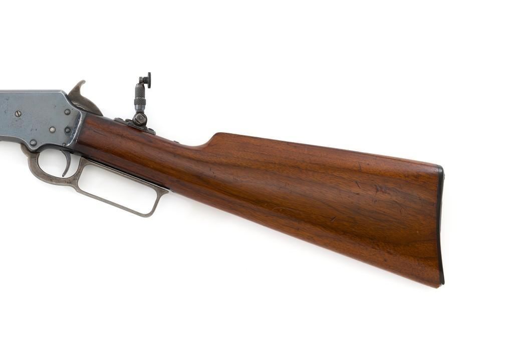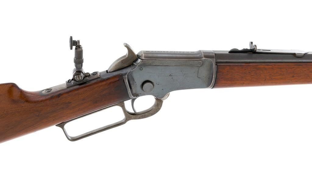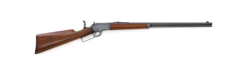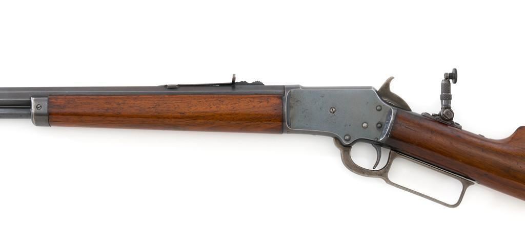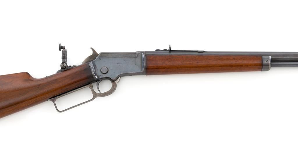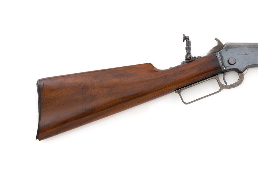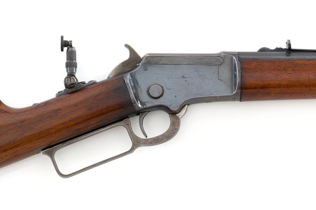 Marlin Model 1892 Lever Action Takedown Rifle, #270573, .22 cal., 24'' octagon barrel, blued with case hardened lever and hammer, straight grip walnut stock and forend, checkered hard rubber Marlin buttplate, dovetailed beaded blade front sight, semi-buckhorn elevator rear sight, and M.S.A. Co. adjustable folding peep sight located at the upper tang. Mfg'd circa 1903. Rifle is in fine condition, displaying approx. 90% blue, showing toning to the barrel, light frosting, and scratches to sides of the receiver. Case colors on the hammer have toned darker; lever is mottled and muted. Factory markings are sharp. Wood retains most of its finish, with small dents and scratches scattered throughout. Action is crisp and functions smoothly. Bore is very good with defined rifling. Right edge of the muzzle face with a moderate impression. Est.: $800-$1,200. (C&R/PPT)