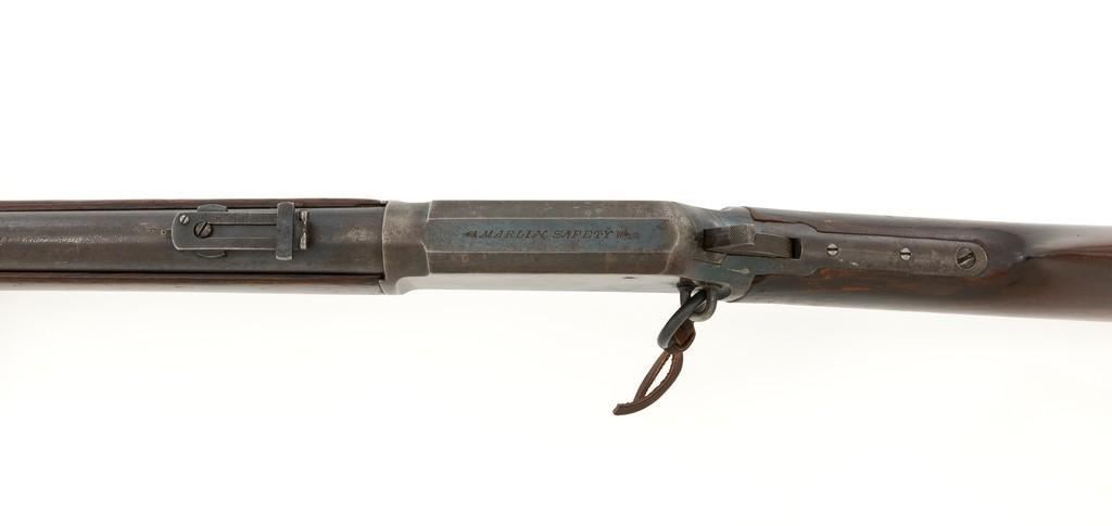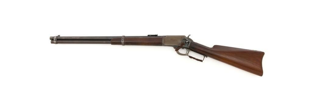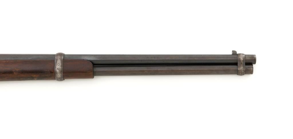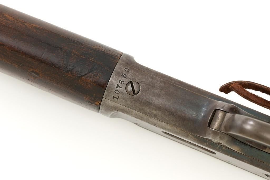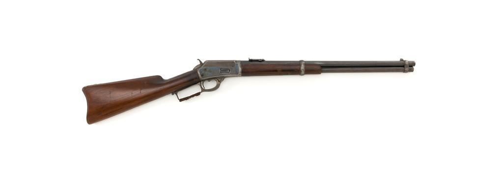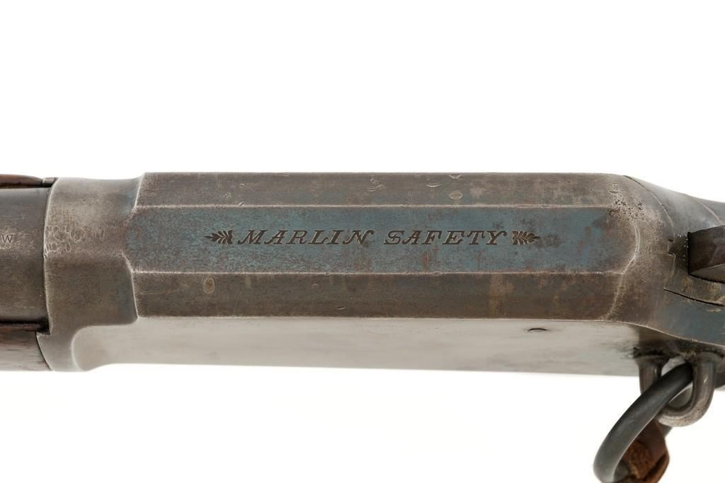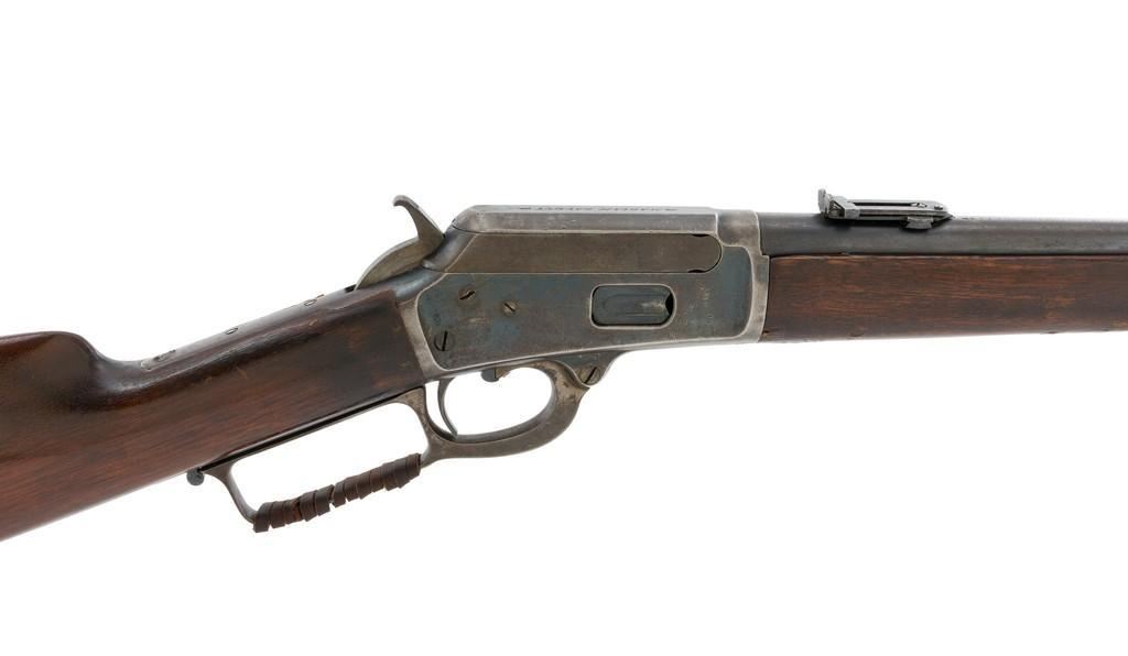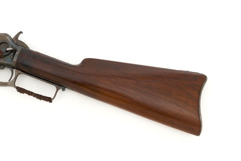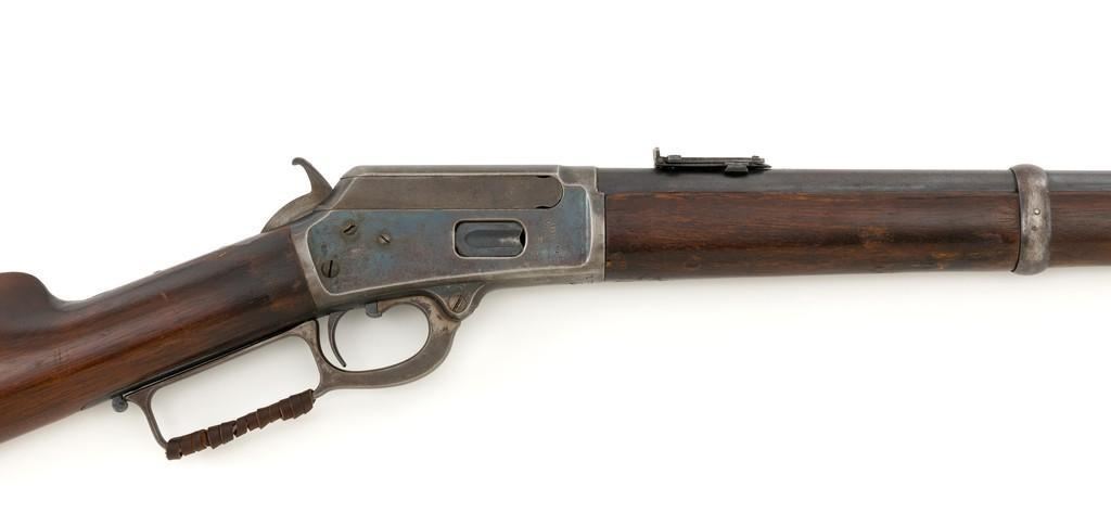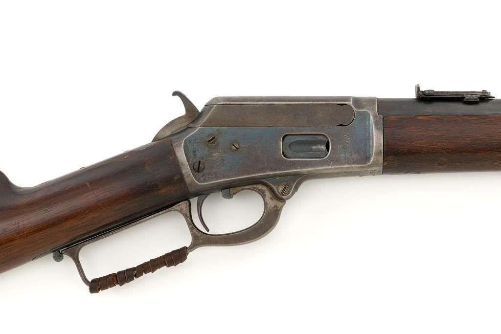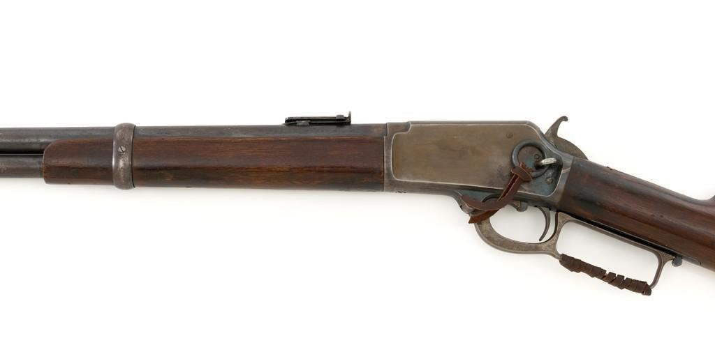 Marlin Model 1889 Lever Action Saddle Ring Carbine, #107650, .44 W.C.F. cal., 20'' round barrel, blue finish, smooth walnut forend and straight grip stock, blued crescent carbine style buttplate, second variation carbine blade front sight, folding adjustable ladder rear sight, saddle ring with leather thong, and leather wrapped lever handle. Factory markings are clear, with sharp barrel address, marked ''MARLIN SAFETY'' on top of the receiver. Mfg'd 1894. Carbine is in good to very good overall condition, retaining approx. 60% blue, showing general wear and toning, light surface erosion and frosting. Receiver shows considerable original finish on the right side, with the left side showing cleaning and traces of finish around the saddle ring stud. There is high point edgewear and knackering on the right side. Hammer and lever show dull, muted case hardening. Tang is drilled and tapped with the holes filled by screws. Stock is in good condition with indentations, showing cleaning and old coat of varnish added. There is also a small amount of wood filler visible along the left side of the upper tang. Action functions well and locks up securely. Bore is good with light to moderate erosion, and well-defined rifling. With factory letter Est.: $1,000-$1,500. (Antique)