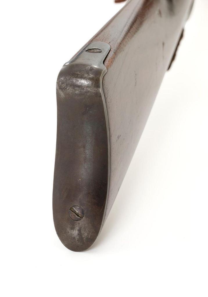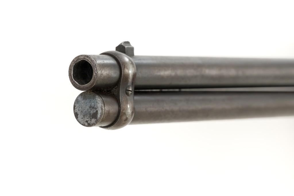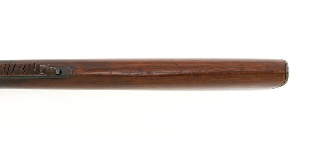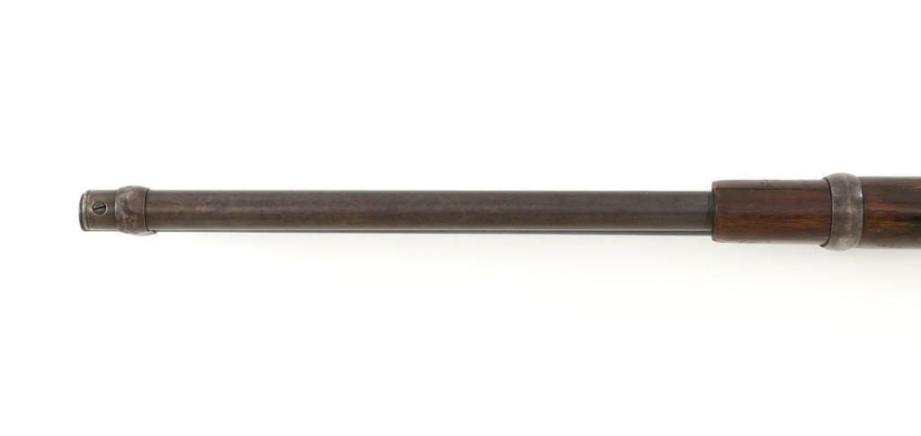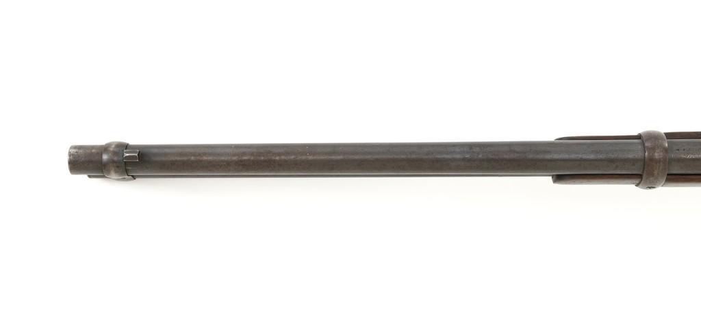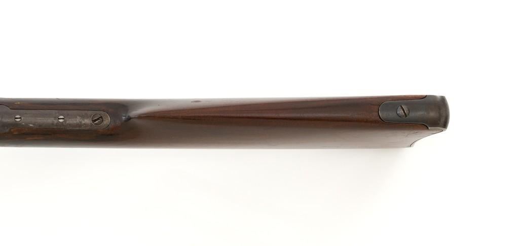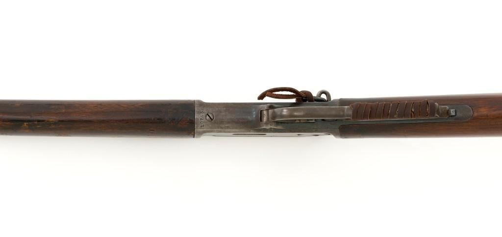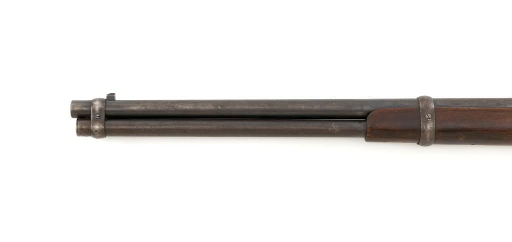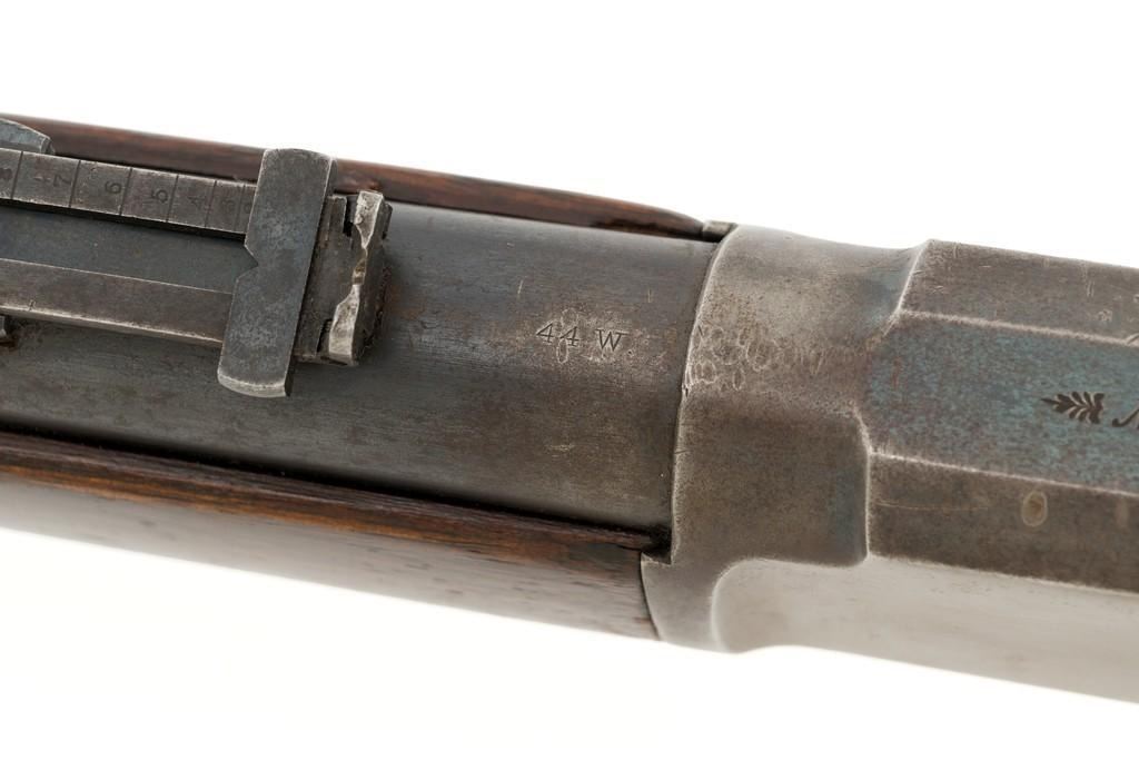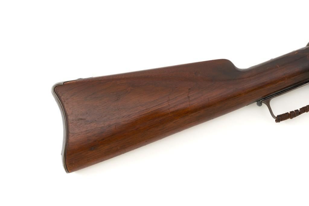 Marlin Model 1889 Lever Action Saddle Ring Carbine, #107650, .44 W.C.F. cal., 20'' round barrel, blue finish, smooth walnut forend and straight grip stock, blued crescent carbine style buttplate, second variation carbine blade front sight, folding adjustable ladder rear sight, saddle ring with leather thong, and leather wrapped lever handle. Factory markings are clear, with sharp barrel address, marked ''MARLIN SAFETY'' on top of the receiver. Mfg'd 1894. Carbine is in good to very good overall condition, retaining approx. 60% blue, showing general wear and toning, light surface erosion and frosting. Receiver shows considerable original finish on the right side, with the left side showing cleaning and traces of finish around the saddle ring stud. There is high point edgewear and knackering on the right side. Hammer and lever show dull, muted case hardening. Tang is drilled and tapped with the holes filled by screws. Stock is in good condition with indentations, showing cleaning and old coat of varnish added. There is also a small amount of wood filler visible along the left side of the upper tang. Action functions well and locks up securely. Bore is good with light to moderate erosion, and well-defined rifling. With factory letter Est.: $1,000-$1,500. (Antique)