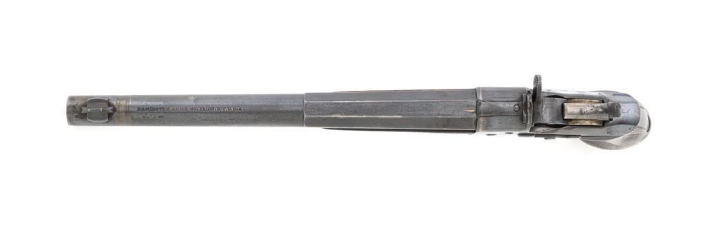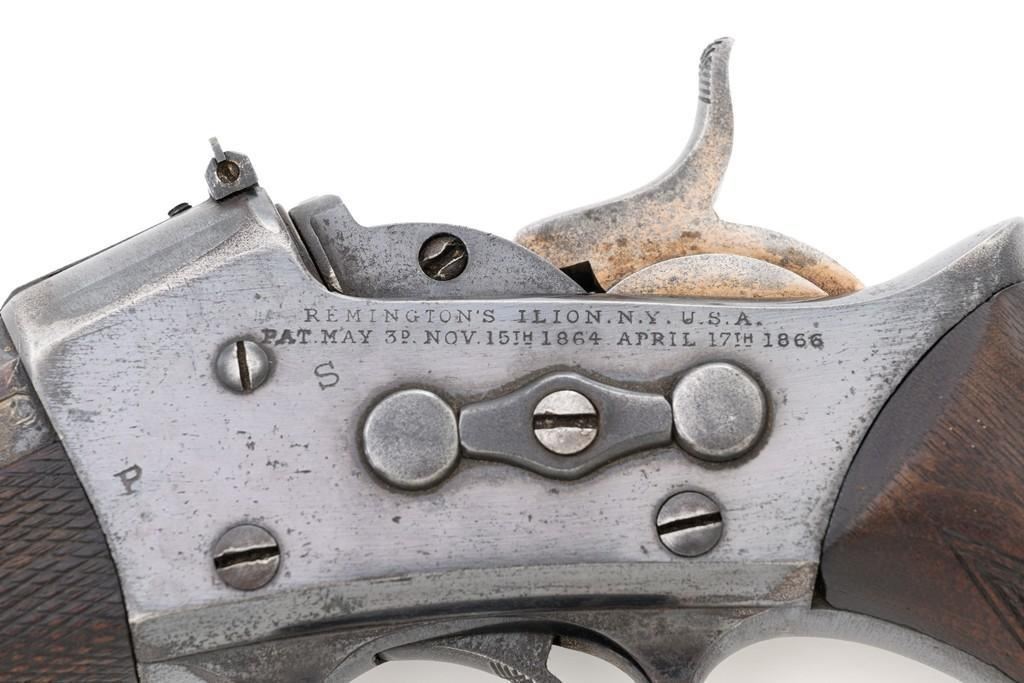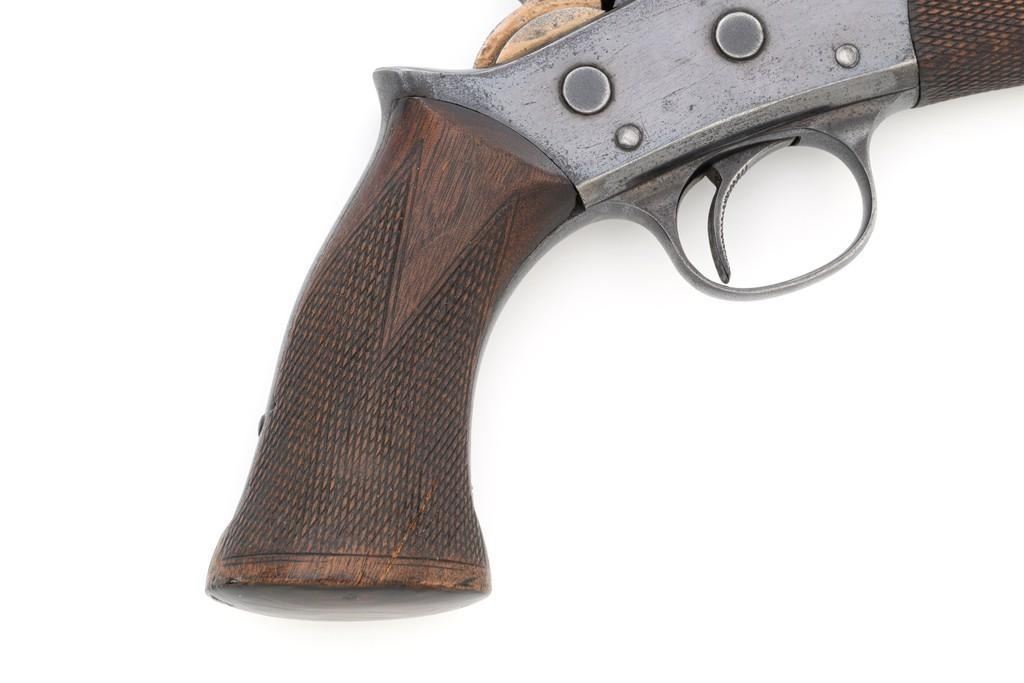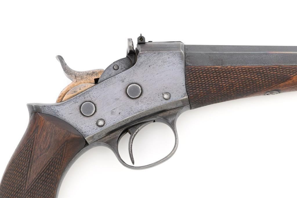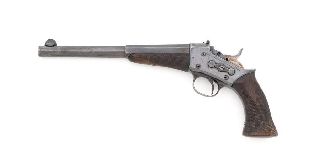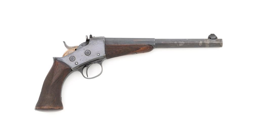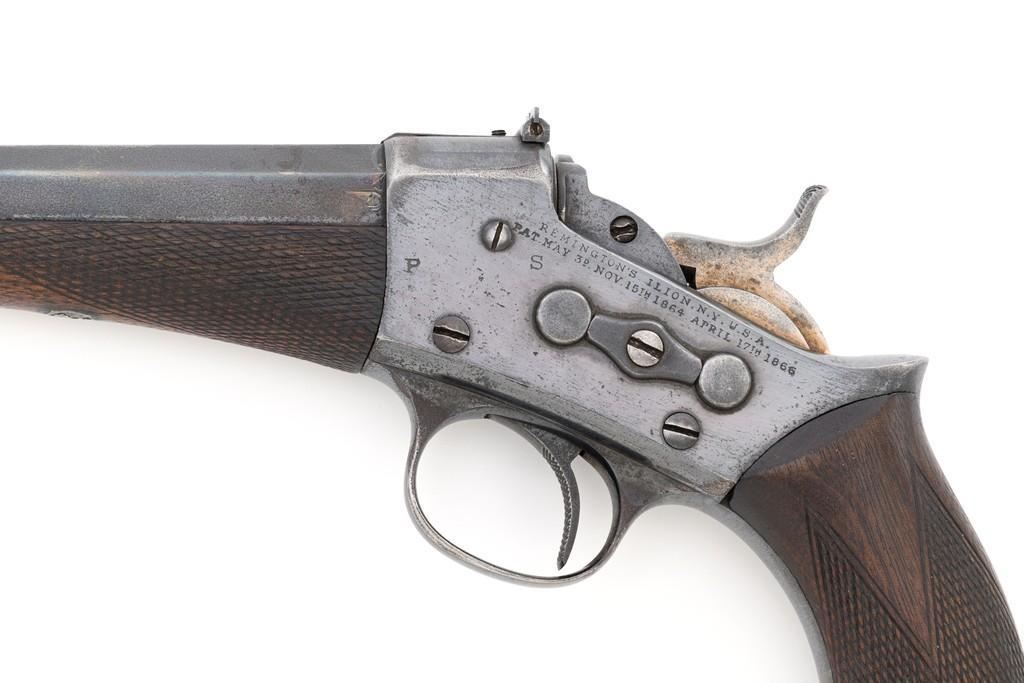Target Modified Remington Model 1871 Rolling Block Pistol, #2039, .22 LR caliber, 10'' half-round/half-octagon sleeved barrel, blued finish, checkered hardwood one-piece walnut grip and forend, modern brass beaded blade front sight, and ''U''-notched rear sight cut into the top of the frame, with a checkered trigger, and extractor. There are a ''P'' and ''S'' inspector's markings on the left side of the frame and it is marked in two-lines with makers information and ''April 17th 1866'' last patent date. Underside of the barrel is marked ''.22 LR''. Top of the barrel, behind the front sight is marked ''REMINGTON ARMS CO. ILLION, N.Y. U.S.A.'' Inside of the grip with matching ''2039'', forend is marked ''30'', and ''1107'' on the barrel . Matching assembly numbers on left side of the grip straps. Pistol is in good to very good overall condition, retaining approx. 70% thinning and toning blue; matte reblued finish on the barrel was applied over mild pitting. There is more noticeable wear on and around the front sight. Factory lettering and inspector's marks are clear. Grip and forend are very good, showing moderate age and handling wear, most noticeable on the lower power of the right side grip. Action is crisp and functions smoothly. Bore is bright with very good rifling. Est.: $700-$1,000. (Antique)(Michael Strietbeck Collection)