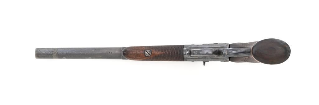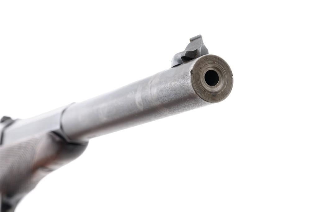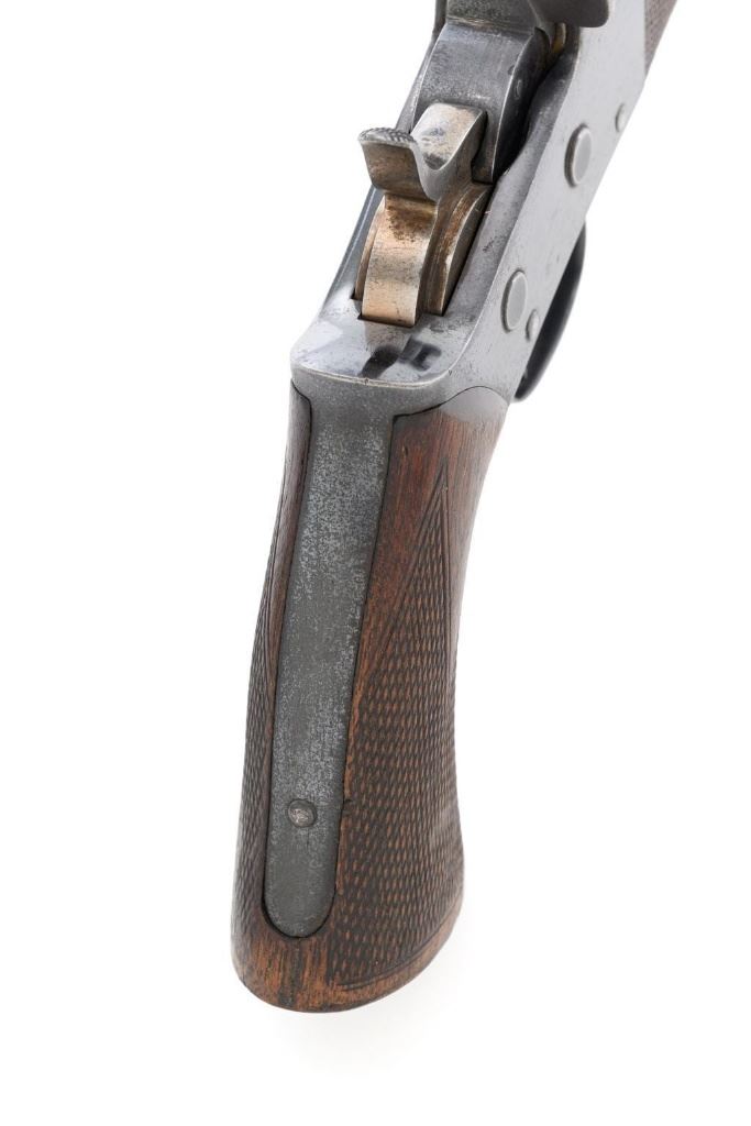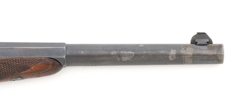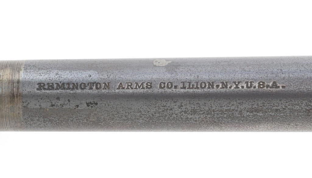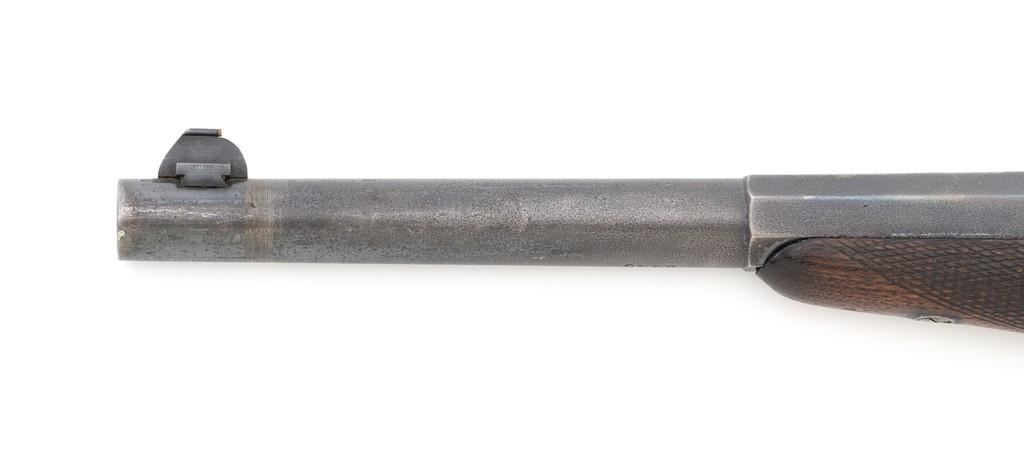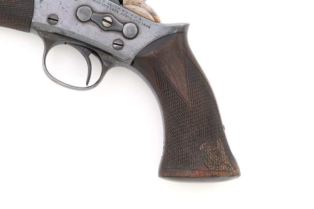 Target Modified Remington Model 1871 Rolling Block Pistol, #2039, .22 LR caliber, 10'' half-round/half-octagon sleeved barrel, blued finish, checkered hardwood one-piece walnut grip and forend, modern brass beaded blade front sight, and ''U''-notched rear sight cut into the top of the frame, with a checkered trigger, and extractor. There are a ''P'' and ''S'' inspector's markings on the left side of the frame and it is marked in two-lines with makers information and ''April 17th 1866'' last patent date. Underside of the barrel is marked ''.22 LR''. Top of the barrel, behind the front sight is marked ''REMINGTON ARMS CO. ILLION, N.Y. U.S.A.'' Inside of the grip with matching ''2039'', forend is marked ''30'', and ''1107'' on the barrel . Matching assembly numbers on left side of the grip straps. Pistol is in good to very good overall condition, retaining approx. 70% thinning and toning blue; matte reblued finish on the barrel was applied over mild pitting. There is more noticeable wear on and around the front sight. Factory lettering and inspector's marks are clear. Grip and forend are very good, showing moderate age and handling wear, most noticeable on the lower power of the right side grip. Action is crisp and functions smoothly. Bore is bright with very good rifling. Est.: $700-$1,000. (Antique)(Michael Strietbeck Collection)
