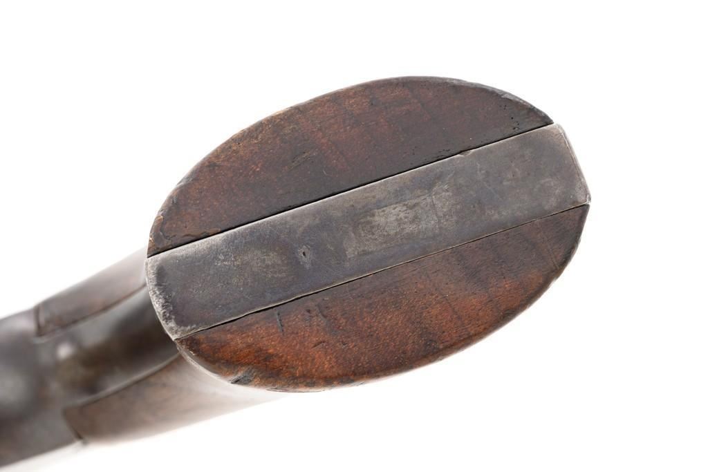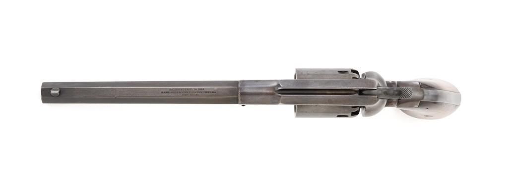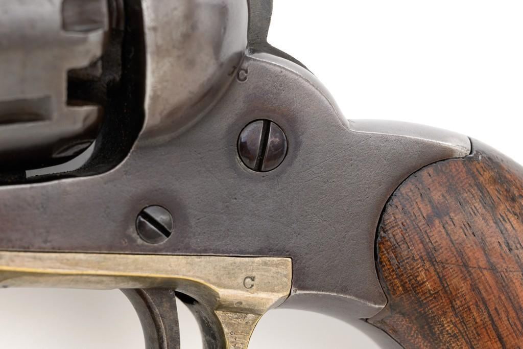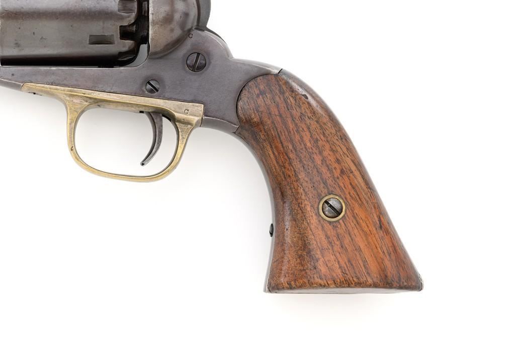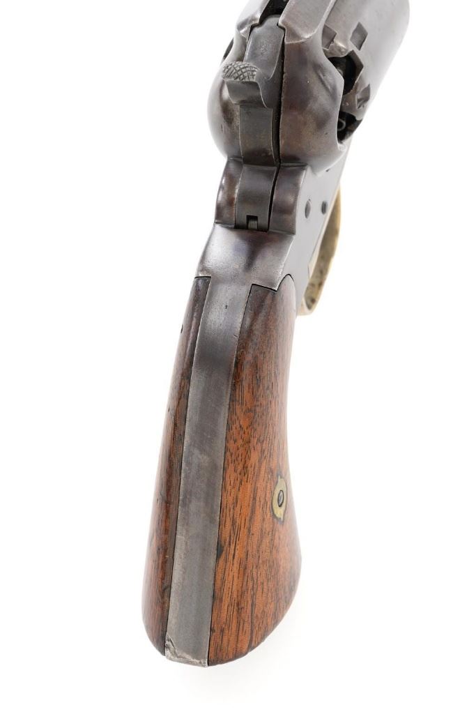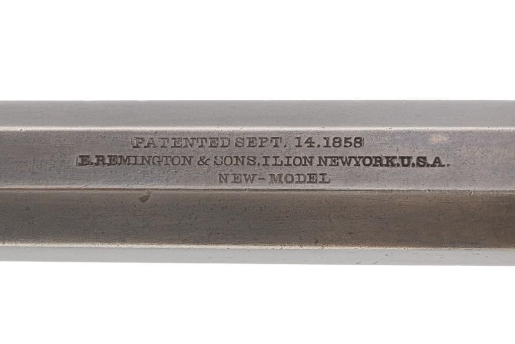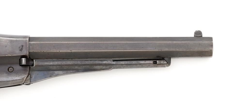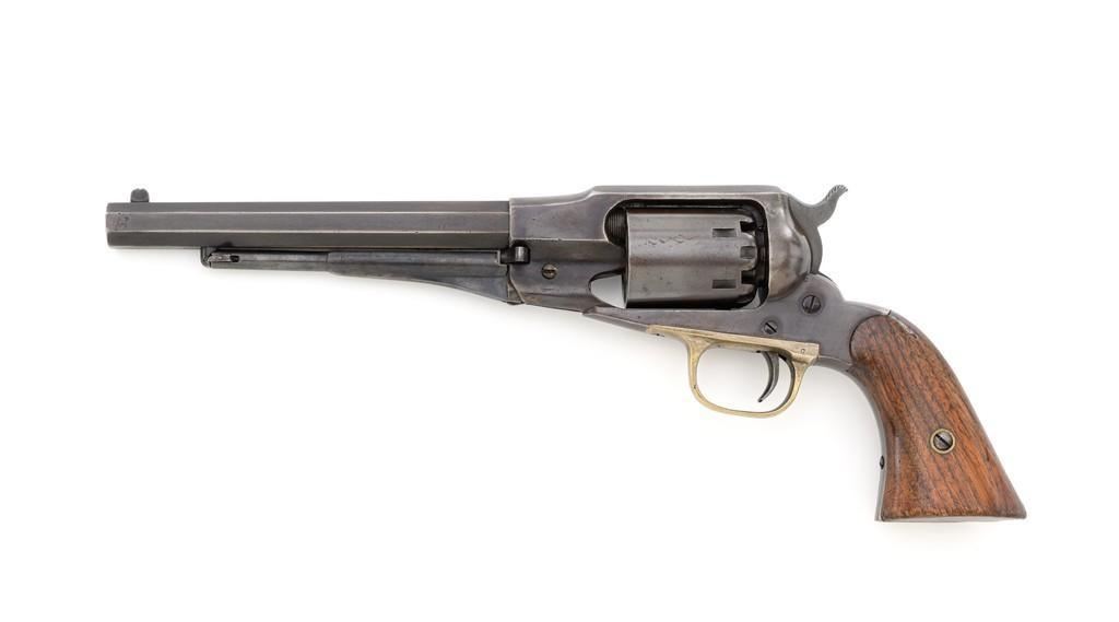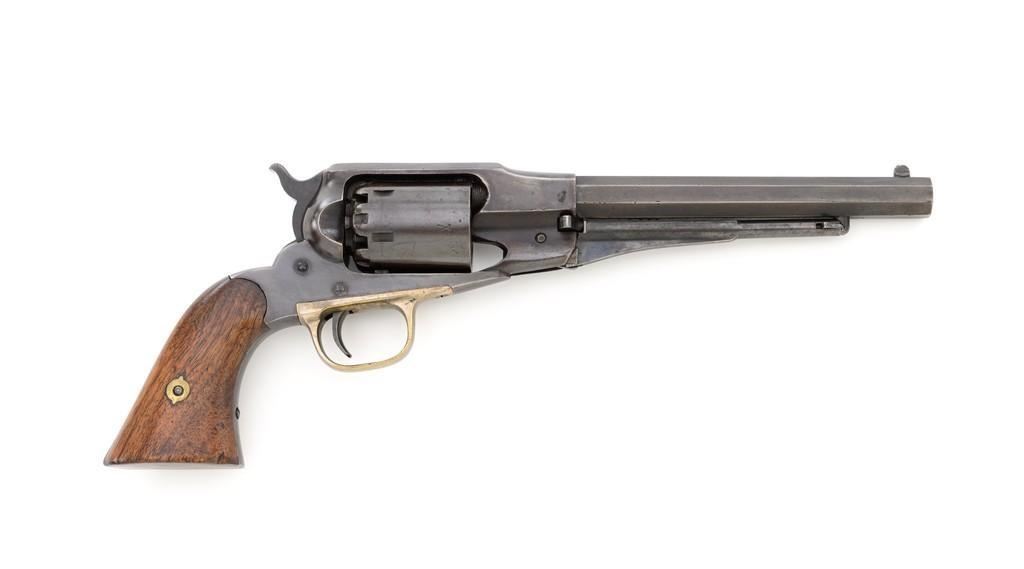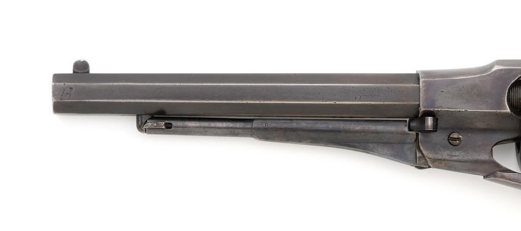 Remington New Model Navy Single Action Percussion Revolver, #33467, .36 cal., 7-3/8'' octagon barrel, blued finish, smooth walnut two-piece grips, ''pinched'' blade front sight, and fixed rear sight. Barrel is marked in three-lines ''PATENTED SEPT. 14, 1858/E. REMINGTON & SONS. ILION NEW YORK, U.S.A./NEW-MODEL''. Matching numbers on left side of the grip frame and underside of the barrel. Overall condition is good, retaining a considerable amount of an old toning reblued finish, balance with dark brown patina, scattered small impressions and marks from age and use. Trigger guard has been lightly cleaned. Barrel address is crisp. Grips with scattered impressions, particularly along the bottom edges. Strong action; crisp and cycles smoothly. Bore with general moderate erosion; rifling is well-defined. Est.: $700-$900. (Antique) (Michael Strietbeck Collection)