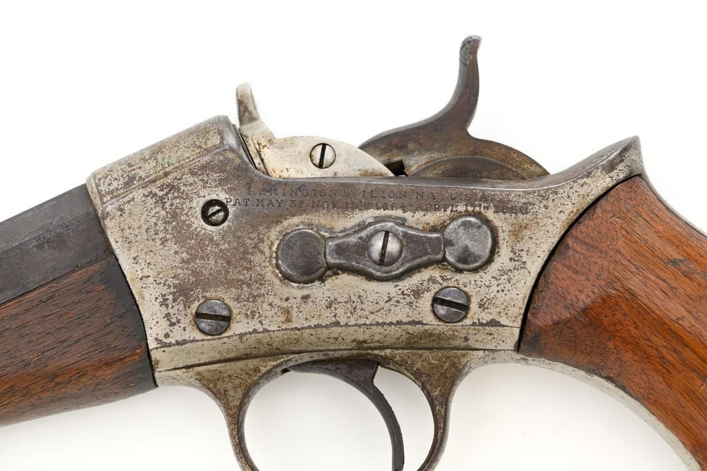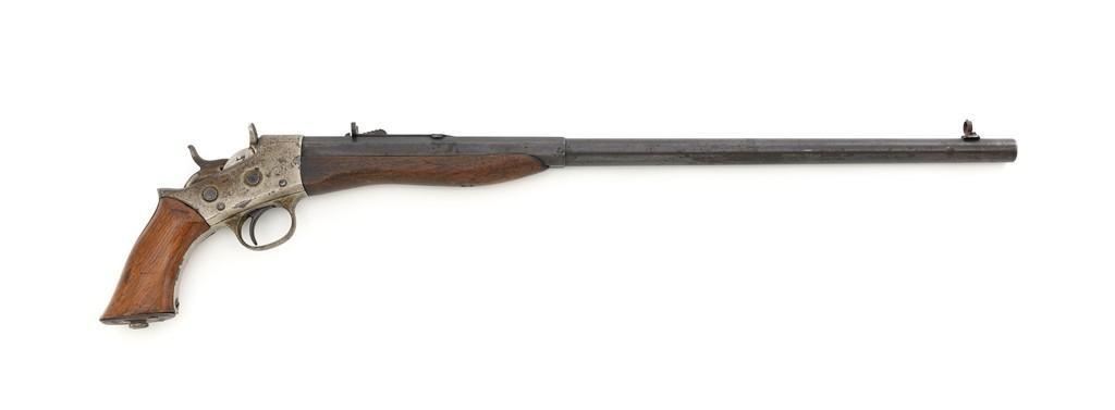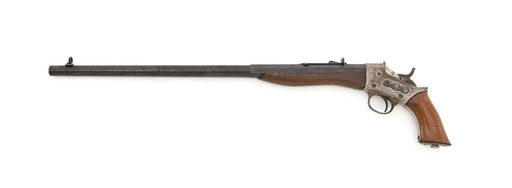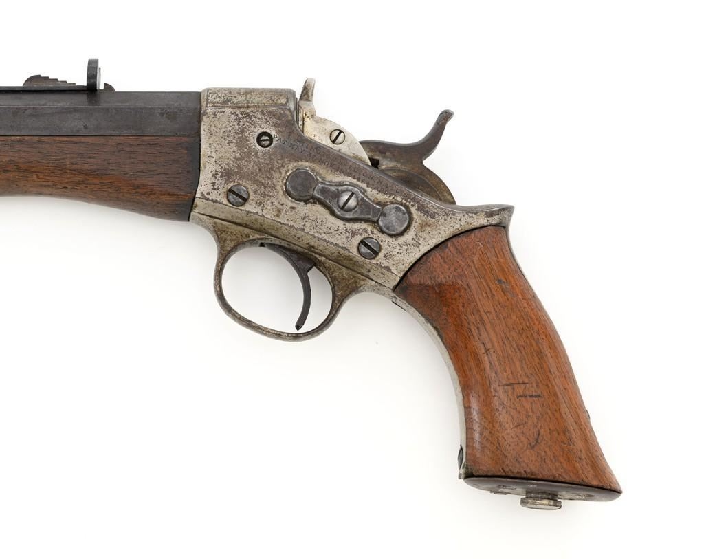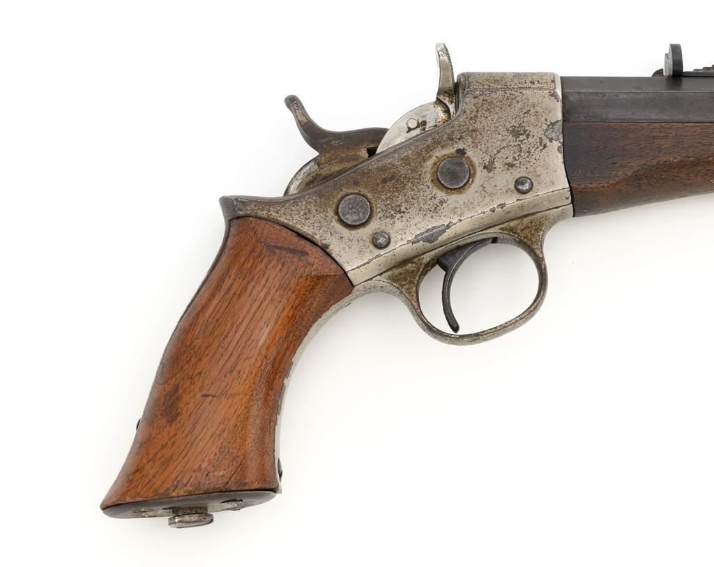 Remington Model 1871 Rolling Block Pistol, #291, .32 RF cal., 20.75'' half-round/half-octagon barrel, blued with nickel frame, smooth one-piece walnut grip, folding Beach type combination front sight, and semi-buckhorn rear sight with elevator. The bottom of the grip has been modified and a metal plate with threaded stud has been added, perhaps for a shoulder stock attachment and conversion into a ''buggy'' type rifle or for hunting and target shooting. Barrel has no address or serial number. Left side of the frame is marked in two-lines with makers information and ''April 17th 1866'' last patent date. Grip is numbered but does not match. This unique pistol is in very good condition. Barrel displays a combination of toning blue finish mixed with general brown patina and spots of moderate rust patina. Approx. 70% thinning and flaking nickel finish remains. Factory markings are clear. Grips with several scattered old dents and scratches from use. The spring tension on the added plate has caused some separation at the bottom of the grip and one of the screws is stripped. Action is crisp and functions smoothly. Bore is good and remains bright with intermittent light erosion and defined rifling. Est.: $700-$900. (Antique)(Michael Strietbeck Collection)