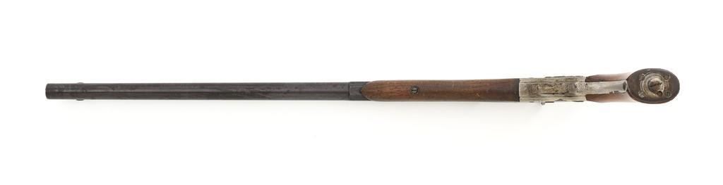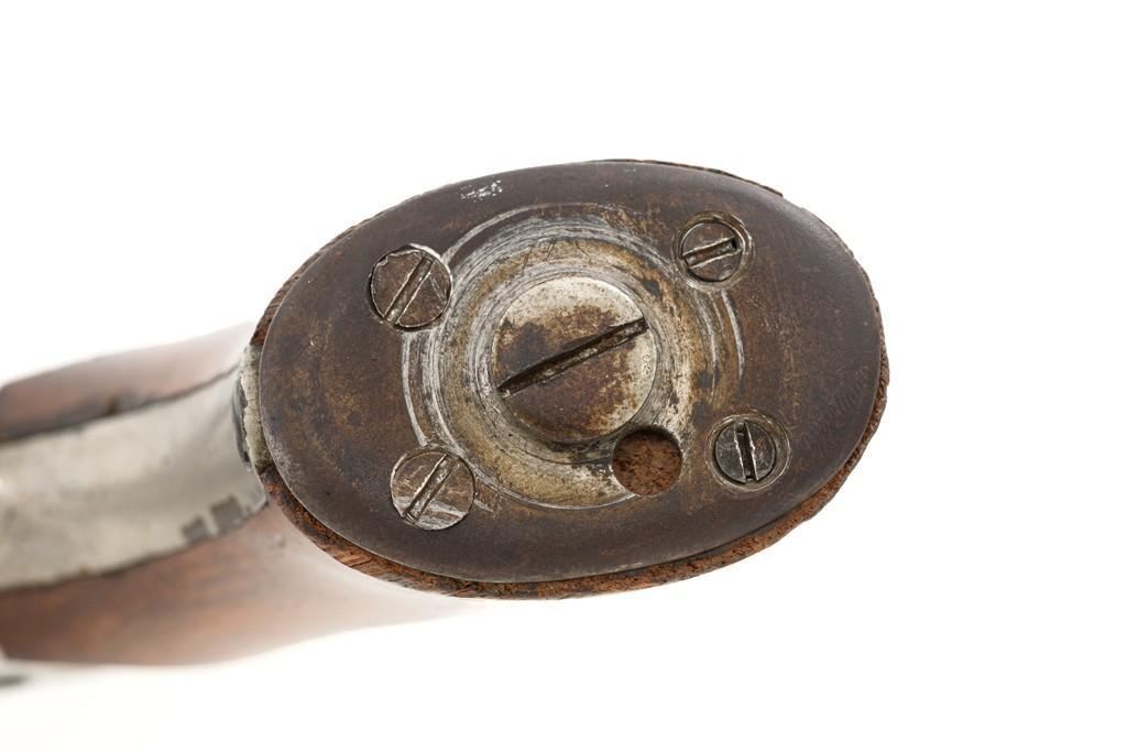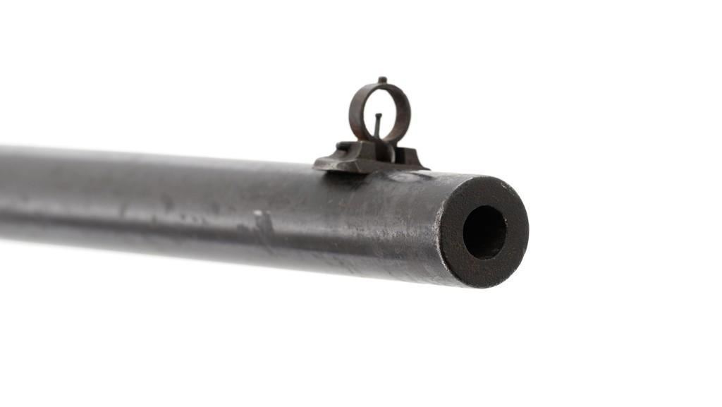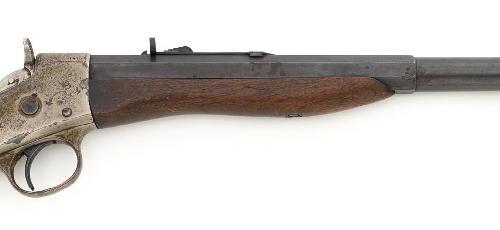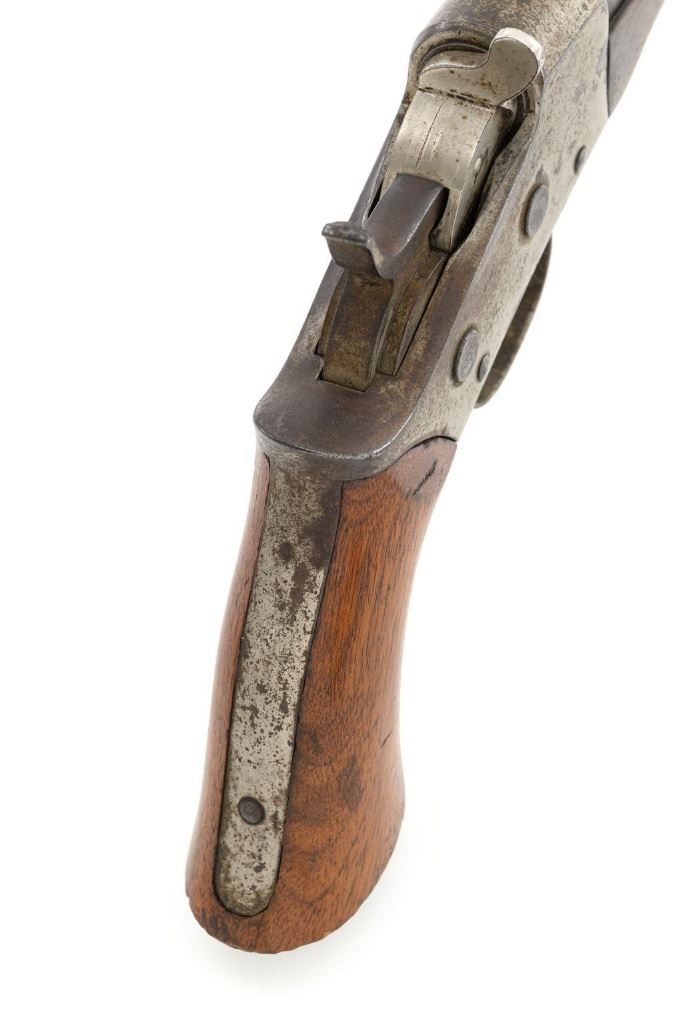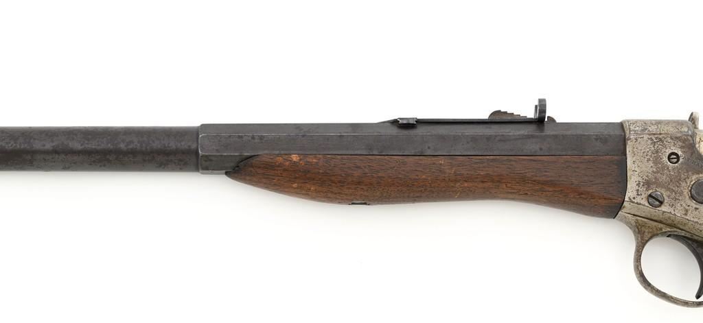 Remington Model 1871 Rolling Block Pistol, #291, .32 RF cal., 20.75'' half-round/half-octagon barrel, blued with nickel frame, smooth one-piece walnut grip, folding Beach type combination front sight, and semi-buckhorn rear sight with elevator. The bottom of the grip has been modified and a metal plate with threaded stud has been added, perhaps for a shoulder stock attachment and conversion into a ''buggy'' type rifle or for hunting and target shooting. Barrel has no address or serial number. Left side of the frame is marked in two-lines with makers information and ''April 17th 1866'' last patent date. Grip is numbered but does not match. This unique pistol is in very good condition. Barrel displays a combination of toning blue finish mixed with general brown patina and spots of moderate rust patina. Approx. 70% thinning and flaking nickel finish remains. Factory markings are clear. Grips with several scattered old dents and scratches from use. The spring tension on the added plate has caused some separation at the bottom of the grip and one of the screws is stripped. Action is crisp and functions smoothly. Bore is good and remains bright with intermittent light erosion and defined rifling. Est.: $700-$900. (Antique)(Michael Strietbeck Collection)