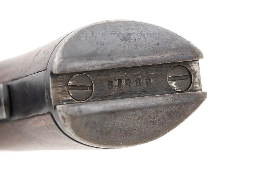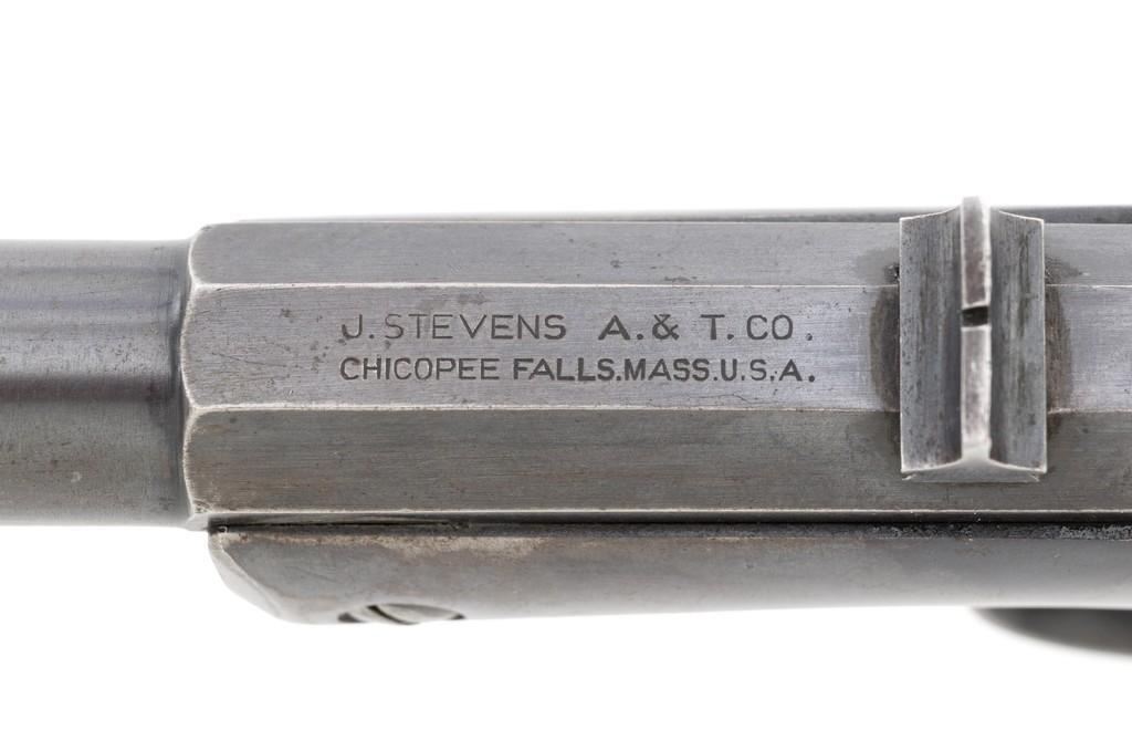J. Stevens No. 40-1/2 New Model Single Shot Pocket Rifle with Matching Shoulder Stock, #51288, .22 LR cal., 12'' barrel, full blued finish, smooth hardwood grips, flip-up Beach front sight, fixed rear sight, and Vernier peep tang on the backstrap. Includes the skeleton shoulder stock and attaching screw. Barrel address is marked in two-lines ''J. STEVENS A. & T. CO./CHICOPEE FALLS, MASS. U.S.A.''. There is also a small ''I'' within a circle stamped on bottom of the frame. Visible matching numbers on the frame, barrel, and shoulder stock. It is estimated that approx. 2,500 were manufactured circa 1896-1915. Overall condition is very good, retaining approx. 65% toning blue finish, showing wear particularly along the barrel and front of the frame. Barrel address is clear. Grips with intermittent dents and handling marks, largest are on the left side. Action is crisp and operates smoothly. Bore is mostly bright with well-defined rifling. The accompanying skeleton shoulder stock is in fine condition, showing some areas of moderate toning. Est.: $700-$900. (C&R/PPT) (Michael Strietbeck Collection)