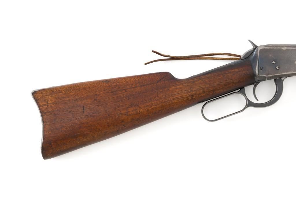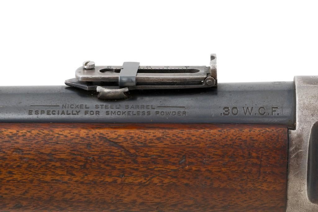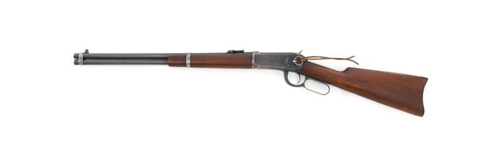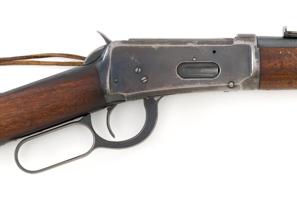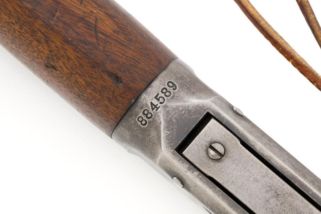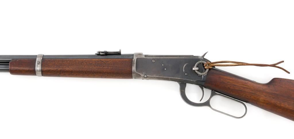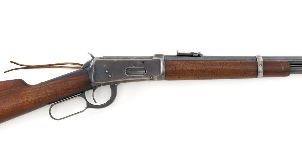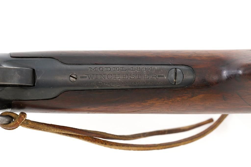 Winchester Model 1894 Lever Action Saddle Ring Carbine, #884589, .30 WCF cal., 20'' round barrel, blue finish, smooth walnut straight grip stock and forend, smooth steel crescent buttplate, pinned blade front and ladder style rear sight, and saddle ring with leather tie. Factory markings are clear, with Winchester ''WP'' proofs on the barrel and receiver. Mfg'd 1919. Carbine is in fine overall condition, retaining 88%-90% thinning factory finish, with scratches and scuffs along the barrel and magazine, light surface erosion, and high point edgewear on the receiver. There is typical wear around the saddle ring. Stock is very good, with scattered indentations and scratches, worse on the left side of the buttstock. Wood to metal fit is very good. Action functions well and locks up securely. Bore is good with scattered light to moderate erosion and defined rifling. Est.: $800-$1,200. (C&R/PPT)
