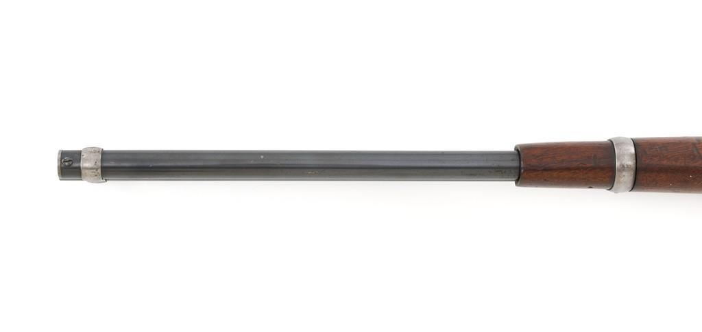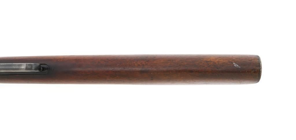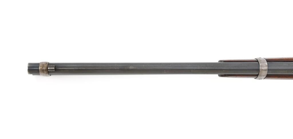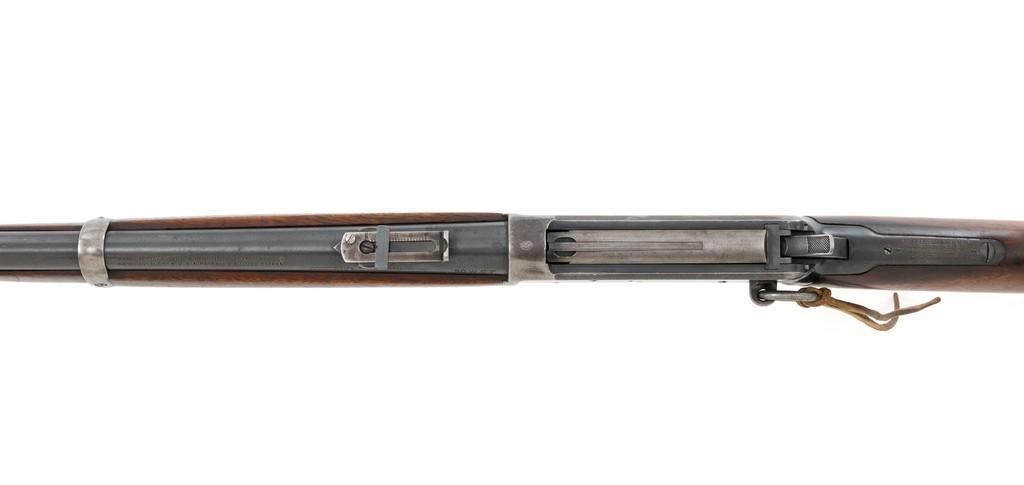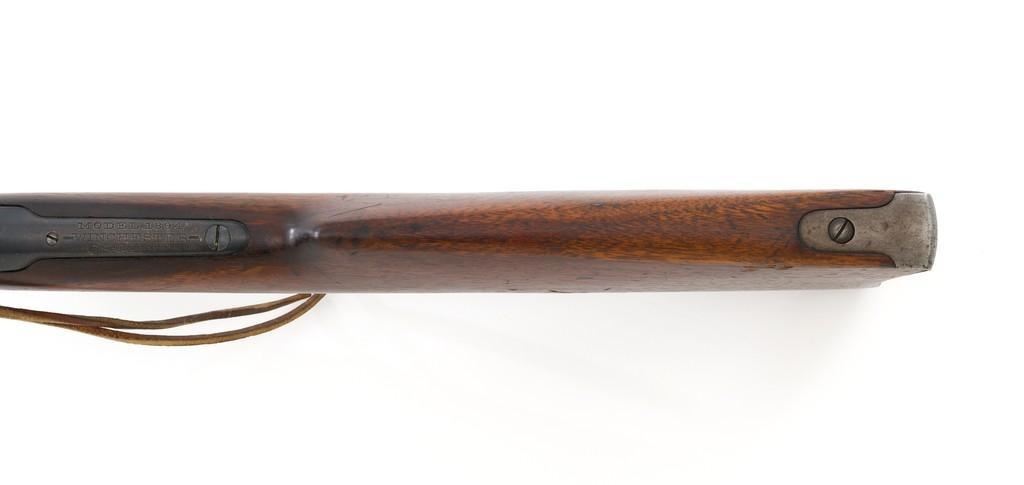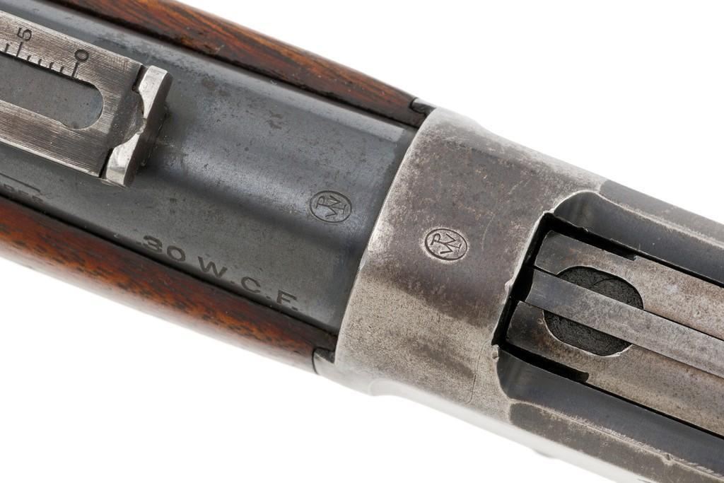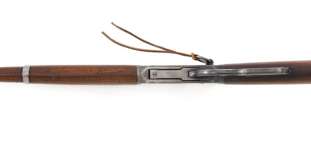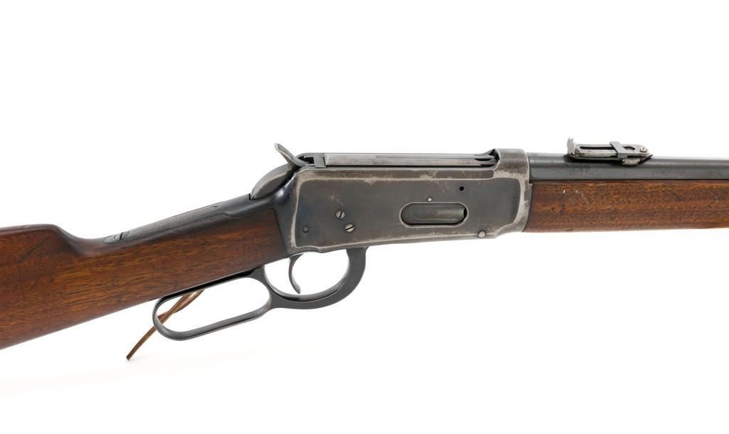 Winchester Model 1894 Lever Action Saddle Ring Carbine, #884589, .30 WCF cal., 20'' round barrel, blue finish, smooth walnut straight grip stock and forend, smooth steel crescent buttplate, pinned blade front and ladder style rear sight, and saddle ring with leather tie. Factory markings are clear, with Winchester ''WP'' proofs on the barrel and receiver. Mfg'd 1919. Carbine is in fine overall condition, retaining 88%-90% thinning factory finish, with scratches and scuffs along the barrel and magazine, light surface erosion, and high point edgewear on the receiver. There is typical wear around the saddle ring. Stock is very good, with scattered indentations and scratches, worse on the left side of the buttstock. Wood to metal fit is very good. Action functions well and locks up securely. Bore is good with scattered light to moderate erosion and defined rifling. Est.: $800-$1,200. (C&R/PPT)