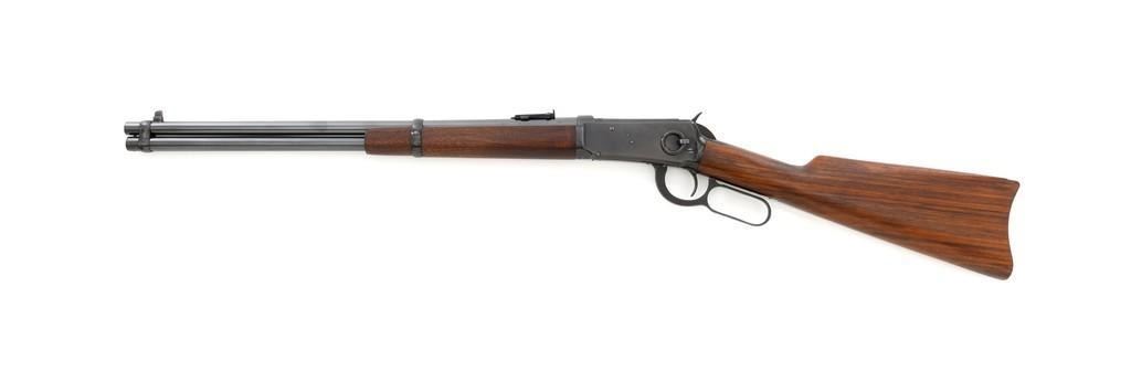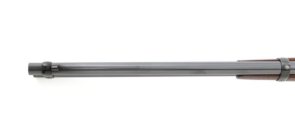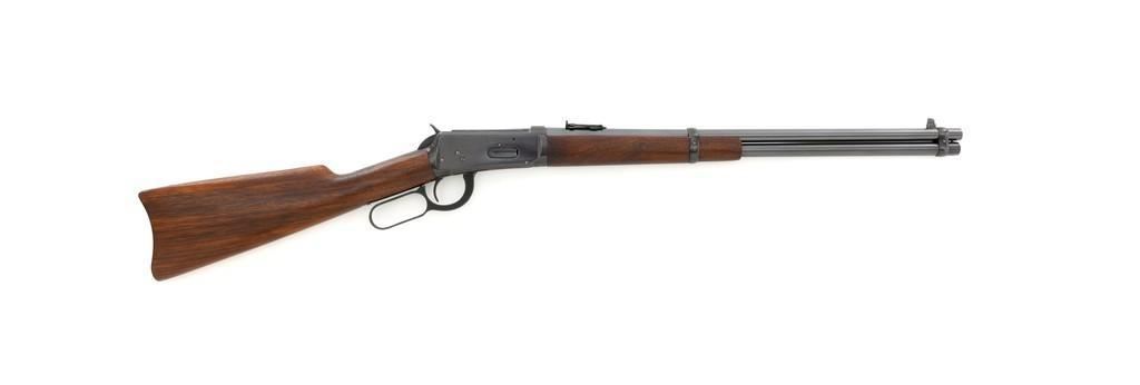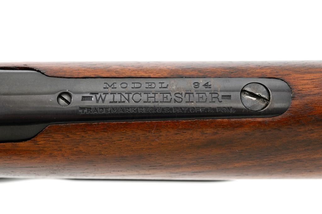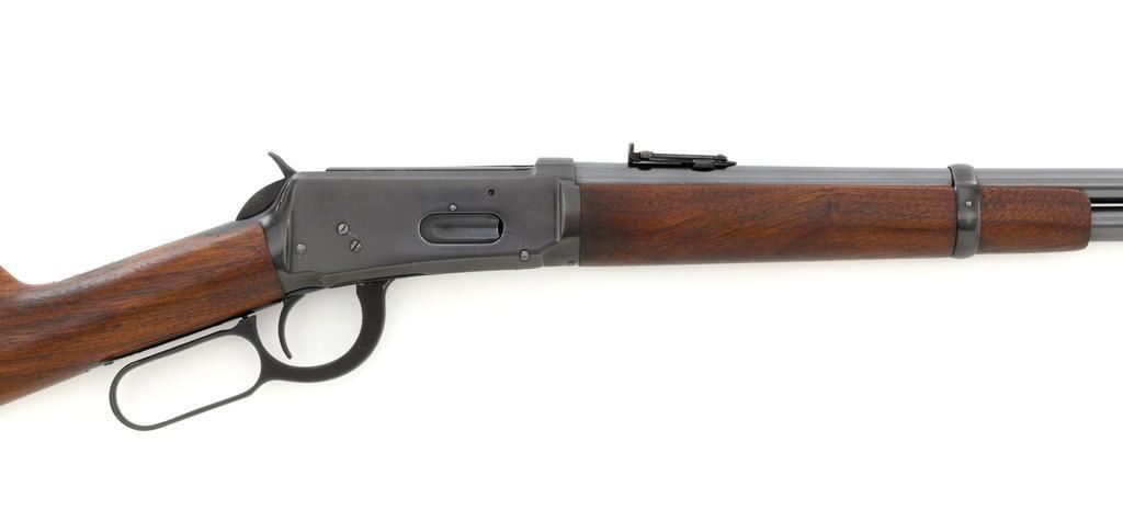 Winchester Model 1894 Lever Action Saddle Ring Carbine, #922436, .30-30 W.C.F. cal., 20'' round barrel, blued finish, straight grip hardwood stock and forend, crescent steel buttplate, saddle ring, pinned blade front sight, and folding carbine ladder rear sight.Mfg'd 1920. Carbine is in excellent condition. Barrel and receiver retain approx. 97% deep blue finish, showing a few small spots of flaking near the receiver and upper tang. Factory markings and Winchester proof marks on both the barrel and receiver are sharp. Barrel address along the left side is a little soft. Buttplate shows thinning and mild patina on the lower half. Wood with beautiful grain patterns in the buttstock, which also has a few minor handling marks, finish is strong. Wood to metal fit is excellent. Action is crisp and functions smoothly. Bore rates excellent and is bright throughout with well-defined rifling. Est.: $1,500-$2,000. (C&R/PPT)