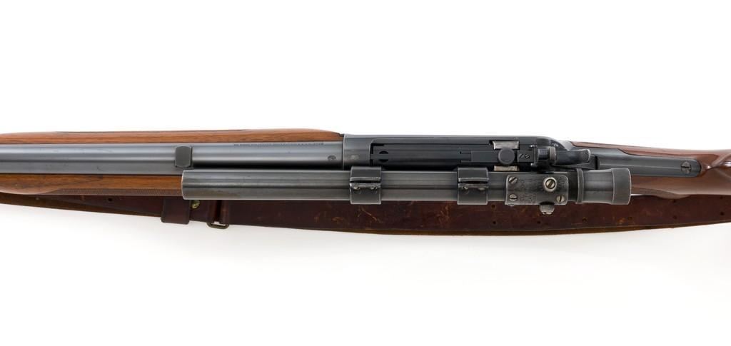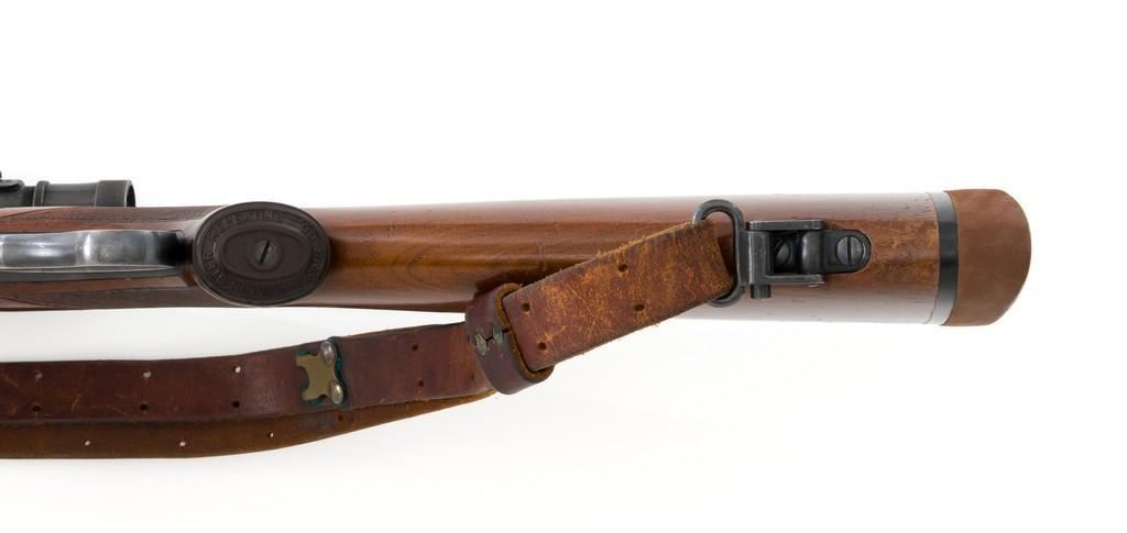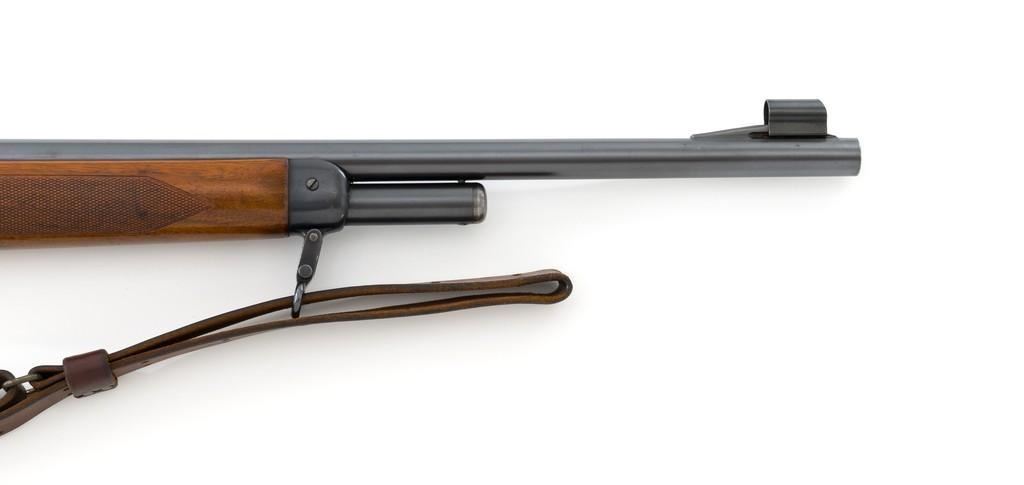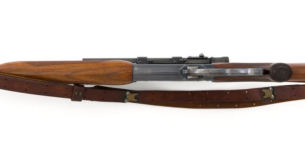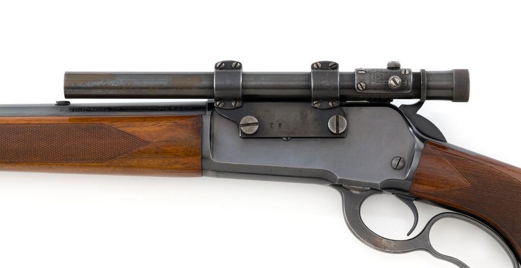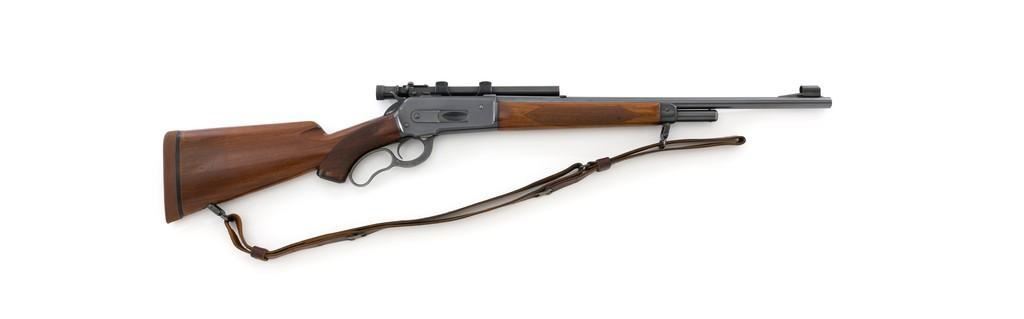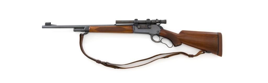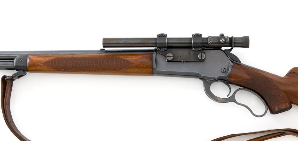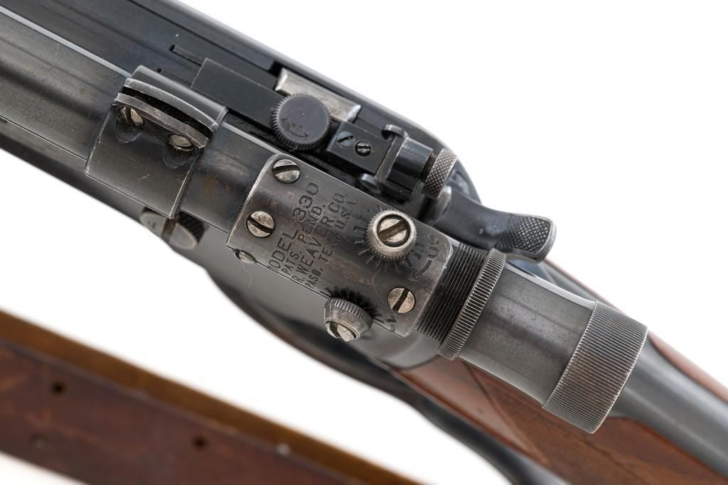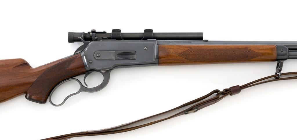 Deluxe Winchester Model 71 Lever Action Carbine, #13933, .348 Win. cal., 20'' barrel with 3/4-magazine; checkered walnut pistol grip stock and forend with super grade sling swivels, Winchester hard rubber grip cap, period military style leather rifle sling, ending with a Decelerator pad, providing a 13-1/8'' LOP to end of pad; 12.1'' to end of wood. Hooded ramped brass tipped blade front sight, rear sight removed and filled with dovetailed sight blank, and bolt peep sight. Early features include long tang, uncrowned muzzle face that is in the white, checkered hammer, Winchester marked grip cap, early type barrel address, receiver was not drilled and tapped when it left the factory. Markings are clear with Winchester ''WP'' proof on the barrel and receiver at the breech. Topped with a Weaver T-6 side mount, rings, and an El Paso Weaver Model 330 fixed power rifle scope with blue finish, post and fine crosshair reticle. Left side of the scope tube shows finish loss and discoloration; optics are clear. Mfg'd 1937. Rifle is in very good overall condition, show signs of age and field use, retaining approx. 90% thinning finish with light wear at the muzzle, scratches, and minor marks along the barrel and magazine. Receiver shows high point edge wear, some light scratches, and worn finish on the underside and on the lever. Sides of the receiver with general mild pin prick blemishes and specks of oxidation. Stock with general dents, scratches, and some flattening of the checkering pattern; length of pull has been shortened to accommodate the thick recoil pad. Action functions smoothly and locks up securely. Bore rates near excellent overall and is bright throughout with well-defined rifling. Est.: $1,500-$2,000. (C&R/PPT)