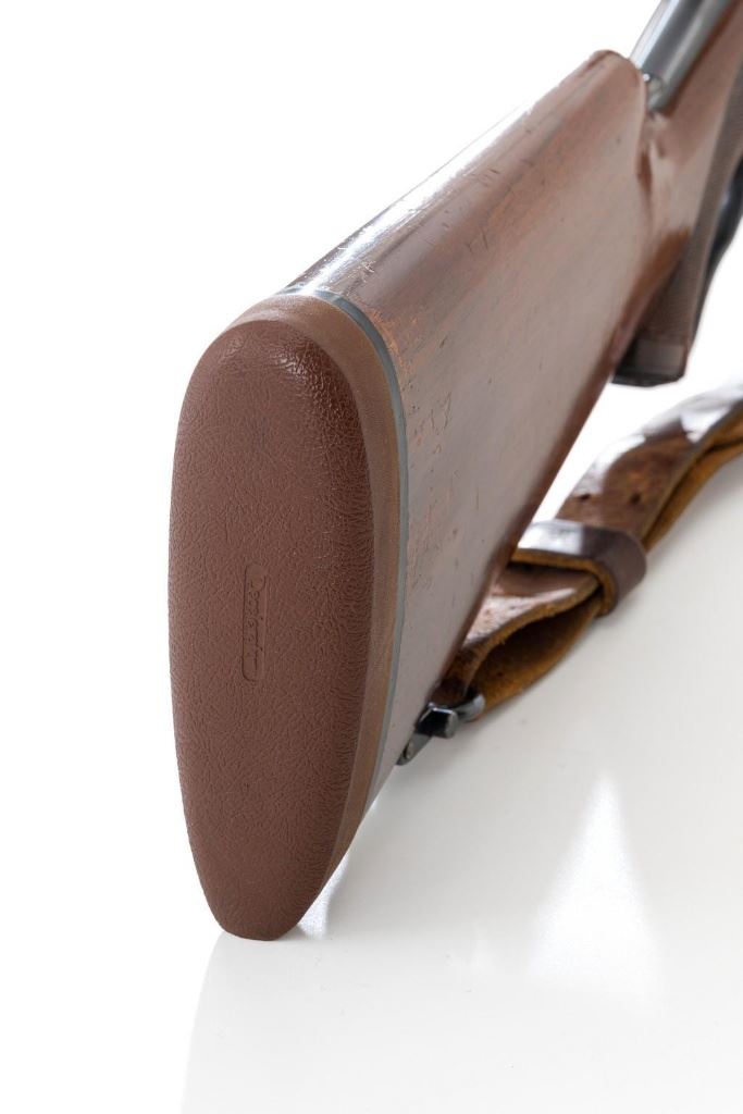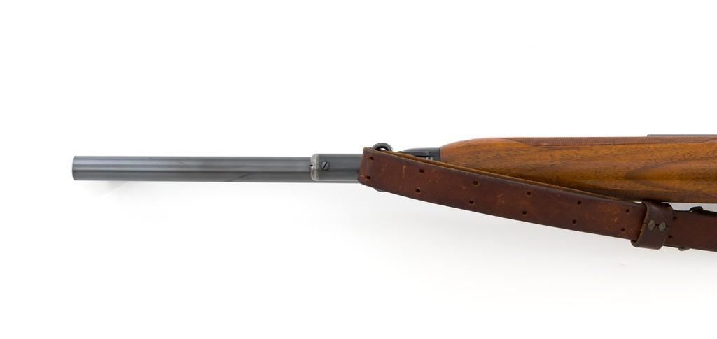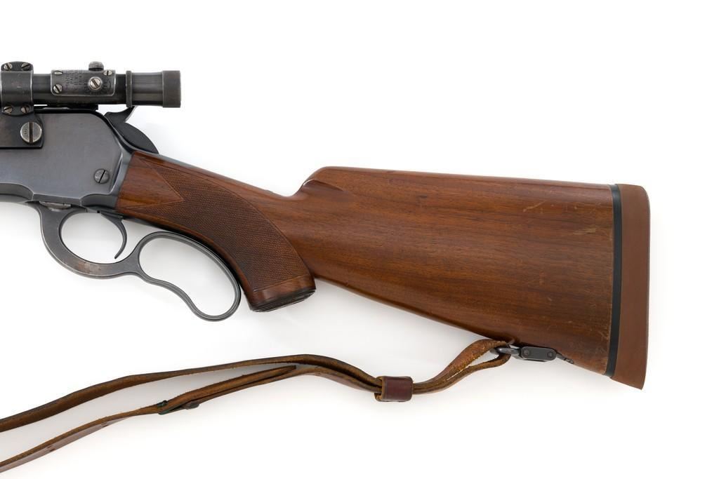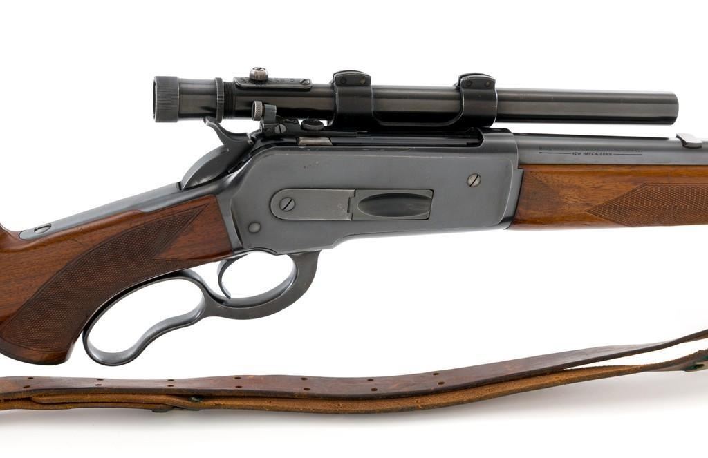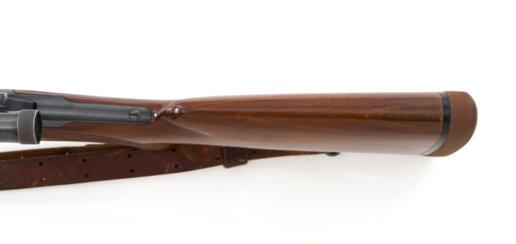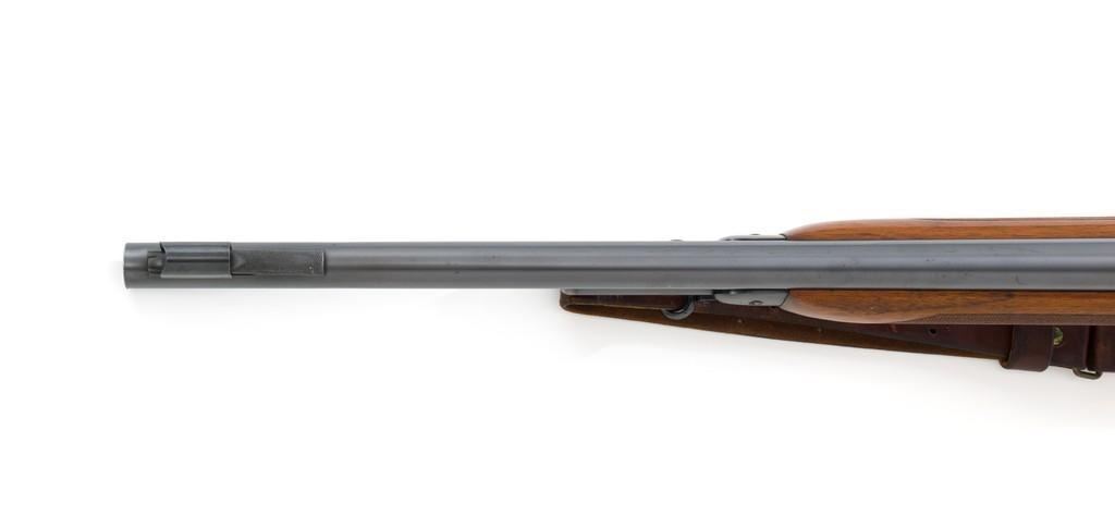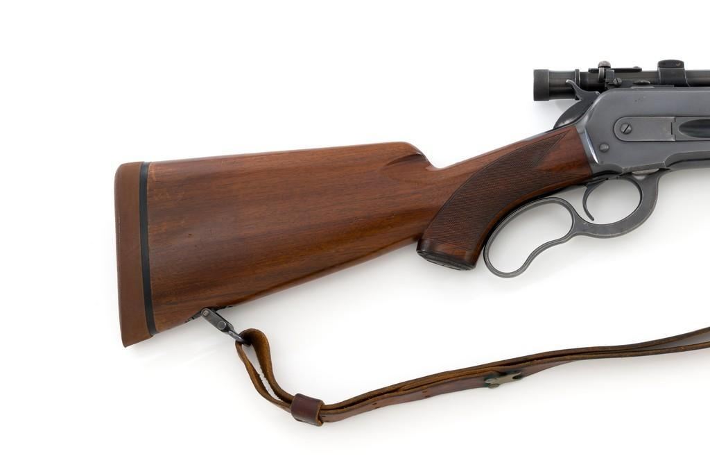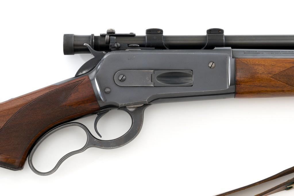 Deluxe Winchester Model 71 Lever Action Carbine, #13933, .348 Win. cal., 20'' barrel with 3/4-magazine; checkered walnut pistol grip stock and forend with super grade sling swivels, Winchester hard rubber grip cap, period military style leather rifle sling, ending with a Decelerator pad, providing a 13-1/8'' LOP to end of pad; 12.1'' to end of wood. Hooded ramped brass tipped blade front sight, rear sight removed and filled with dovetailed sight blank, and bolt peep sight. Early features include long tang, uncrowned muzzle face that is in the white, checkered hammer, Winchester marked grip cap, early type barrel address, receiver was not drilled and tapped when it left the factory. Markings are clear with Winchester ''WP'' proof on the barrel and receiver at the breech. Topped with a Weaver T-6 side mount, rings, and an El Paso Weaver Model 330 fixed power rifle scope with blue finish, post and fine crosshair reticle. Left side of the scope tube shows finish loss and discoloration; optics are clear. Mfg'd 1937. Rifle is in very good overall condition, show signs of age and field use, retaining approx. 90% thinning finish with light wear at the muzzle, scratches, and minor marks along the barrel and magazine. Receiver shows high point edge wear, some light scratches, and worn finish on the underside and on the lever. Sides of the receiver with general mild pin prick blemishes and specks of oxidation. Stock with general dents, scratches, and some flattening of the checkering pattern; length of pull has been shortened to accommodate the thick recoil pad. Action functions smoothly and locks up securely. Bore rates near excellent overall and is bright throughout with well-defined rifling. Est.: $1,500-$2,000. (C&R/PPT)