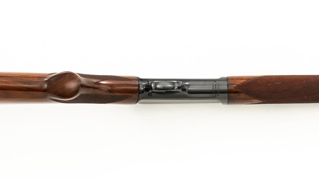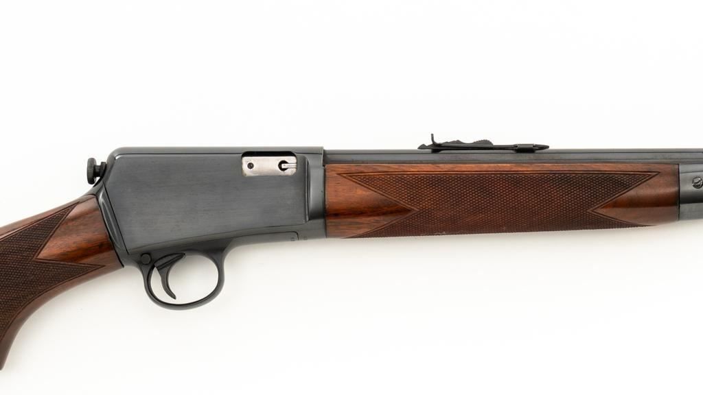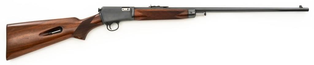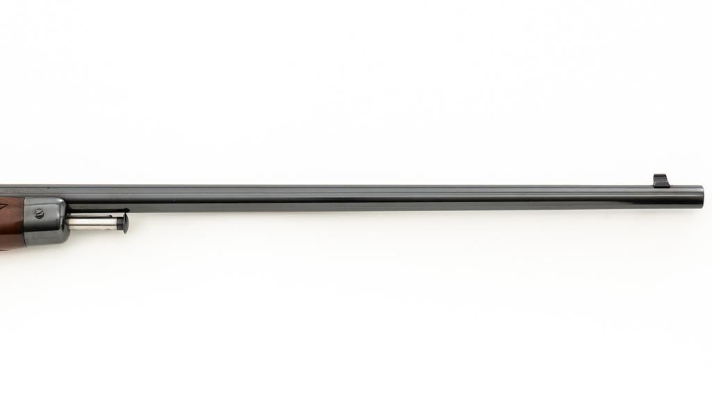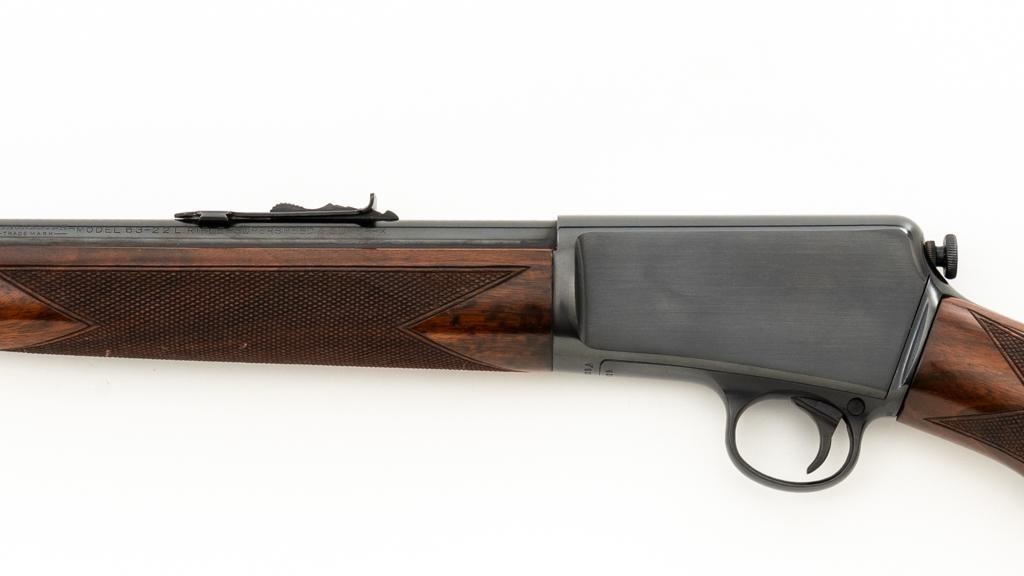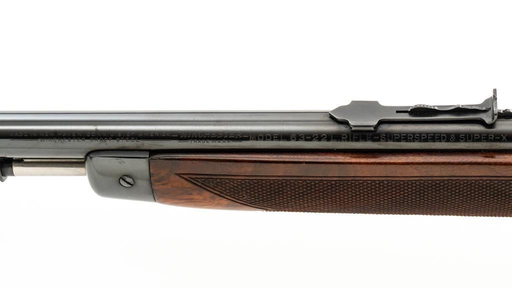Beautifully Restored Winchester Model 63 Semi-Automatic Rifle, #62625, .22 LR cal., 23'' barrel, blue finish, finely checkered walnut pistol grip stock and forend, matte blue steel buttplate, dovetailed blade front sight, and standard elevator ''U''-notch rear sight. Factory markings are clear, with Winchester ''WP'' proofs on the barrel and receiver. Mfg'd 1947. Rifle is in excellent overall condition as restored, retaining approx. 98% professionally reblued finish, with only light handling marks. Stock is in excellent condition, with sharp checkering detail, pleasing grain patterns, and smooth gloss finish. Buttstock and forend with only a few light handling marks. Action functions smoothly. Bore is bright with defined rifling. Est.: $1,000-$1,200. (C&R/PPT)