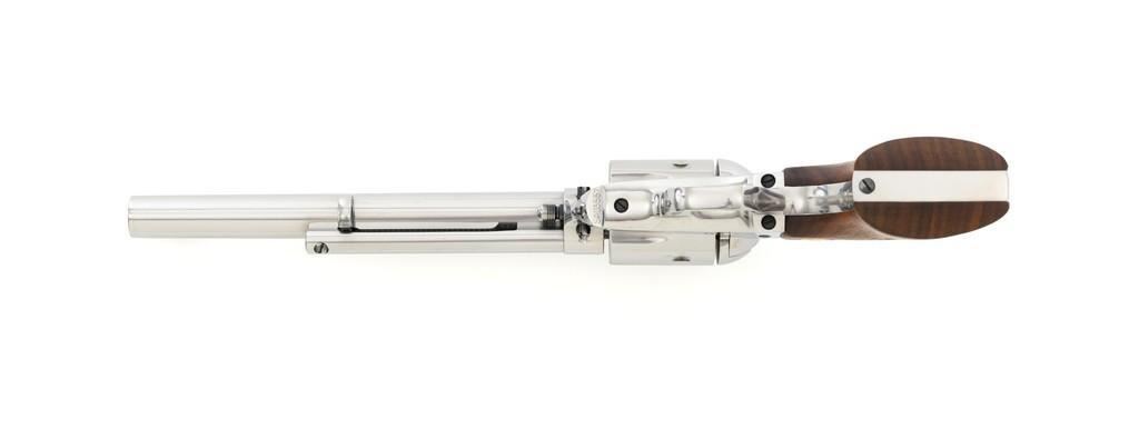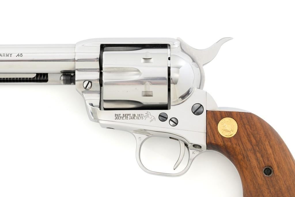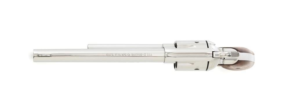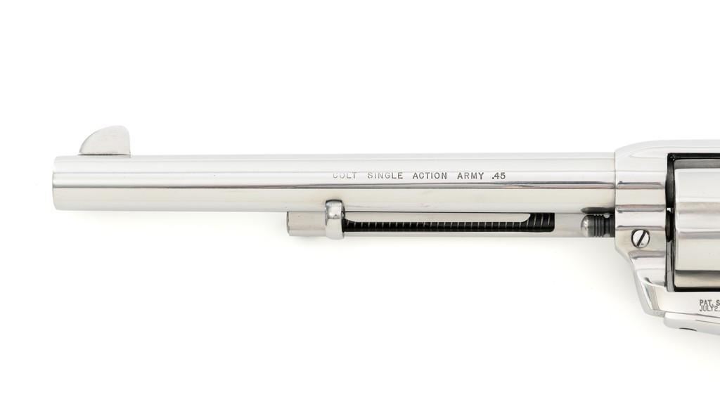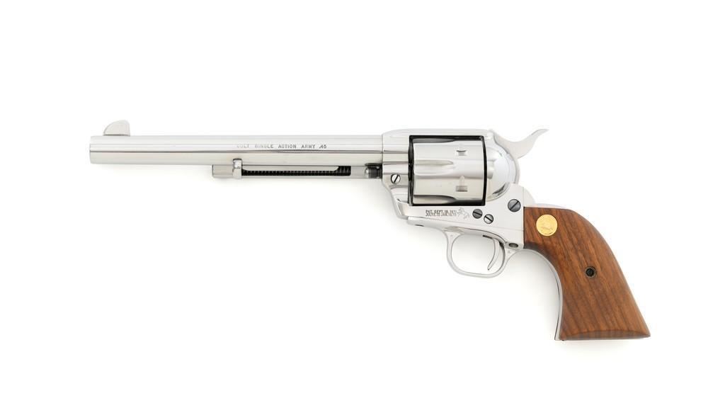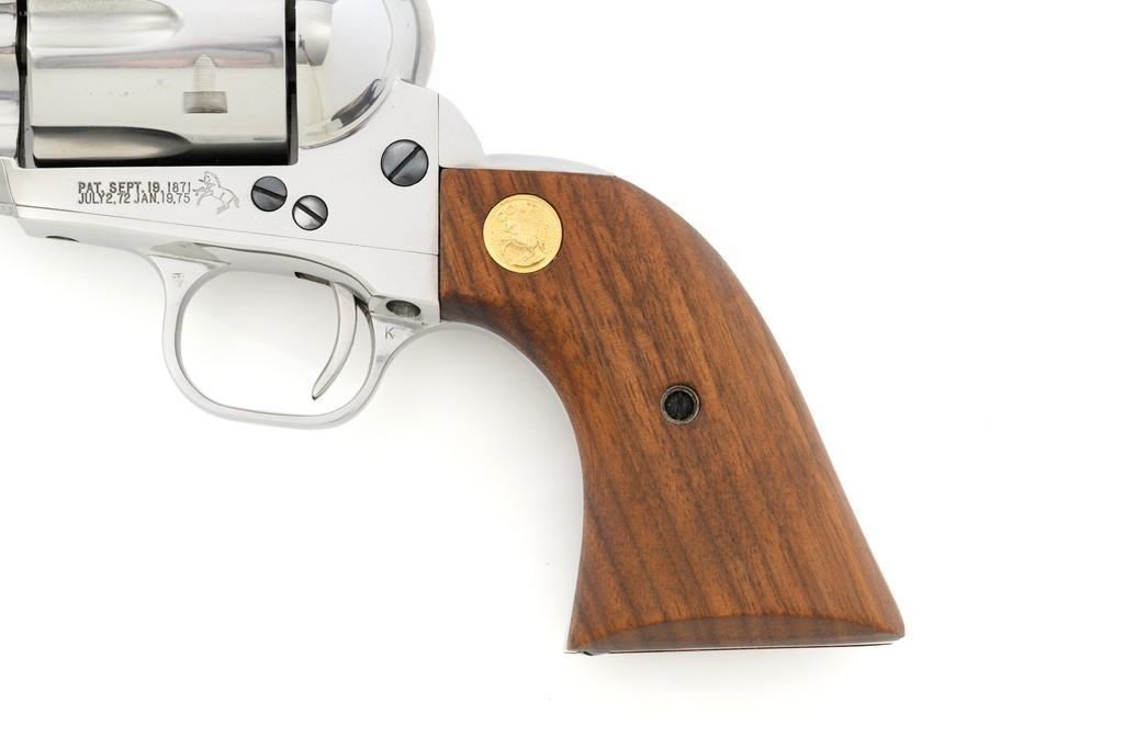 Colt 3rd Generation Single Action Army Revolver, #SA03557, .45 Colt cal., 7.5'' barrel, nickel finish, factory smooth walnut grips with gold Rampant Colt medallions, fixed blade front sight, and ''U''-notch rear sight. Mfg'd 1978. Revolver is in excellent condition, no flaking or finish loss, only intermittent micro handling marks to the bright nickel finish. Grips appear near new with bright medallions. Markings are sharp. Action is crisp. Bore is bright with excellent rifling. Est.: $1,600-$2,200. (Modern/PPT)