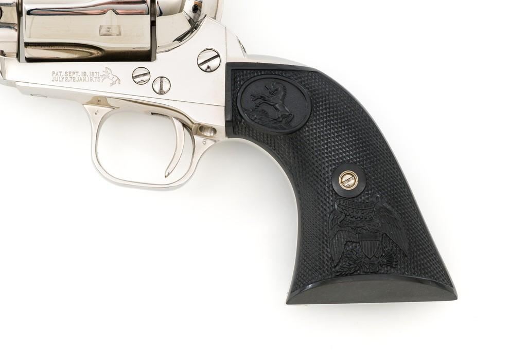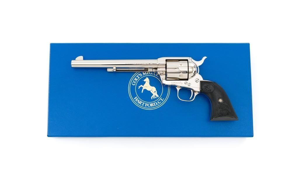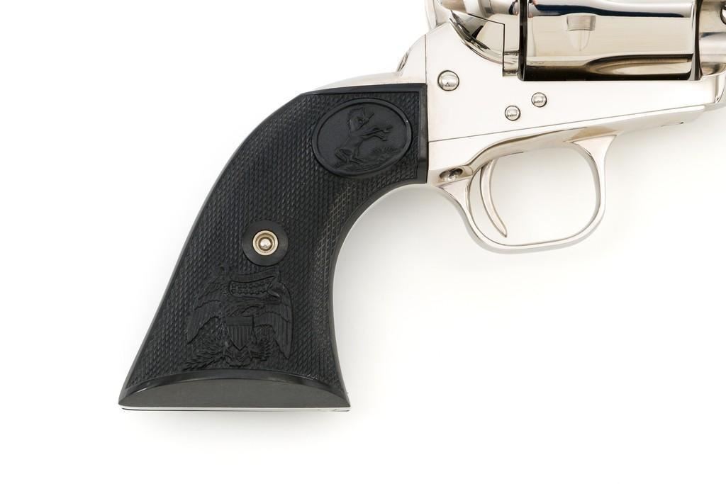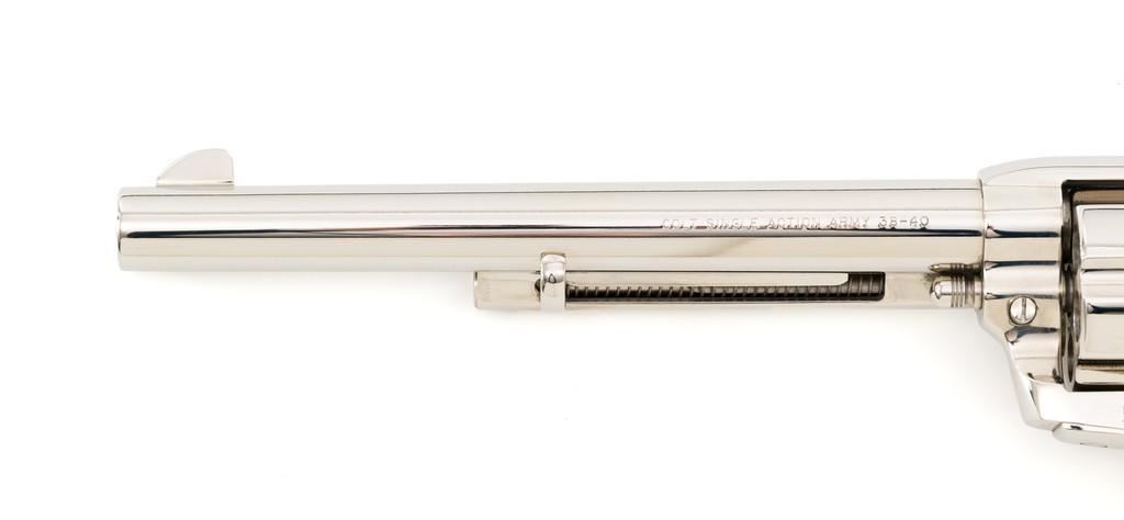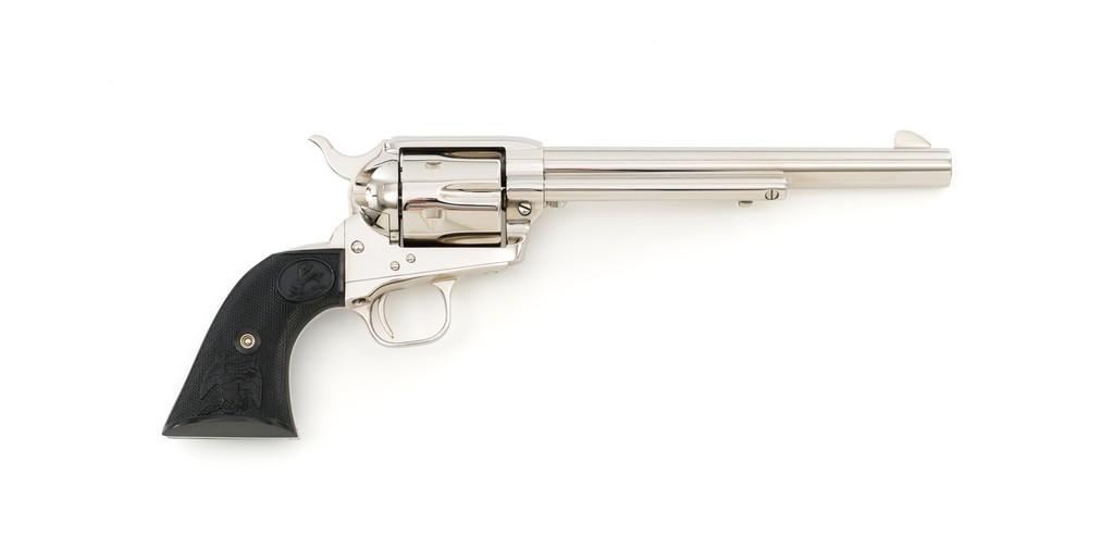 Colt 3rd Generation Single Action Army Revolver, #S13744A, .38-40 cal., 7.5'' barrel, nickel finish, checkered hard rubber two-piece Colt and Eagle grips, blade front and fixed square-notch rear sight. Includes factory shipping box with matching end label, blue cardboard Colt box with instruction manual, warranty card, literature, and associated packaging materials. Mfg'd 1996. Revolver is in excellent condition with only minor marks. Grips are excellent with sharp checkering detail. Action is crisp. Bore is mirror bright and appears unfired. Est.: $2,000-$3,000. (Modern/PPT)