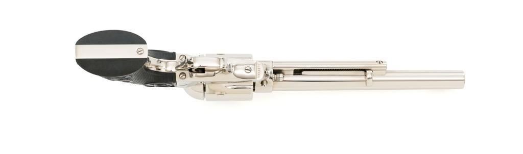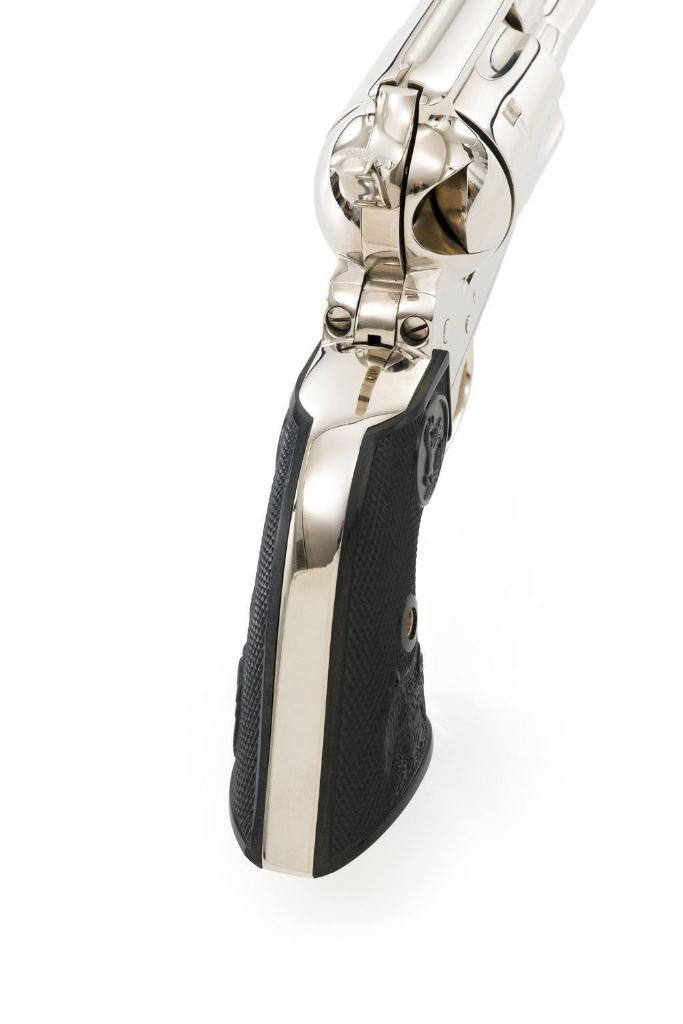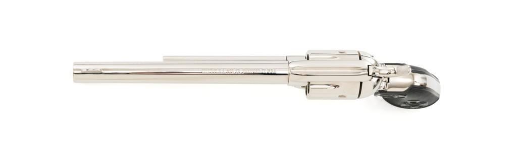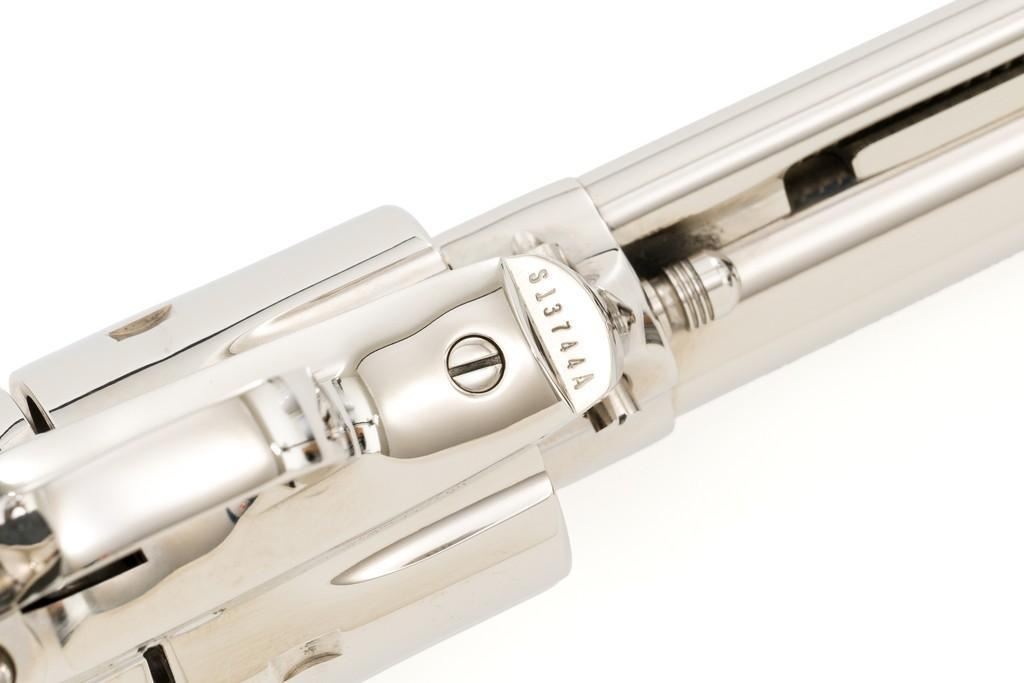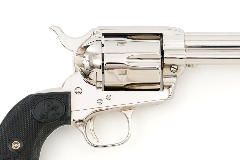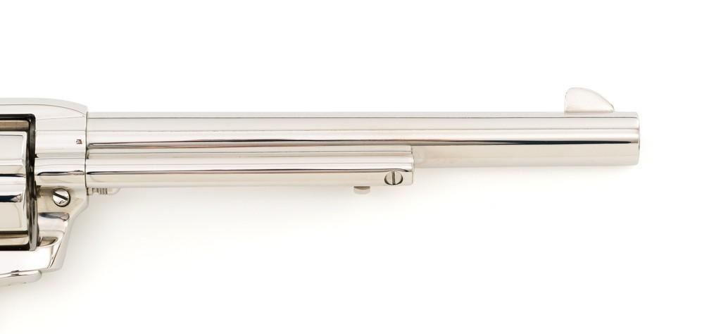 Colt 3rd Generation Single Action Army Revolver, #S13744A, .38-40 cal., 7.5'' barrel, nickel finish, checkered hard rubber two-piece Colt and Eagle grips, blade front and fixed square-notch rear sight. Includes factory shipping box with matching end label, blue cardboard Colt box with instruction manual, warranty card, literature, and associated packaging materials. Mfg'd 1996. Revolver is in excellent condition with only minor marks. Grips are excellent with sharp checkering detail. Action is crisp. Bore is mirror bright and appears unfired. Est.: $2,000-$3,000. (Modern/PPT)