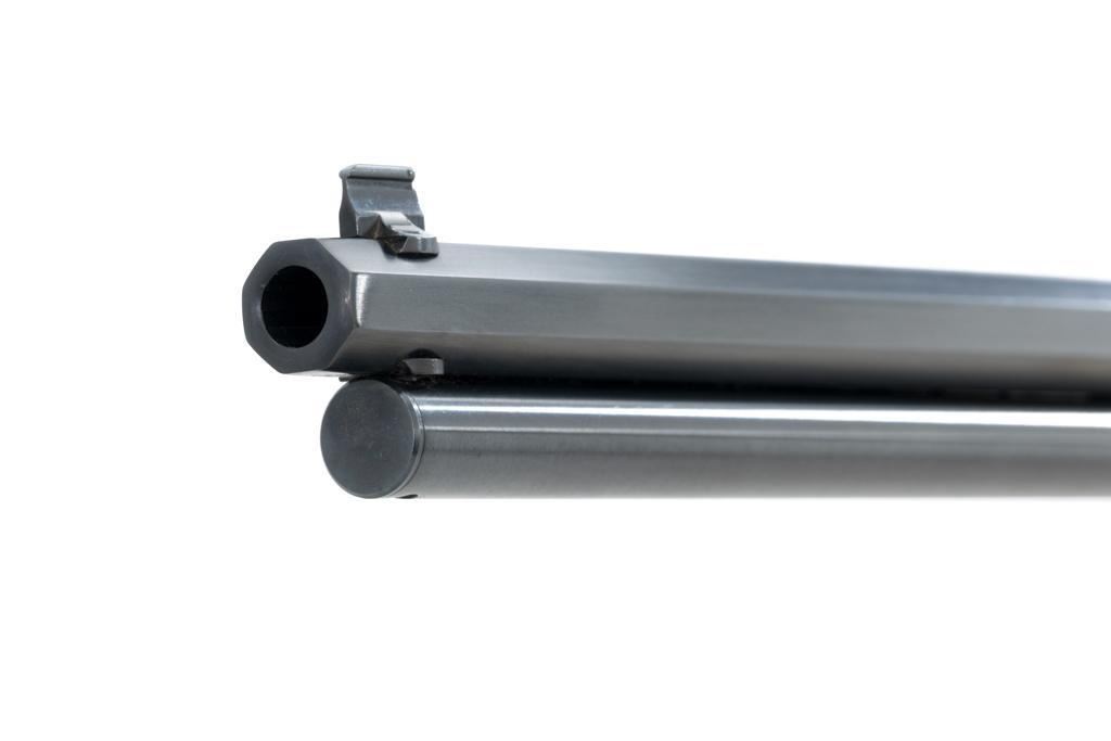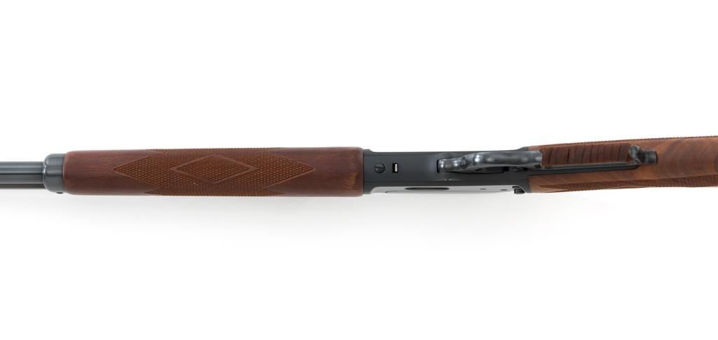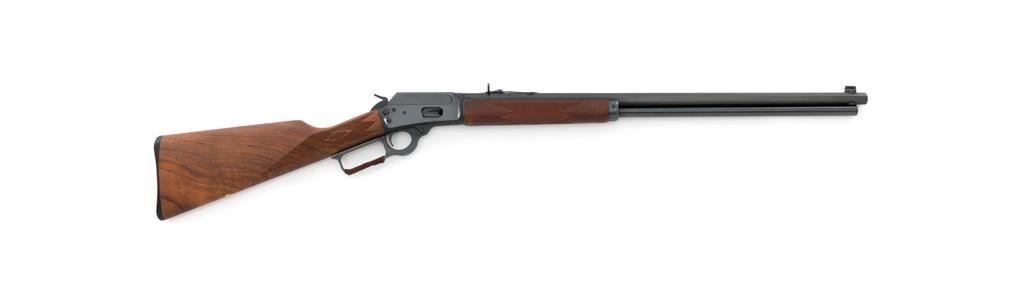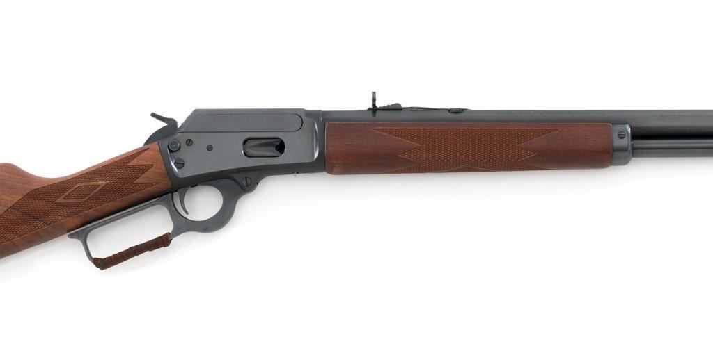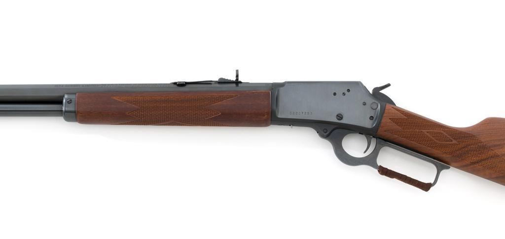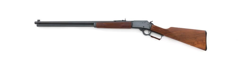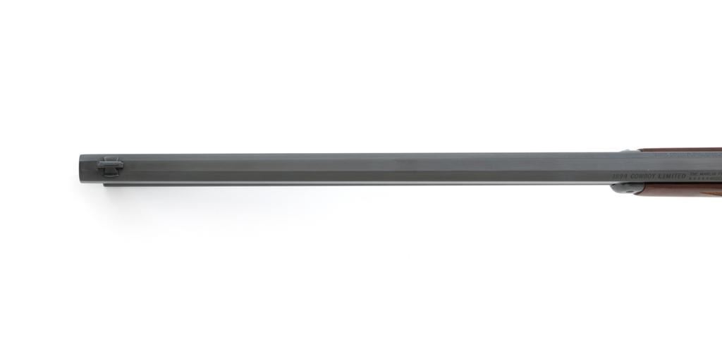 Marlin Model 1894CB Cowboy Limited Lever Action Rifle, #02007293, .44-40 cal., 24'' octagonal ''JM'' marked barrel, dark blue finish, oil-finished straight grip walnut stock and forend with diamond center checkering detail, black plastic Marlin buttplate, dovetailed blade front sight, semi-buckhorn rear sight with elevator, and cross-bolt safety. Portion of the lever has been wrapped in leather. Top of the receiver is factory drilled and tapped for a scope mount. Left side of the barrel is marked ''1894 COWBOY LIMITED''. Mfg'd 1998. Condition is excellent, retaining approx. 98% factory blue, showing intermittent light marks from handling and use, most notable are along the matte finish on top of the receiver. Wood with sharp checkering detail and very few, minor handling marks. Action is crisp and operates smoothly. Bore rates excellent and is bright with defined rifling. Est.: $900-$1,200. (Modern/PPT)