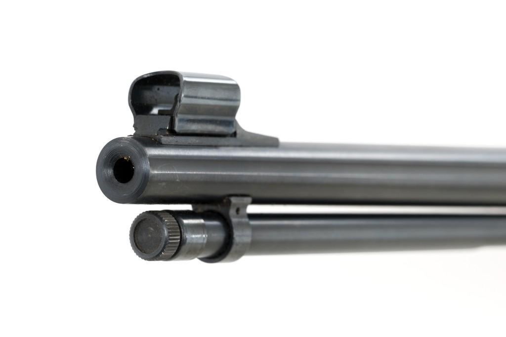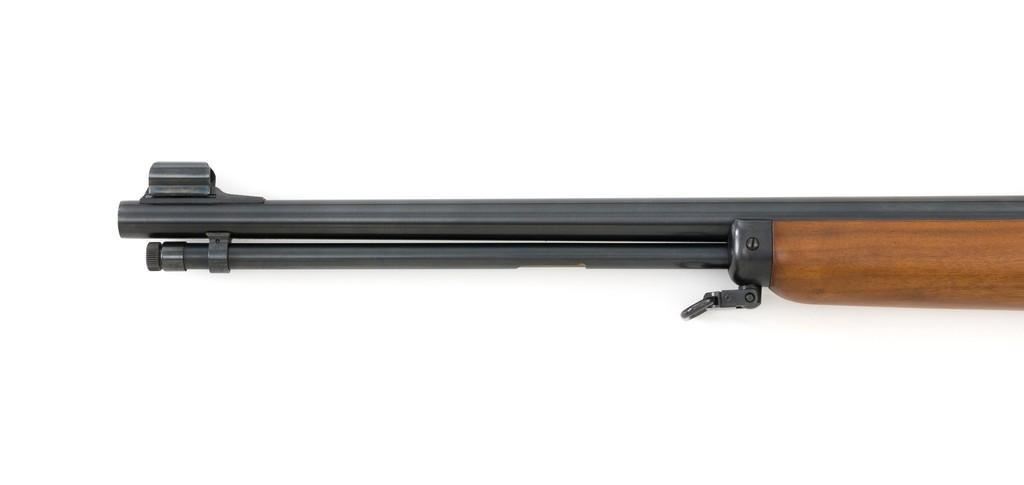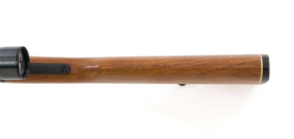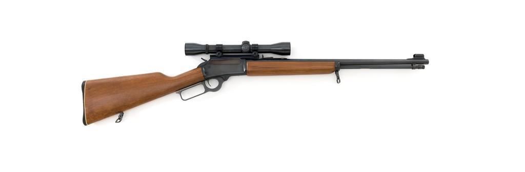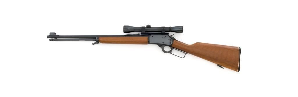 Marlin Model 1894M Lever Action Rifle, #16033871, .22 WMR cal., 20'' round ''JM'' marked barrel with micro-groove rifling, blue finish, straight grip walnut stock and forend with black plastic Marlin buttplate, beaded blade front sight on ramped base with hood, semi-buckhorn rear sight with elevator, and cross-bolt safety. Sling swivels have been added at the buttstock and forend cap. Mfg'd 1984. Rifle is topped with a one-piece Weaver base, rings, and Weaver K4 60-C scope, which features a fine crosshair reticle and blue finish. Outside of the scope has a few typical light marks and scratches; optics are a little foggy around the perimeter but remain serviceable, as most of the field of vision is bright and clear. Rifle is in excellent overall condition, retaining approx. 98% factory blue. Wood and metal with intermittent minor marks from handling and use. Action is crisp and operates smoothly. Bore rates excellent and is bright with defined micro-groove rifling. Est.: $1,000-$1,500. (Modern/PPT)