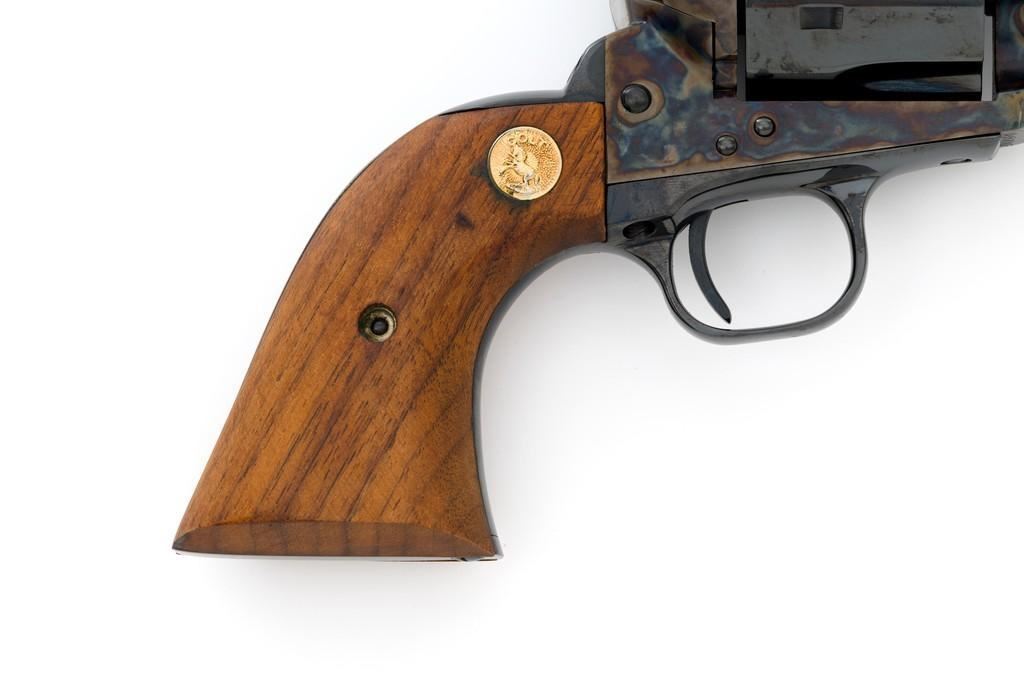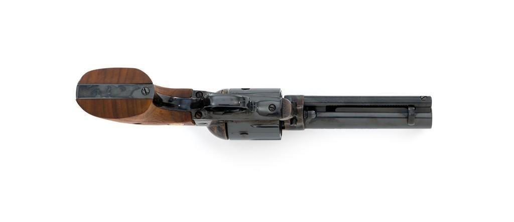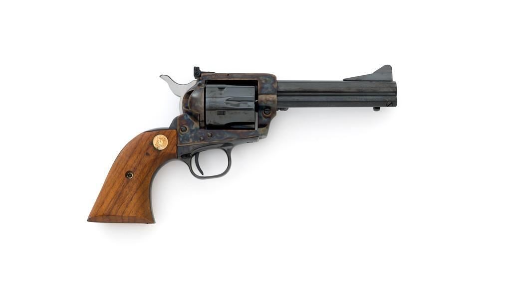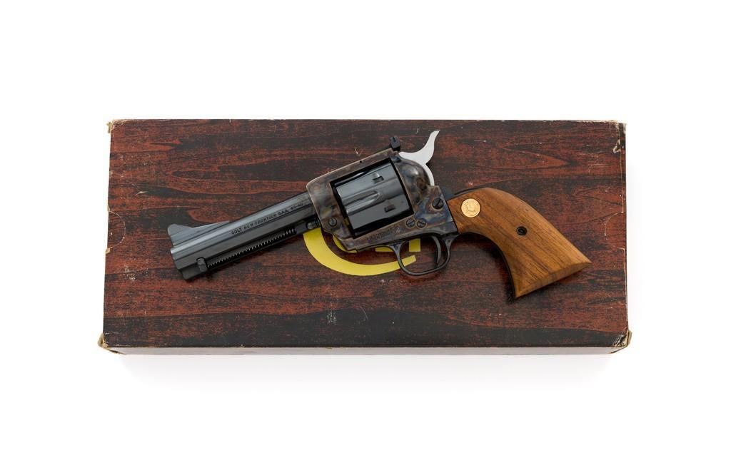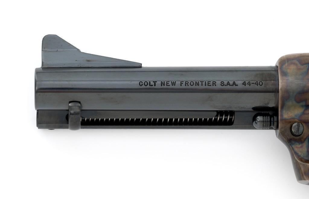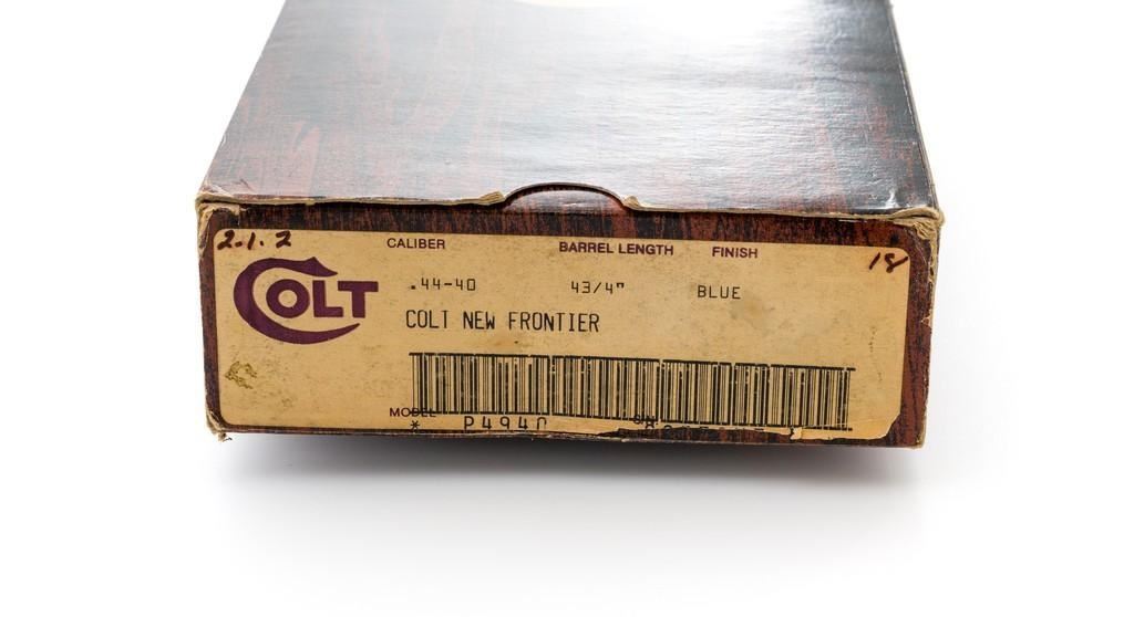 Like New Colt New Frontier 3rd Gen. Single Action Army Revolver, #08570NF, .44-40 cal., 4.75'' barrel, blue finish, case hardened frame, smooth walnut grips with gold Colt medallions, fixed blade front sight, with adjustable square-notch rear sight. Mfg'd 1980. Includes matching numbered woodgrain pattern Colt box with two-piece Styrofoam insert, yellow hang tag, instruction manual, and other misc. factory literature. Metal surfaces appear like new and still have a small amount of old, dried oil across the surface. Case colors are vibrant. Factory lettering is crisp. Right grip with two spots of dark staining caused by verdigris that was on the gold Colt medallion. Otherwise, both grips are excellent. Action and bore are like new, appearing unfired. Box is good, showing moderate signs of age and storage wear, with a clear end label. Est.: $1,200-$1,800. (Modern/PPT)