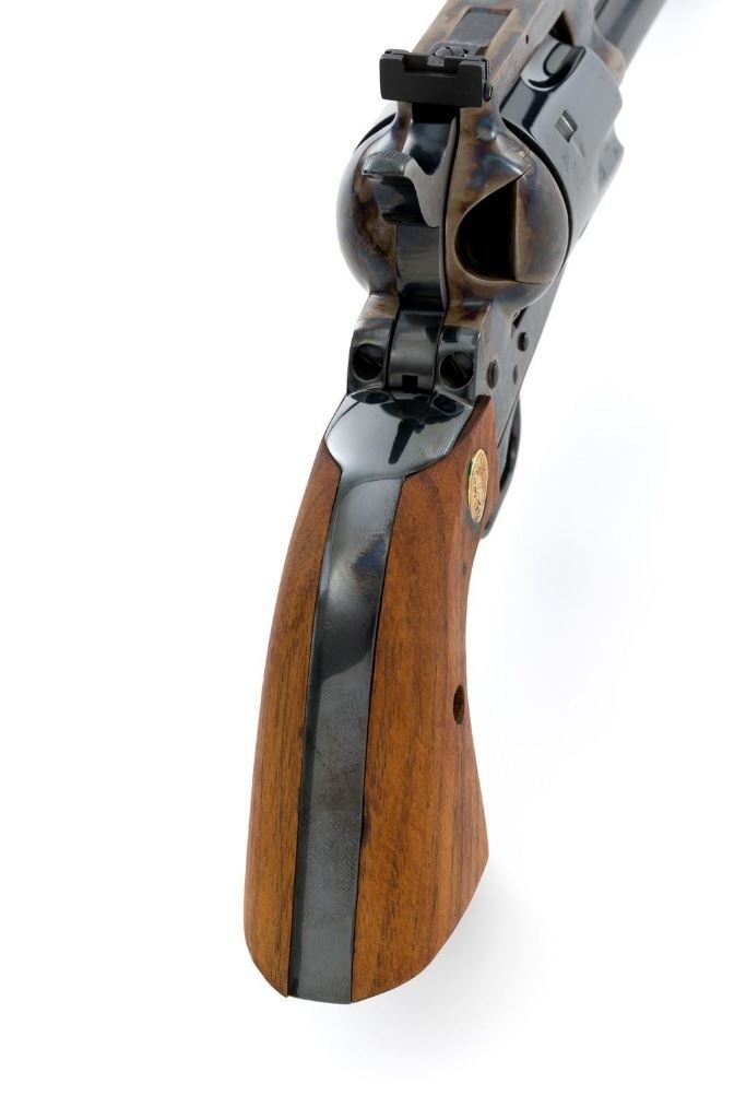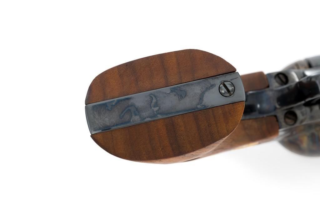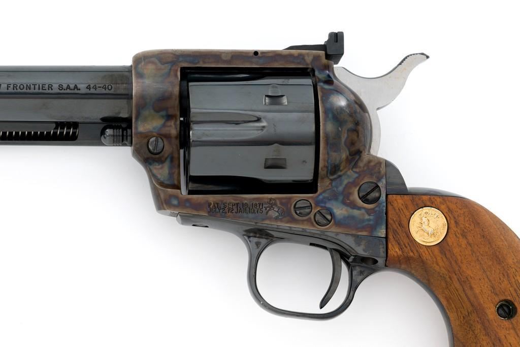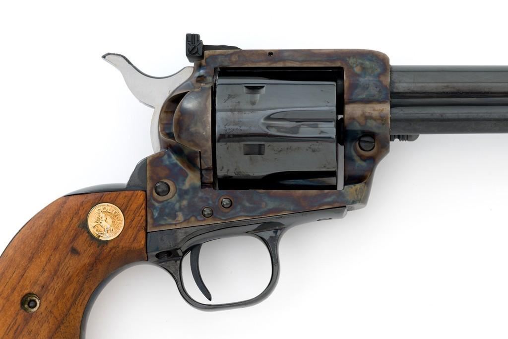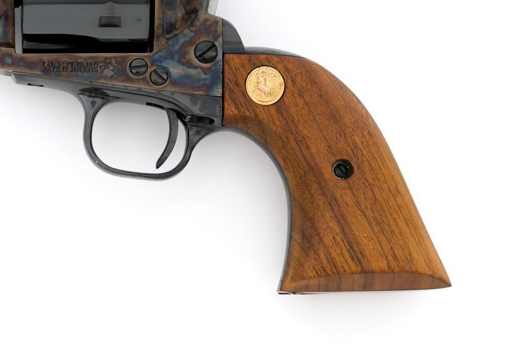 Like New Colt New Frontier 3rd Gen. Single Action Army Revolver, #08570NF, .44-40 cal., 4.75'' barrel, blue finish, case hardened frame, smooth walnut grips with gold Colt medallions, fixed blade front sight, with adjustable square-notch rear sight. Mfg'd 1980. Includes matching numbered woodgrain pattern Colt box with two-piece Styrofoam insert, yellow hang tag, instruction manual, and other misc. factory literature. Metal surfaces appear like new and still have a small amount of old, dried oil across the surface. Case colors are vibrant. Factory lettering is crisp. Right grip with two spots of dark staining caused by verdigris that was on the gold Colt medallion. Otherwise, both grips are excellent. Action and bore are like new, appearing unfired. Box is good, showing moderate signs of age and storage wear, with a clear end label. Est.: $1,200-$1,800. (Modern/PPT)
