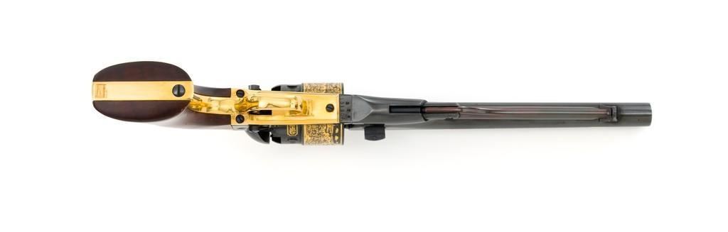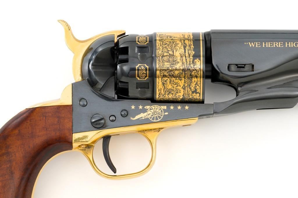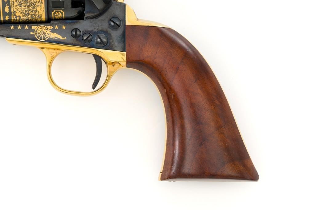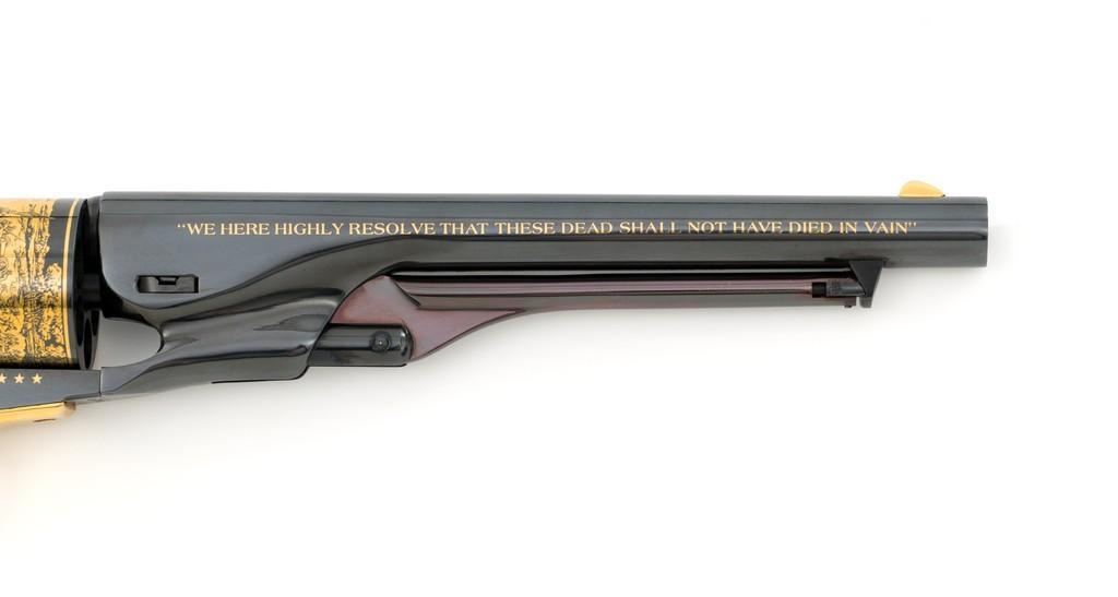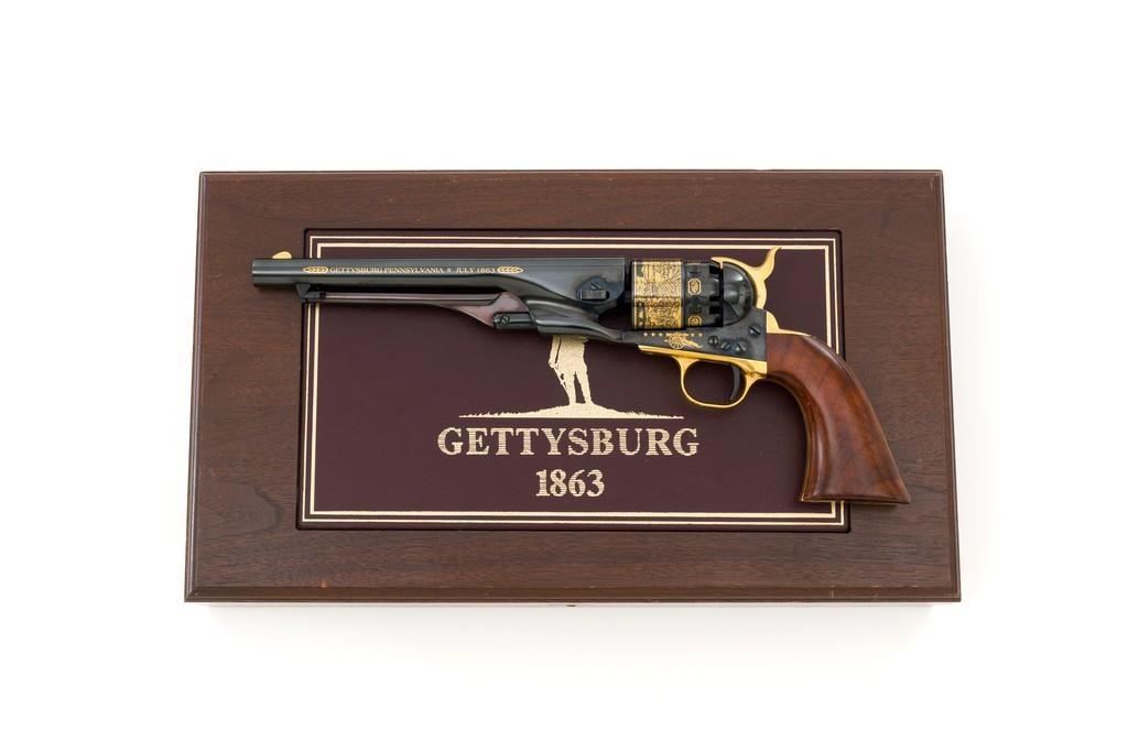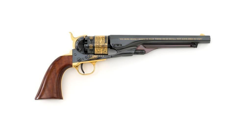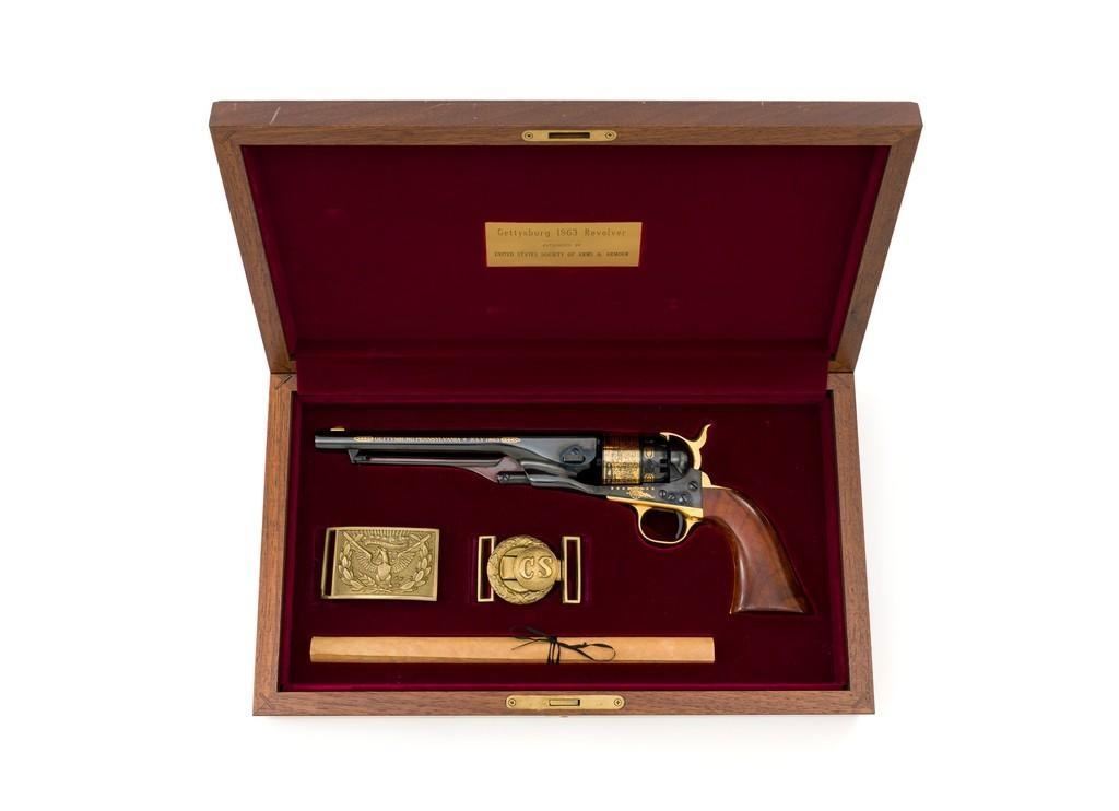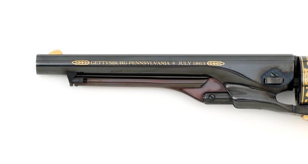 Uberti Gettysburg 1863 Commemorative 1860 Army Percussion Revolver with Case and Accessories, #131907, rich blue finish with 24K gold trim, smooth walnut two-piece grips; 24K gold plated hammer, straps, and trigger guard. Blade front sight is also gold plated and rear sight is a small ''V''-notch located on the hammer. Grip frame is cut for stock. Factory markings are clear with 24K gold cylinder scene, marked ''GETTYSBURG PENNSYLVANIA JULY 1863'' on the left side of the barrel and ''WE HERE HIGHLY RESOLVE THAT THESE DEAD SHALL NOT HAVE DIED IN VAIN'' on the right side. Includes hardwood presentation case with leatherette insert on the lid, marked ''GETTYSBURG 1863''. Interior is finished in maroon velveteen with a brass plaque in the lid, marked ''Gettysburg 1863 Revolver / AUTHORIZED BY / UNITED STATES SOCIETY OF ARMS & ARMOUR''. Case includes a replica manuscript of the Gettysburg Address, brass Union and Confederate belt buckles, and key. Case is in excellent condition with only minor marks. Revolver is in excellent overall condition, retaining 99%+ finish, appearing unfired. Grips with a few light handling marks. Action is crisp. Bore is mirror bright. Mfg'd 1994, with a limited production of 1863. Est.: $1,000-$1,500. (No FFL Required)
