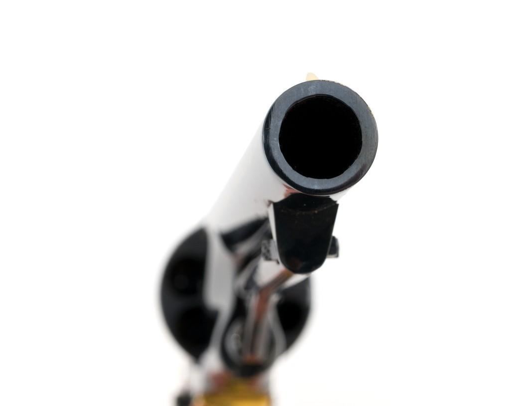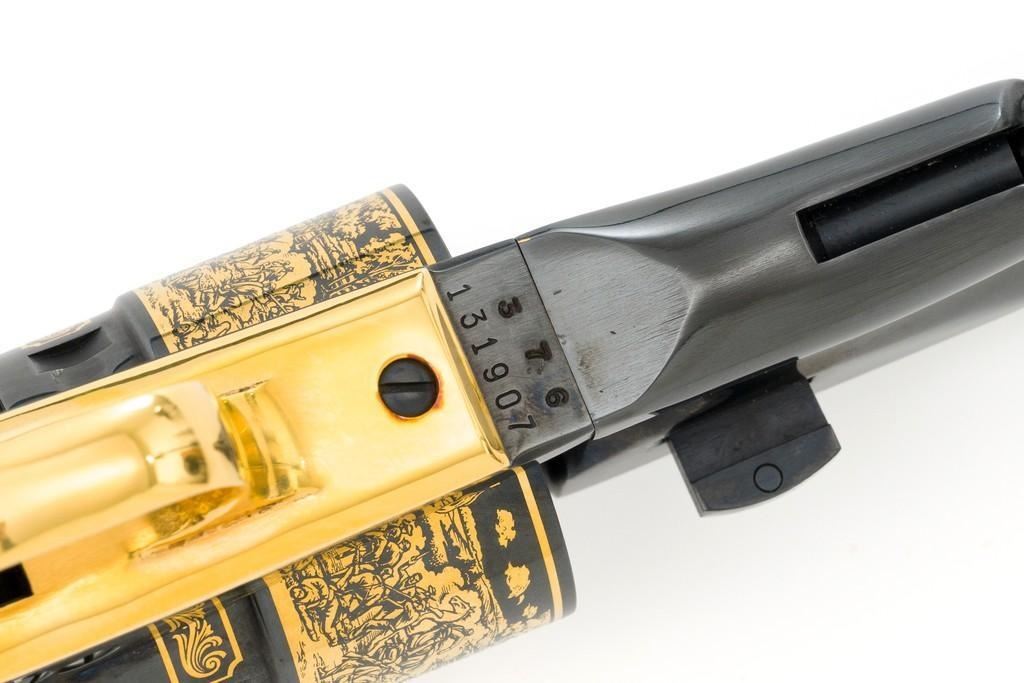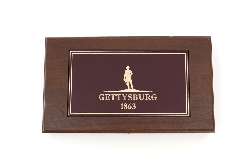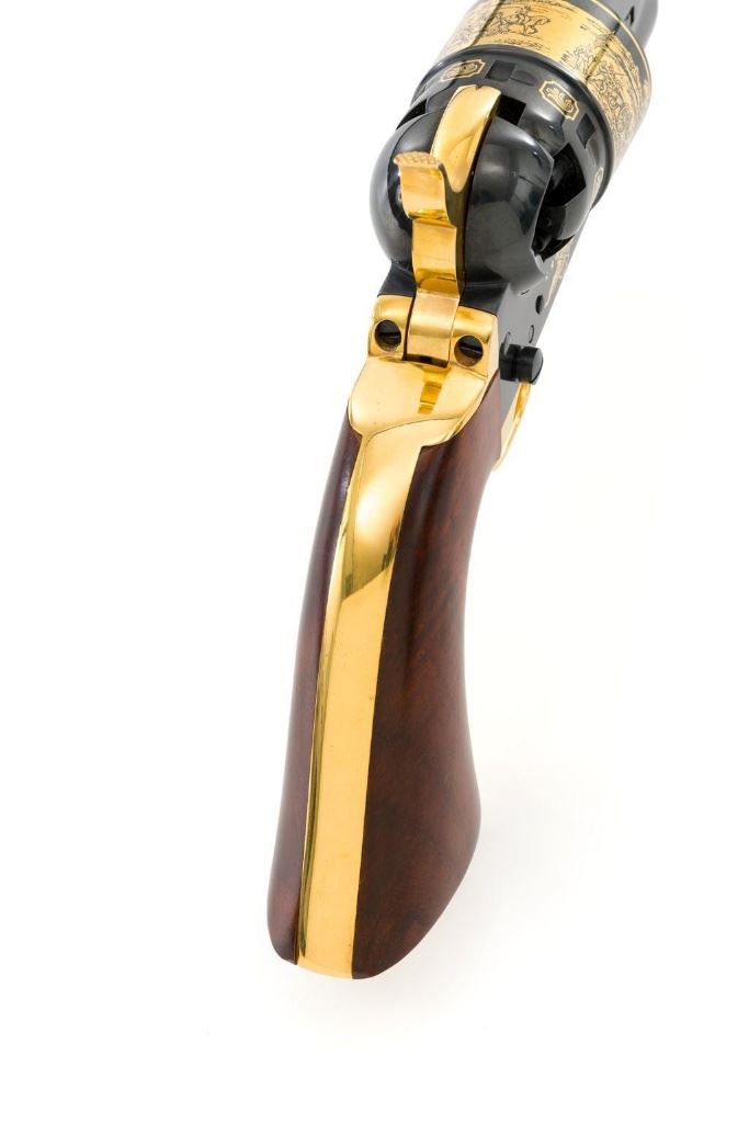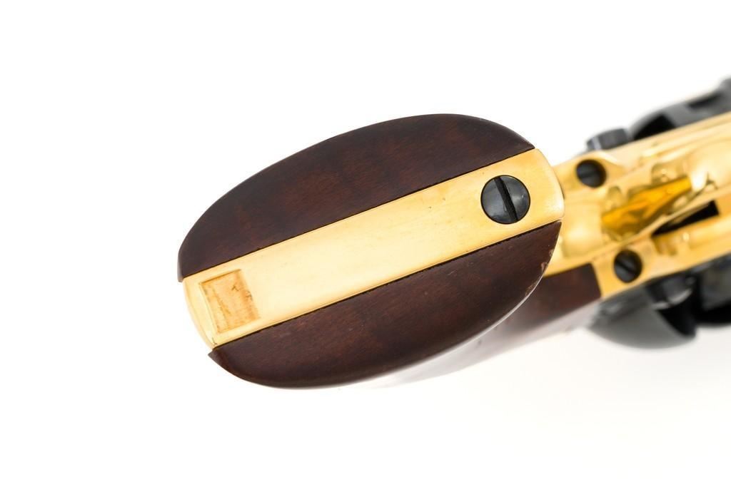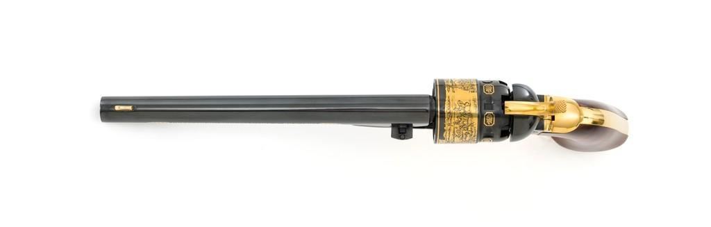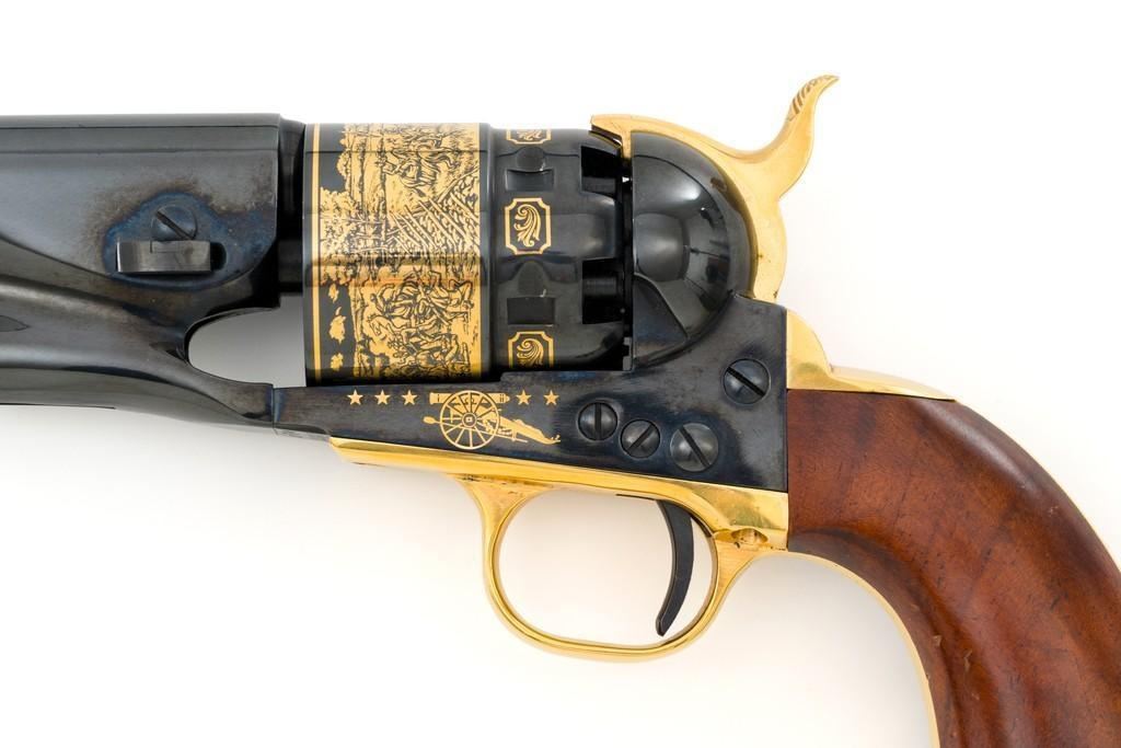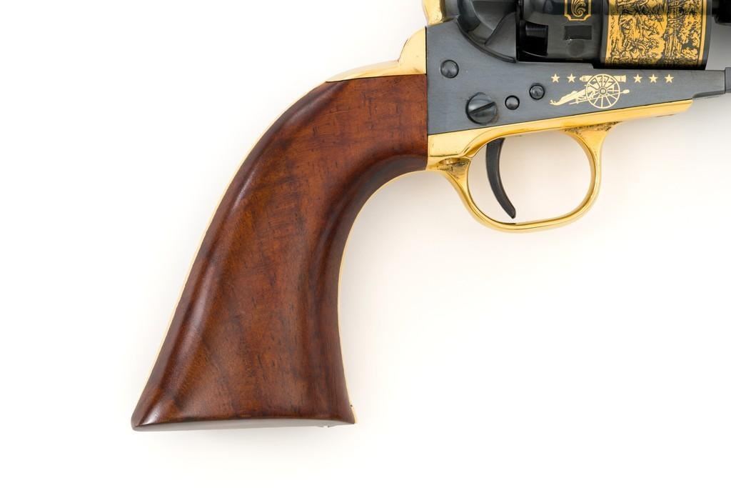 Uberti Gettysburg 1863 Commemorative 1860 Army Percussion Revolver with Case and Accessories, #131907, rich blue finish with 24K gold trim, smooth walnut two-piece grips; 24K gold plated hammer, straps, and trigger guard. Blade front sight is also gold plated and rear sight is a small ''V''-notch located on the hammer. Grip frame is cut for stock. Factory markings are clear with 24K gold cylinder scene, marked ''GETTYSBURG PENNSYLVANIA JULY 1863'' on the left side of the barrel and ''WE HERE HIGHLY RESOLVE THAT THESE DEAD SHALL NOT HAVE DIED IN VAIN'' on the right side. Includes hardwood presentation case with leatherette insert on the lid, marked ''GETTYSBURG 1863''. Interior is finished in maroon velveteen with a brass plaque in the lid, marked ''Gettysburg 1863 Revolver / AUTHORIZED BY / UNITED STATES SOCIETY OF ARMS & ARMOUR''. Case includes a replica manuscript of the Gettysburg Address, brass Union and Confederate belt buckles, and key. Case is in excellent condition with only minor marks. Revolver is in excellent overall condition, retaining 99%+ finish, appearing unfired. Grips with a few light handling marks. Action is crisp. Bore is mirror bright. Mfg'd 1994, with a limited production of 1863. Est.: $1,000-$1,500. (No FFL Required)