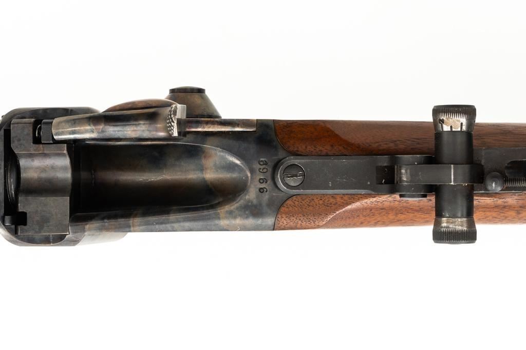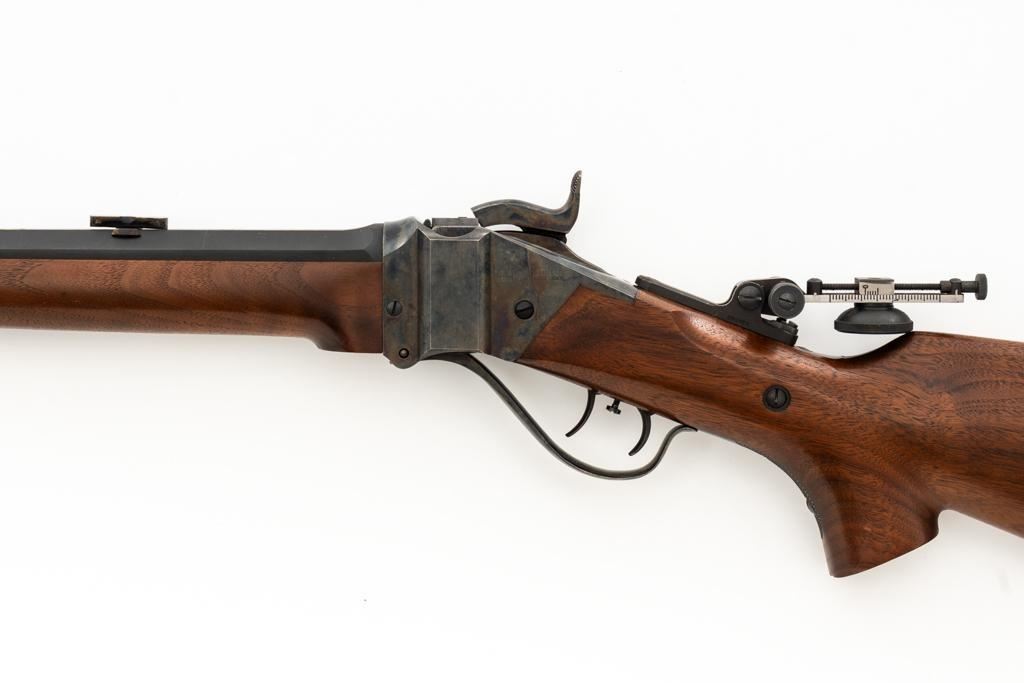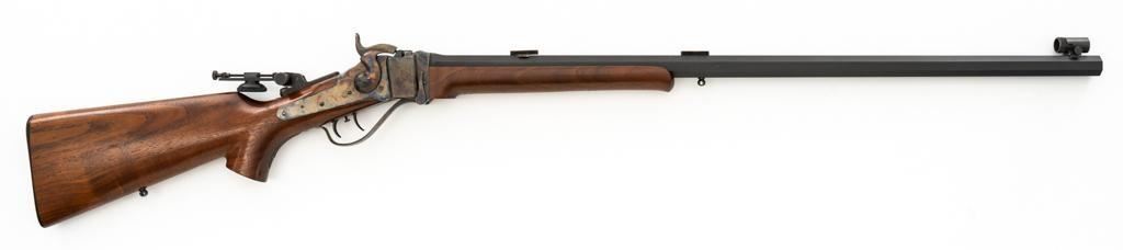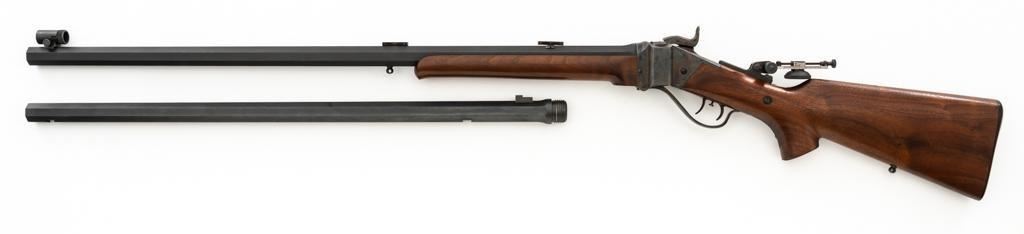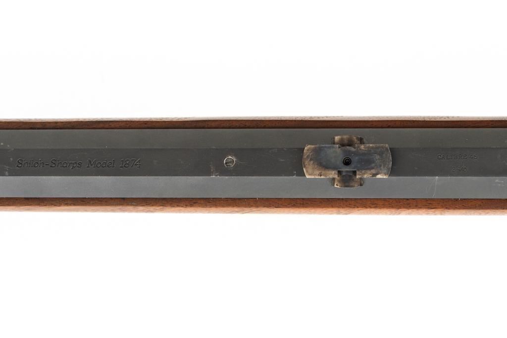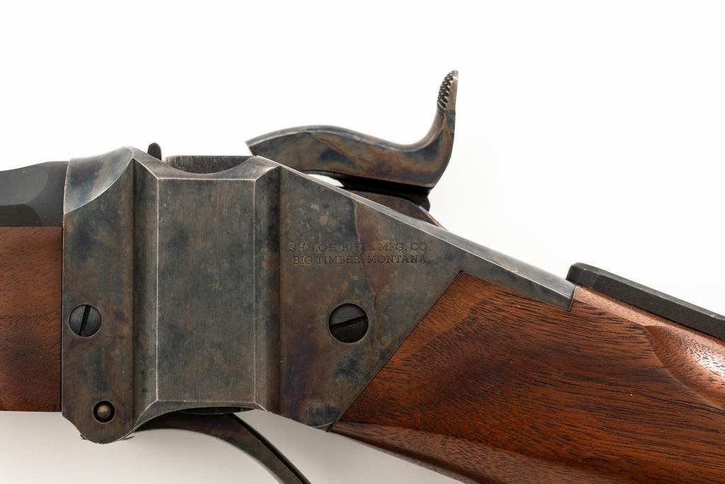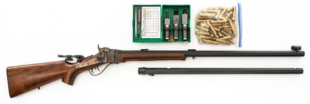 Shiloh Sharps Model 1874 Single Shot Rifle, #9969, .45-90 (.45 2 4/10) cal; 30" octagonal barrel with blue finish and sling stud. Top of barrel flat is marked "Shiloh-Sharps Model 1874", "CALIBRE 45", and "2 4/10''. Receiver, lever, and hammer with a color case hardened finish; left side is marked "SHILOH RIFLE MFG. CO. / BIG TIMBER, MT". Pistol grip walnut stock with checkered lower tang, hard rubber shotgun buttpad, sling stud and forend with Schnabel tip; LOP: 14-1/4". Sights include globe front and Lee Shaver Mid-Range Soule tang sight with Hadley eye cup. The barrel sight has been removed and scope mounting blocks have been added. Rifle also features double-set triggers. Matching numbered barrel. Overall weight is approx. 10 lbs. 6 oz. Includes an additional Shiloh 26'' octagon barrel in .45-70 (.45 2 2/10). Barrel is serialized to the rifle and the front/rear sights have been removed, leaving open dovetails. Rifle is in excellent overall condition. Barrel retains approx. 97%+ original factory blue. Case colors are vibrant and show minimal wear. Wood with only light marks from handling and use. Action operates smoothly and double-set triggers function properly. Bore is mirror bright with excellent rifling. Additional .45-70 barrel retains approx.97%+ factory blue. Bore is bright with well-defined rifling. Per consignor, the rifle was originally fitted with the .45-70 barrel and was sent to Shiloh to have the .45-90 barrel installed.Lot includes RCBS 45-90 reloading dies and 45 pieces of primed 45-90 Starline brass. Est.: $2,500-$3,000. (Modern/PPT)