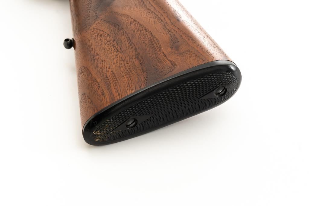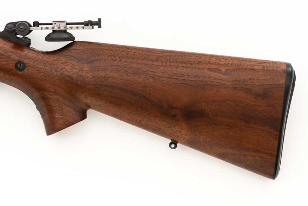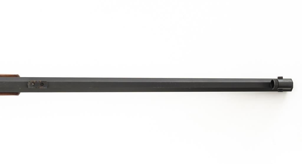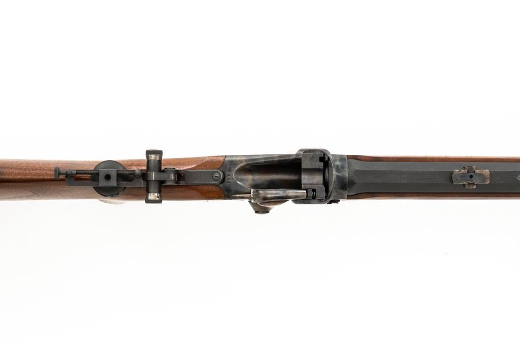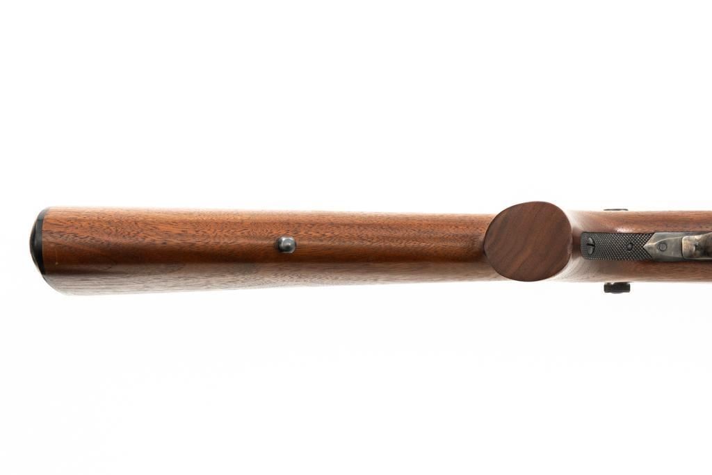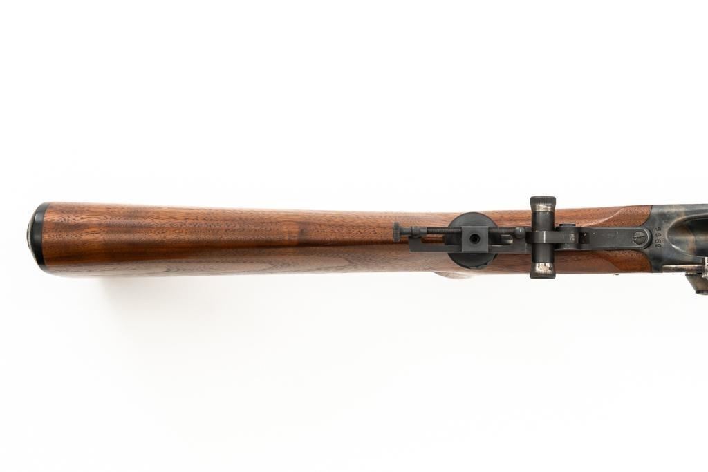 Shiloh Sharps Model 1874 Single Shot Rifle, #9969, .45-90 (.45 2 4/10) cal; 30" octagonal barrel with blue finish and sling stud. Top of barrel flat is marked "Shiloh-Sharps Model 1874", "CALIBRE 45", and "2 4/10''. Receiver, lever, and hammer with a color case hardened finish; left side is marked "SHILOH RIFLE MFG. CO. / BIG TIMBER, MT". Pistol grip walnut stock with checkered lower tang, hard rubber shotgun buttpad, sling stud and forend with Schnabel tip; LOP: 14-1/4". Sights include globe front and Lee Shaver Mid-Range Soule tang sight with Hadley eye cup. The barrel sight has been removed and scope mounting blocks have been added. Rifle also features double-set triggers. Matching numbered barrel. Overall weight is approx. 10 lbs. 6 oz. Includes an additional Shiloh 26'' octagon barrel in .45-70 (.45 2 2/10). Barrel is serialized to the rifle and the front/rear sights have been removed, leaving open dovetails. Rifle is in excellent overall condition. Barrel retains approx. 97%+ original factory blue. Case colors are vibrant and show minimal wear. Wood with only light marks from handling and use. Action operates smoothly and double-set triggers function properly. Bore is mirror bright with excellent rifling. Additional .45-70 barrel retains approx.97%+ factory blue. Bore is bright with well-defined rifling. Per consignor, the rifle was originally fitted with the .45-70 barrel and was sent to Shiloh to have the .45-90 barrel installed.Lot includes RCBS 45-90 reloading dies and 45 pieces of primed 45-90 Starline brass. Est.: $2,500-$3,000. (Modern/PPT)