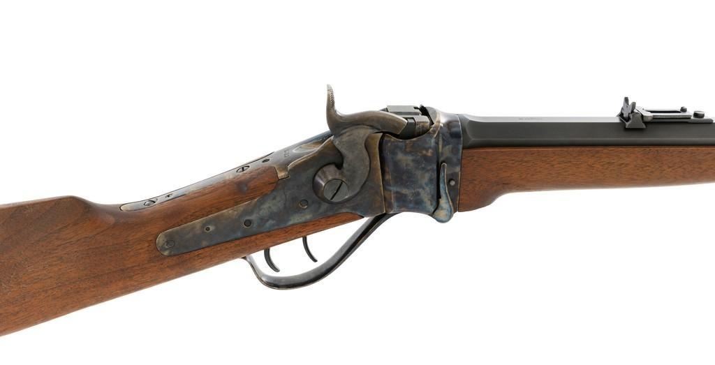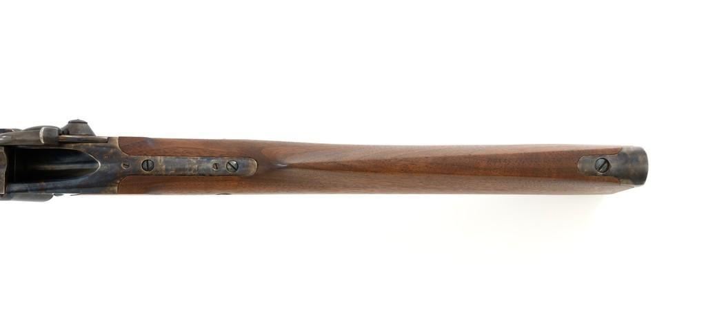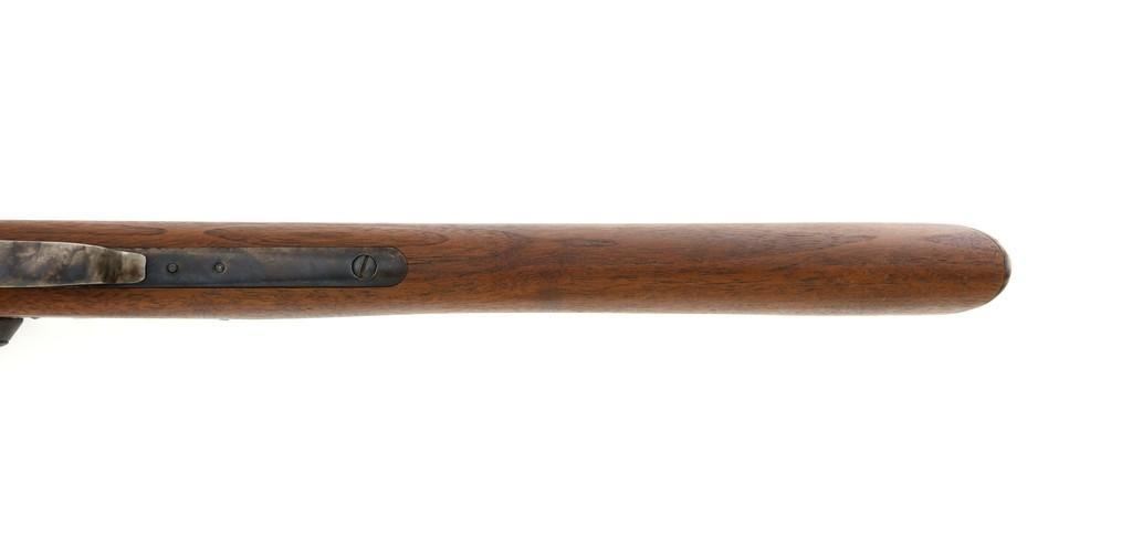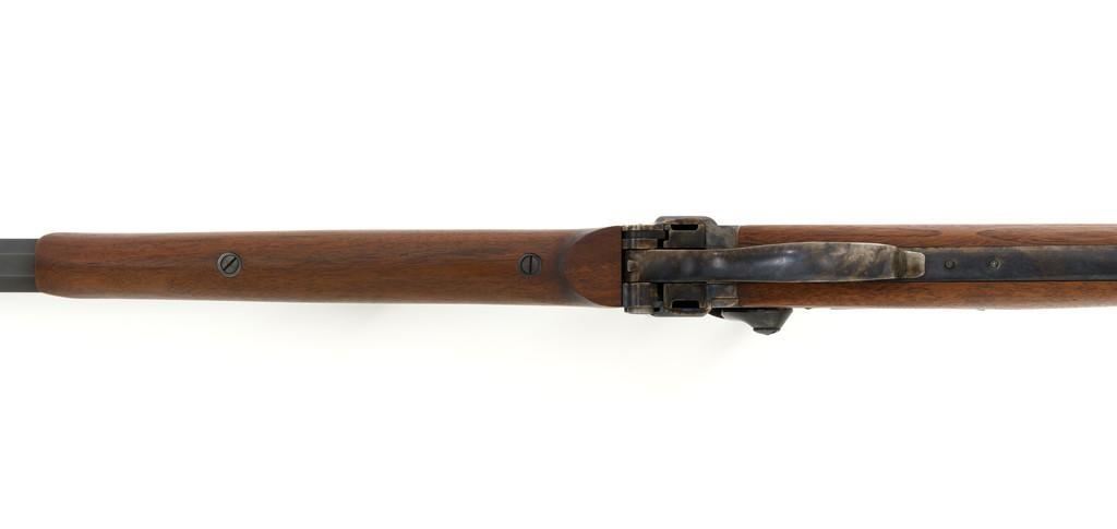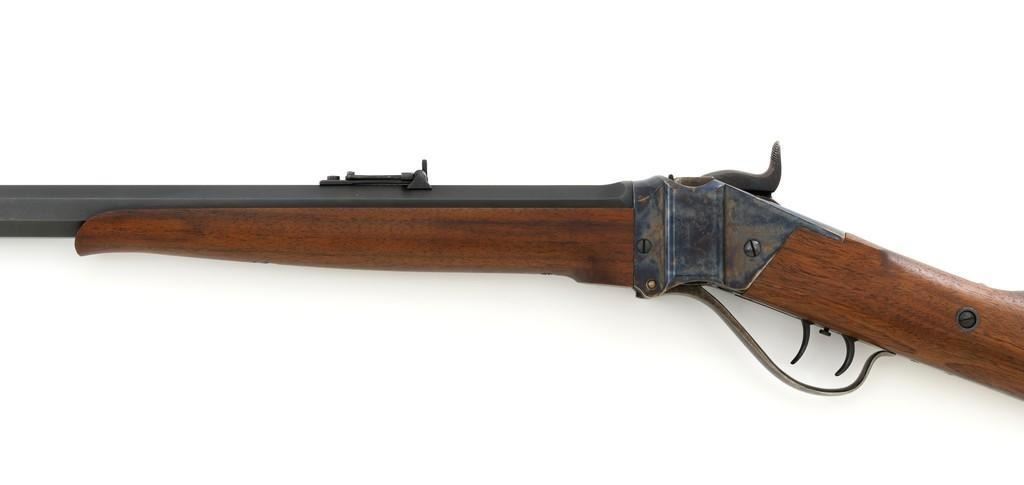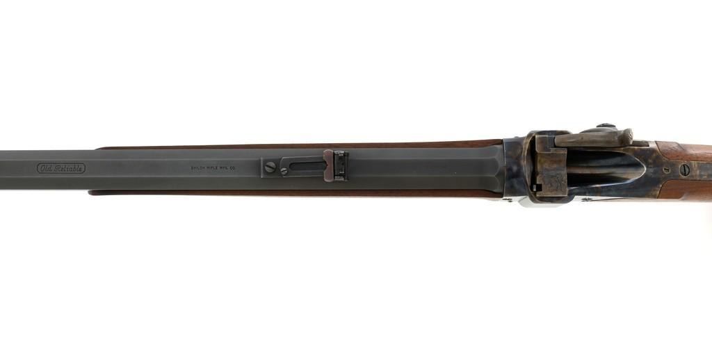 Farmingdale Shiloh Sharps Model 1874 Single Shot Rifle, #3313, .45-90 (.45 2 4/10) cal; 30" octagonal barrel with blue finish. Top of barrel flat is marked "Old Reliable", "SHILOH RIFLE MFG. CO." , "CALIBRE 45", and "2 4/10''. Receiver, lever, and hammer with a color case hardened finish; left side is marked "SHILOH RIFLE MFG. CO. / FARMINGDALE, N.Y." Straight walnut stock with case colored steel military buttplate and forend with Schnabel tip; LOP: 13-3/4". Sights include a nickel silver blade front and folding semi-buckhorn ladder rear. Rifle also features double-set triggers. Matching numbered barrel. Overall weight is approx. 10 lbs. 2 oz. Rifle is in excellent overall condition. Barrel retains approx. 99%+ original factory blue. Case colors are vibrant and show minimal wear. Wood with only light marks from handling and use. Action operates smoothly and double-set triggers function properly. Bore is mirror bright with excellent rifling. Est.: $2,000-$2,500. (Modern/PPT)