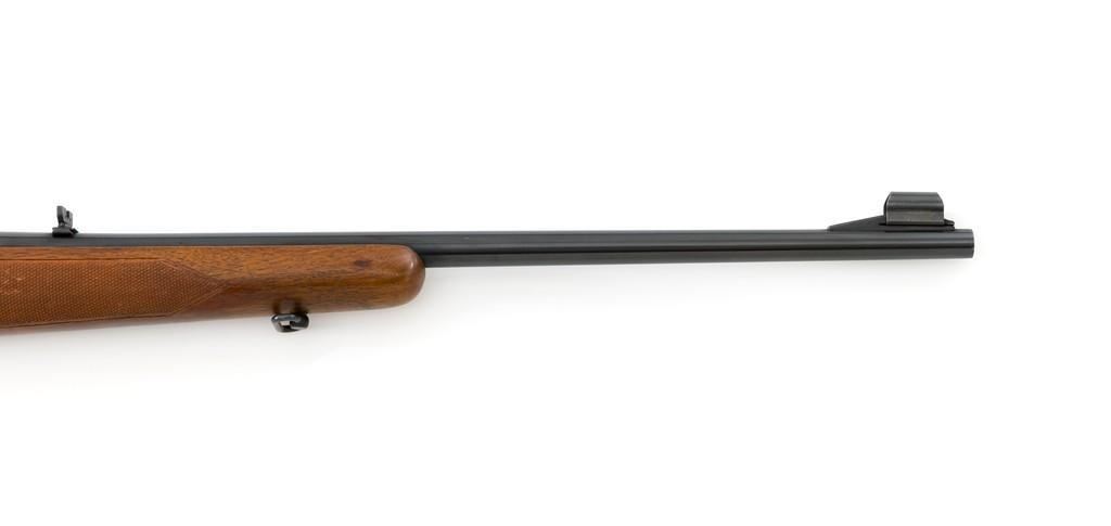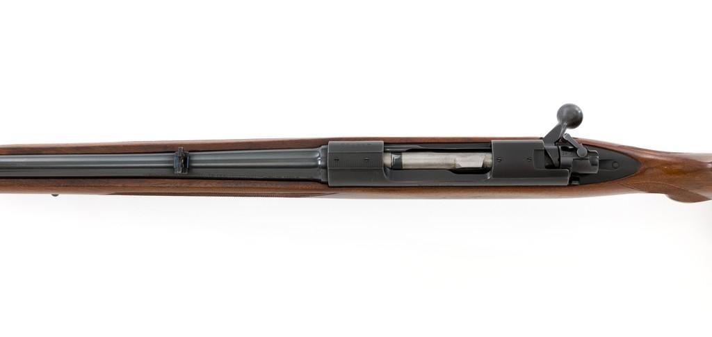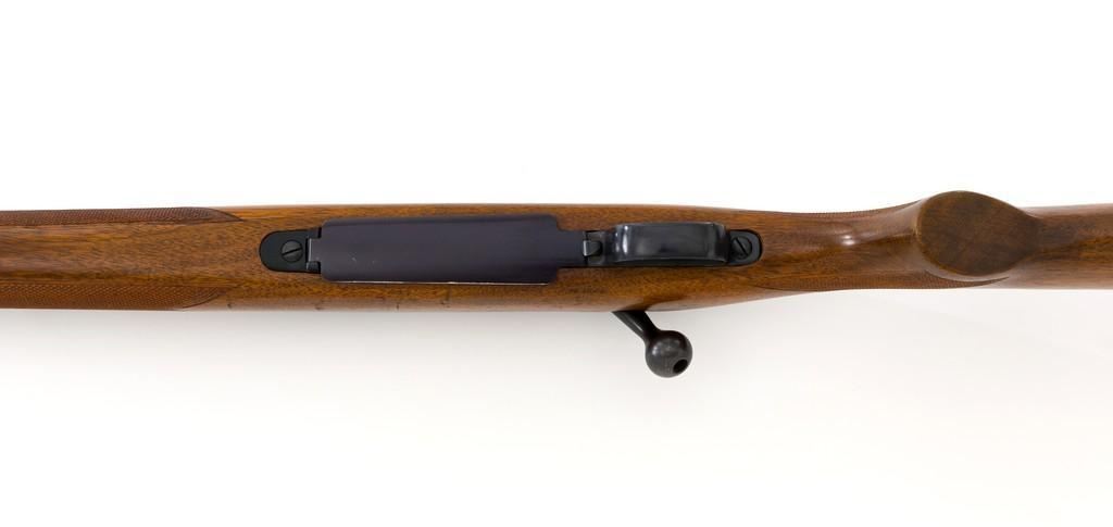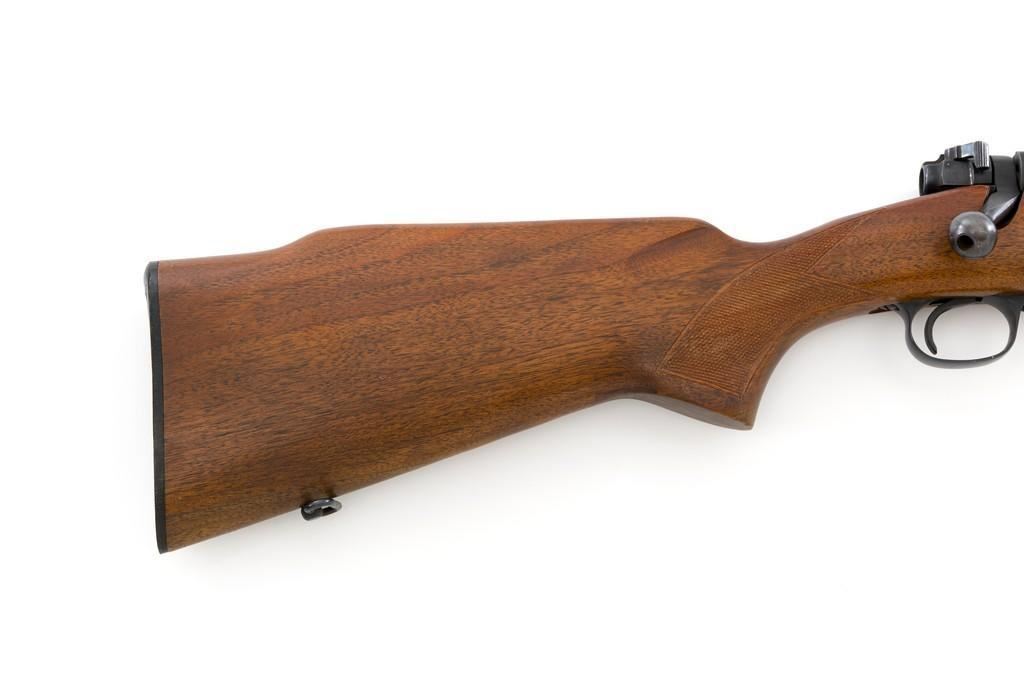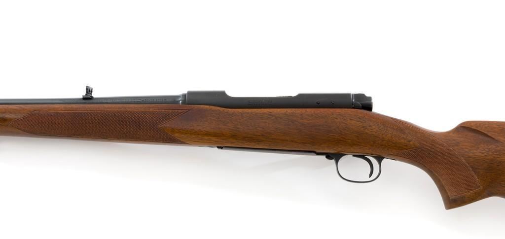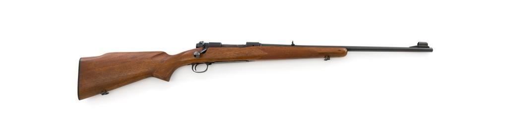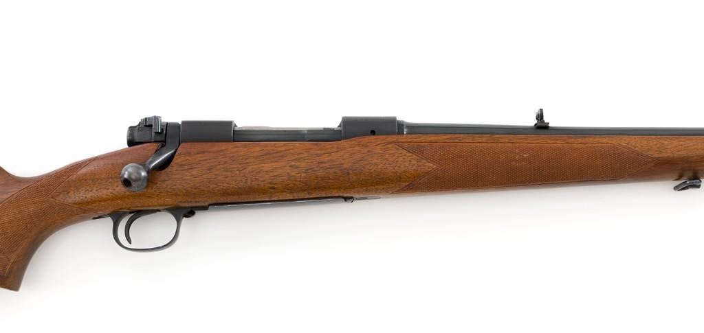 Pre-64 Winchester Model 70 Featherweight Bolt Action Rifle, #435700, .30-06 cal., 22'' barrel, blue finish. Checkered walnut one-piece pistol grip high comb stock with sling swivels, and ending with a checkered hard rubber Winchester buttplate, providing a 13.75'' LOP. Hooded beaded blade front sight on ramped base, and notched folding rear sight. Receiver is drilled and tapped. Factory markings are clear, with Winchester ''WP'' proofs on left side of the barrel and receiver at the breech. Bolt with matching serial number. Mfg'd 1958. Rifle is in near excellent overall condition, retaining approx. 97%-98% toning factory finish, with light wear at the muzzle and edgewear on the floorplate. Stock is in near excellent condition, with light indentations and small mars to the checkering. Action is smooth with a crisp trigger. Bright bore rates excellent, showing little use. Est.: $1,000-$1,500. (C&R/PPT)