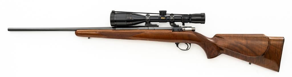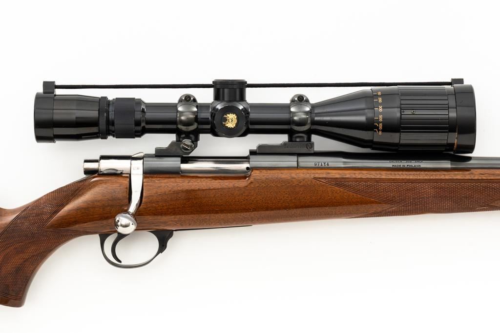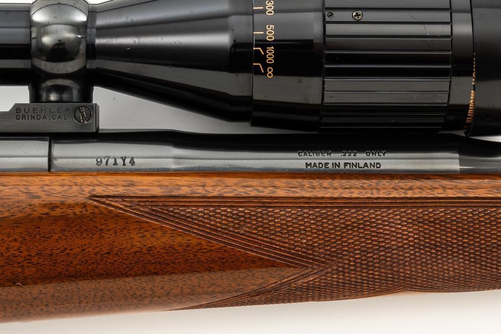 Belgian FN High-Power Safari Grade Sako L461 Bolt Action Rifle, #971Y4, .222 Rem. cal., 22'' light sporter barrel, with blue finish. Finely checkered walnut one-piece pistol grip stock Monte Carlo stock with cheekpiece, sling swivel studs, ending with Browning composition buttplate, providing a 13.75'' LOP. There is no provision for sights. Matching numbered bolt is in the white. Floorplate and trigger guard with scroll engraving. Factory markings are clear, with Belgian proofs and acceptance marks, marked ''MADE IN FINLAND'' on right side of the barrel. Mfg'd 1969. Rifle is topped with Buehler two-piece mounts, rings, and a Nikon Monarch 5.5-16.5x scope, with an adjustable objective, gloss black finish, duplex reticle, and includes a set of plastic lens covers. Scope is in excellent condition with bright, clear optics. Rifle is in near excellent overall condition, retaining approx. 97%-98% factory finish with light wear at the muzzle and minor handling marks. Stock is in fine condition, with scattered small indentations and nicks consistent with field use, most noticeable on right side of the buttstock and left side below the receiver. Action is smooth with a crisp trigger. Bore is bright with excellent rifling. Est.: $1,000-$1,500. (C&R/PPT)