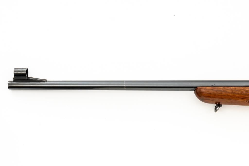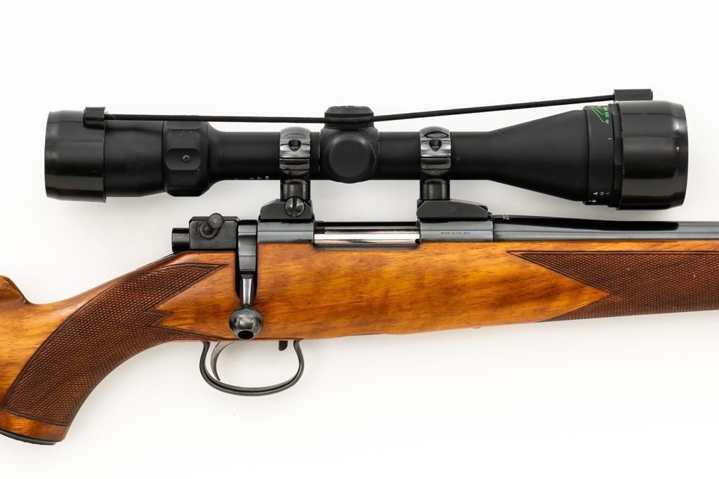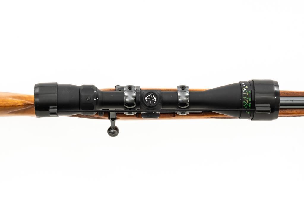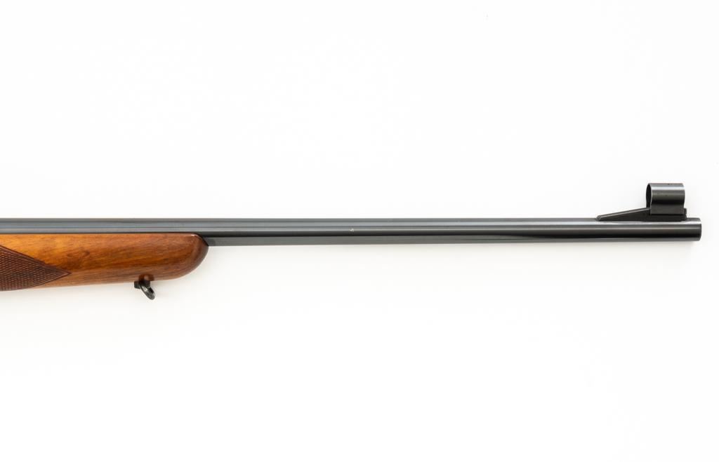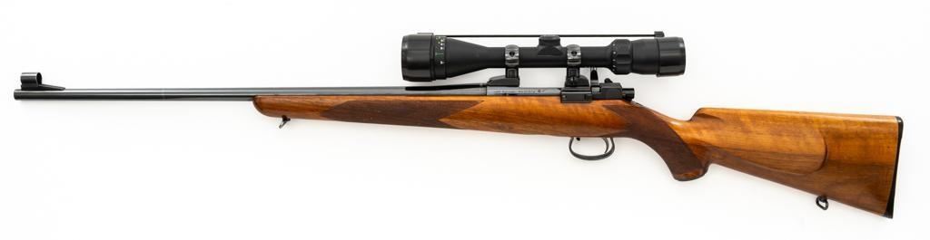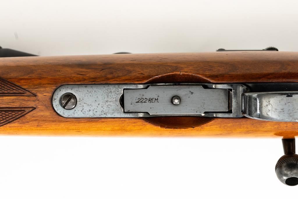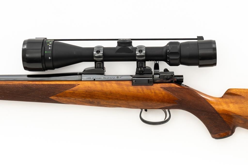 Sako L46 Riihimaki Bolt Action Rifle, #31572, .222 Rem. cal., 24'' barrel, blue finish; checkered walnut one-piece pistol grip stock with sling swivels, pancake cheekpiece, ending with a ribbed composition Sako buttplate, providing a 13.5'' LOP. Rifle also features a hooded ramped blade front sight, no rear sight, detachable factory three-round blue steel magazine, and double square bridge. Marked ''MADE IN FINLAND'' on right side of the front ring. Bolt with matching serial number. Mfg'd 1956. Rifle is topped with Redfield two-piece bases, rings, and Bushnell 4-12x40mm scope, finished in matte black, with lens covers, and duplex reticle. Scope rates near excellent overall with clear, bright optics. Rifle is in fine overall condition, retaining approx. 94%-95% factory blue, with light wear at the muzzle, areas of thinning finish and minor scuffs along the barrel; light wear to the receiver. There are a few spots of mild corrosion on the trigger guard/floorplate. Stock with scattered light indentations and impressions. Action is smooth. Bore is near excellent with sharp rifling. Est. $1,000-$1,400. (C&R/PPT)