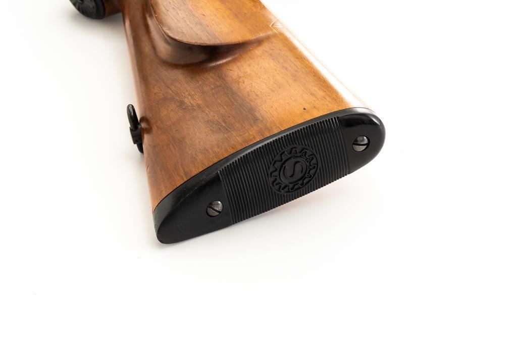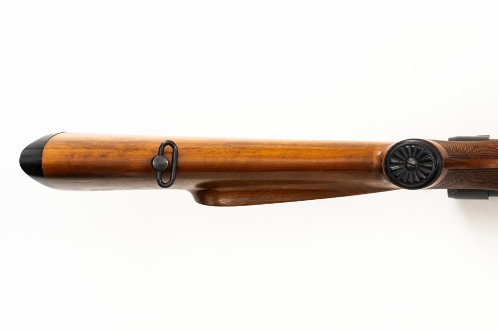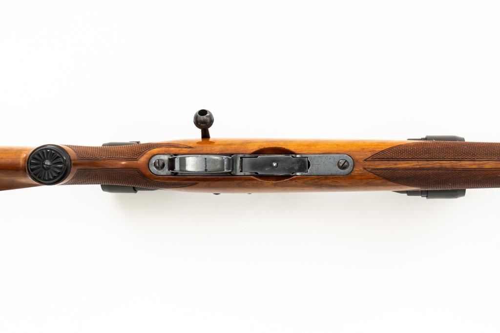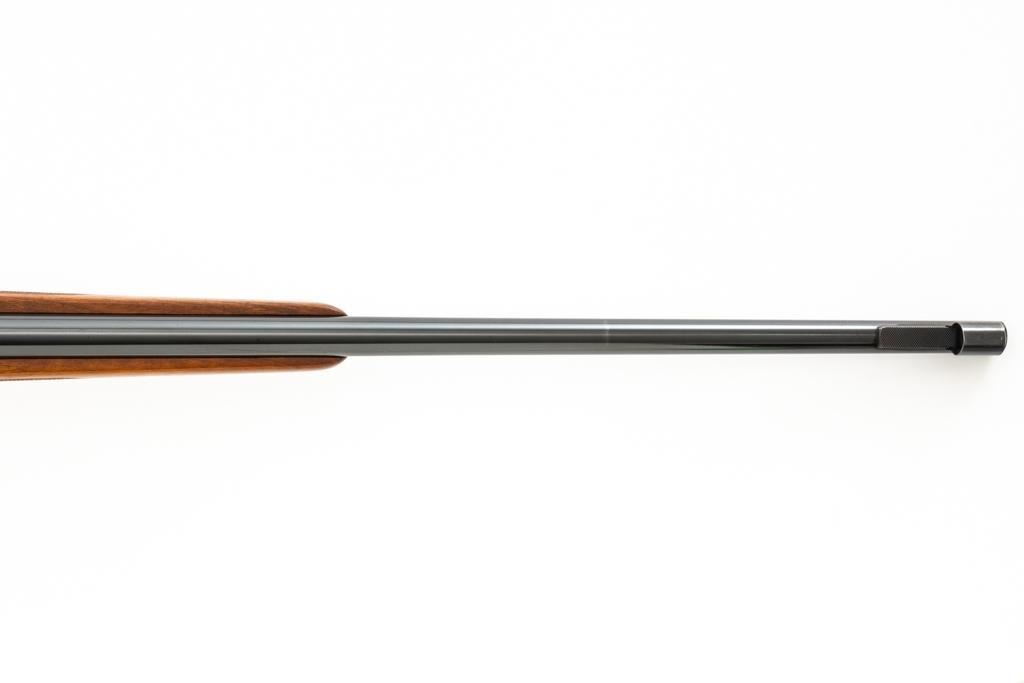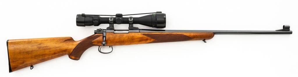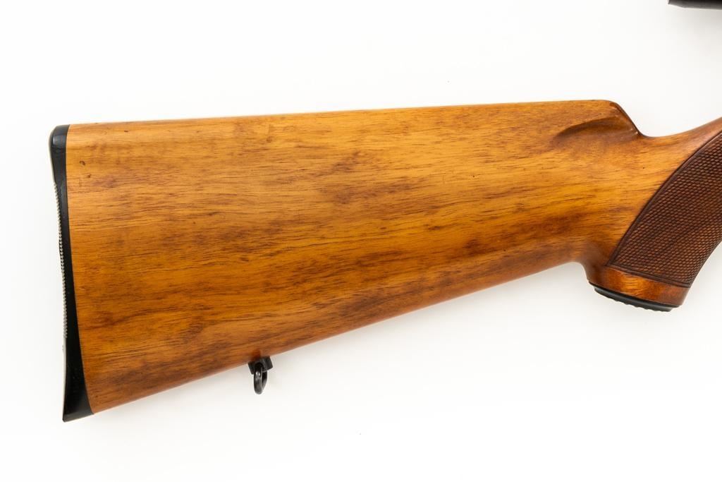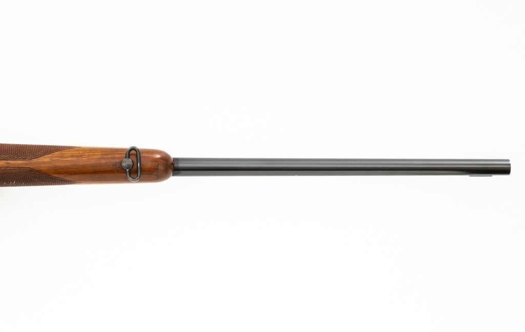 Sako L46 Riihimaki Bolt Action Rifle, #31572, .222 Rem. cal., 24'' barrel, blue finish; checkered walnut one-piece pistol grip stock with sling swivels, pancake cheekpiece, ending with a ribbed composition Sako buttplate, providing a 13.5'' LOP. Rifle also features a hooded ramped blade front sight, no rear sight, detachable factory three-round blue steel magazine, and double square bridge. Marked ''MADE IN FINLAND'' on right side of the front ring. Bolt with matching serial number. Mfg'd 1956. Rifle is topped with Redfield two-piece bases, rings, and Bushnell 4-12x40mm scope, finished in matte black, with lens covers, and duplex reticle. Scope rates near excellent overall with clear, bright optics. Rifle is in fine overall condition, retaining approx. 94%-95% factory blue, with light wear at the muzzle, areas of thinning finish and minor scuffs along the barrel; light wear to the receiver. There are a few spots of mild corrosion on the trigger guard/floorplate. Stock with scattered light indentations and impressions. Action is smooth. Bore is near excellent with sharp rifling. Est. $1,000-$1,400. (C&R/PPT)