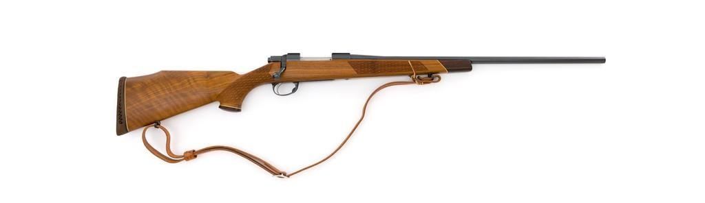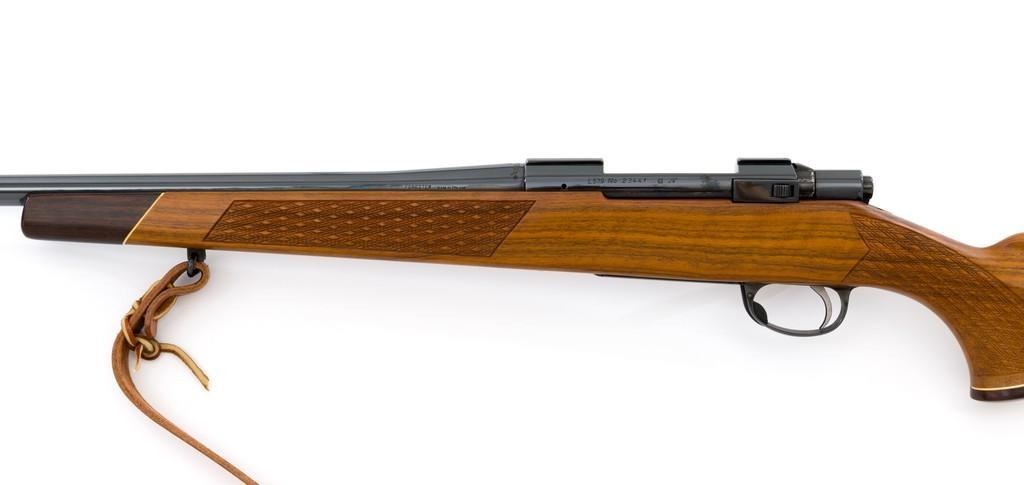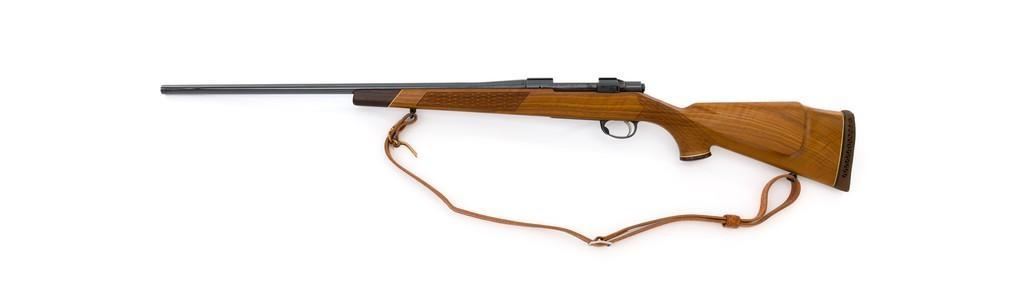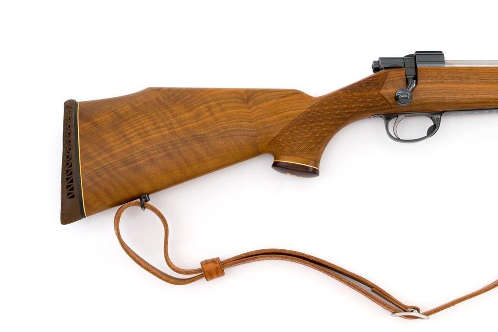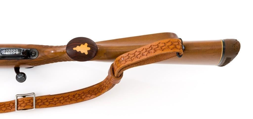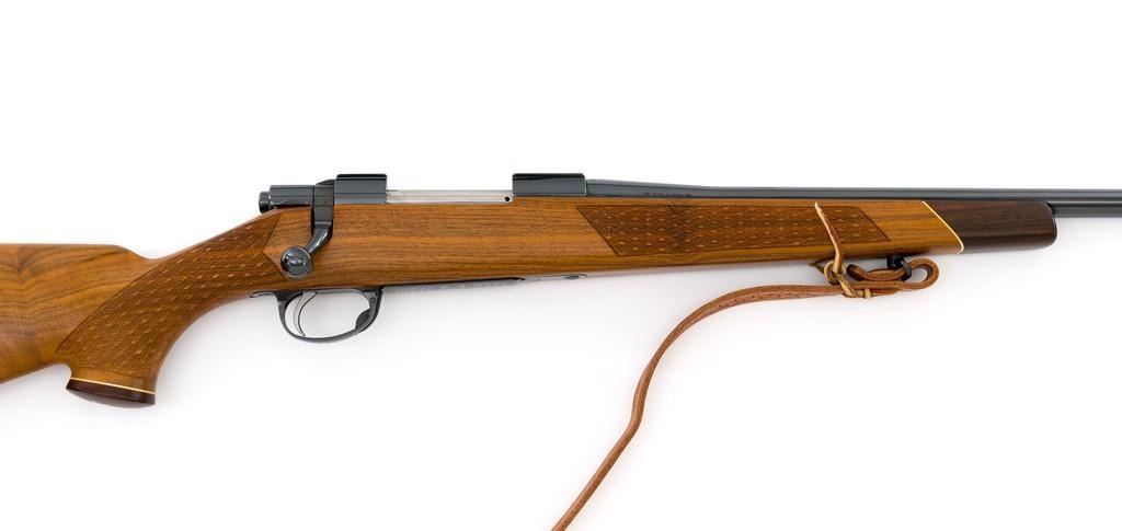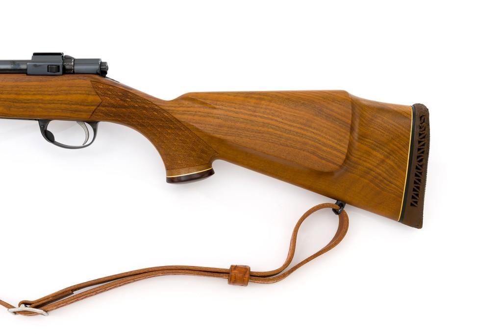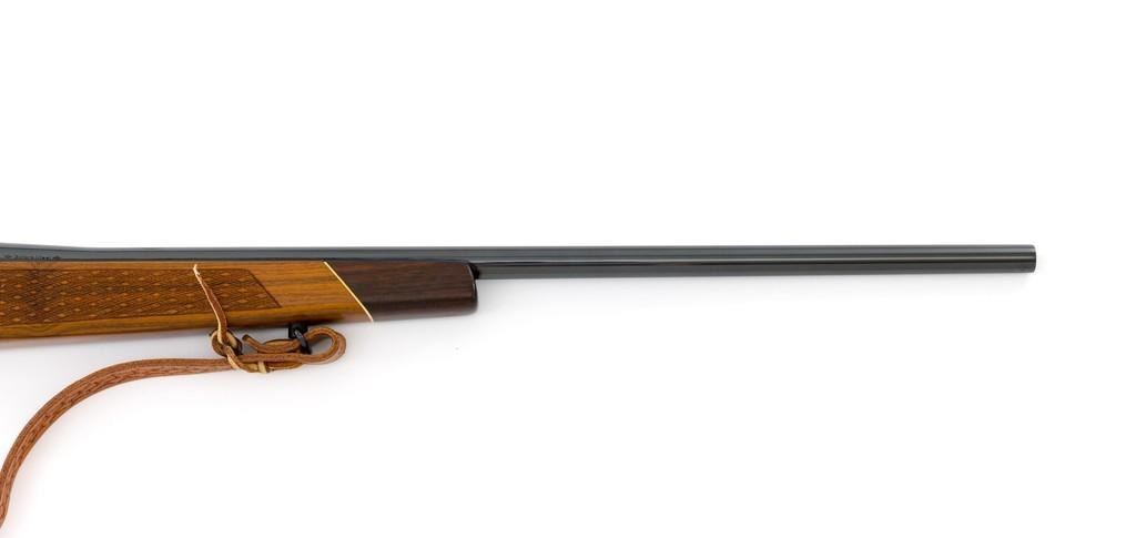 Sako Forester Model L579 Bolt Action Rifle, #23441, .243 Win. cal., 23'' barrel, blue finish. Skipline checkered walnut one-piece Monte Carlo stock with sling swivels, tooled leather rifle sling, inlaid grip cap, rosewood forend tip, and ending with a ventilated rubber recoil pad, providing a 13.75'' LOP. There is no provision for sights but features a factory grooved receiver. Factory markings are clear, with ''MADE IN FINLAND'' on left side of the barrel; ''Bofors Steel'' on the right side. Bolt with matching serial number. Mfg'd 1963. Rifle is in excellent overall condition, retaining approx. 98%-99% factory finish, with only light marks and some dried oil. Stock is excellent, with minor storage marks and fine checkering detail. Action functions smoothly. Bore is mirror bright with excellent rifling. Est.: $900-$1,200. (C&R/PPT)