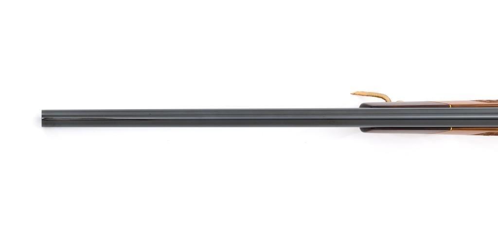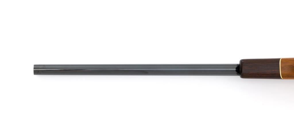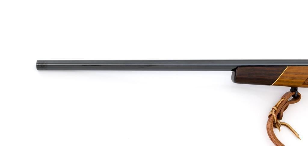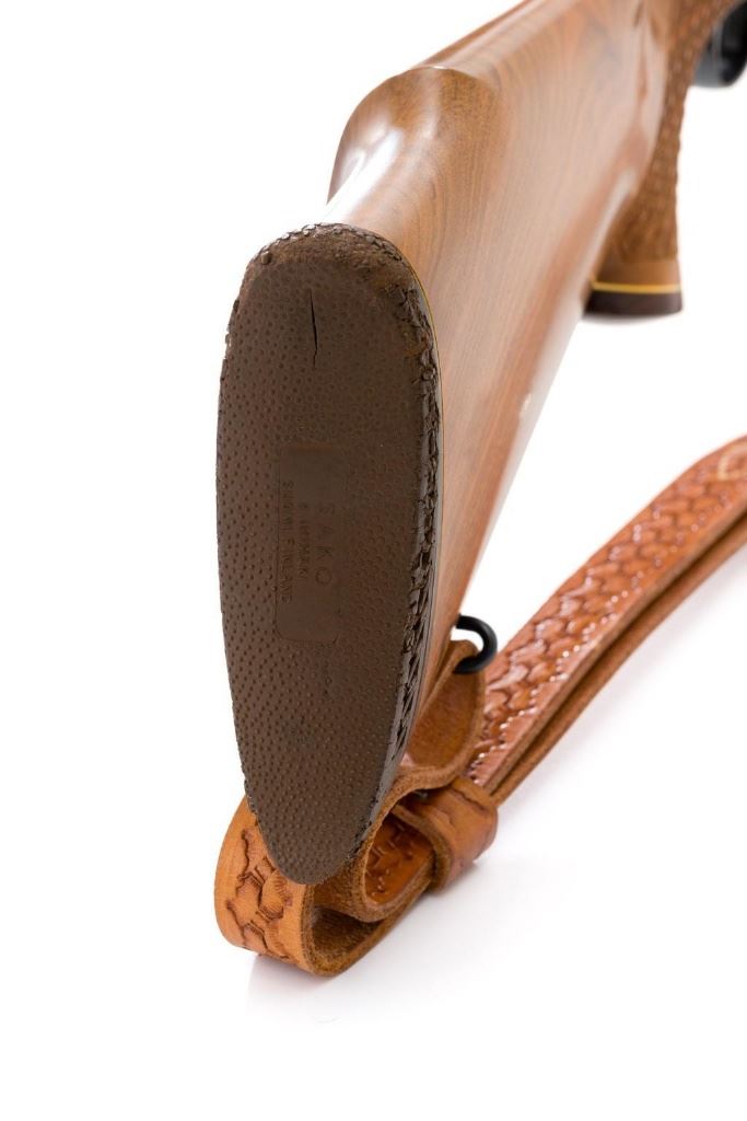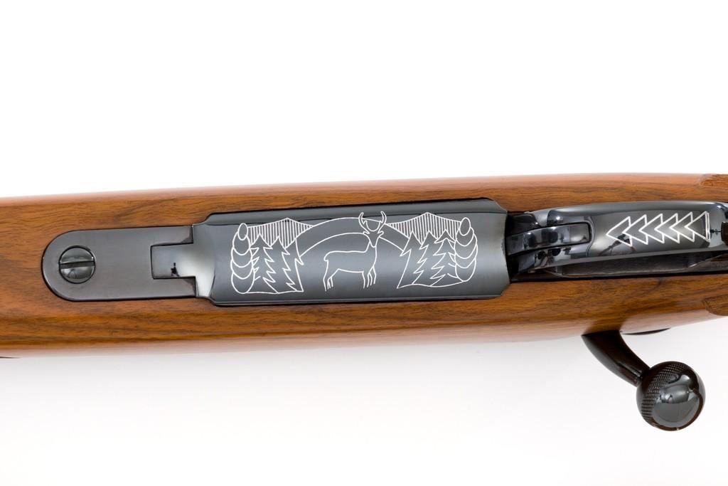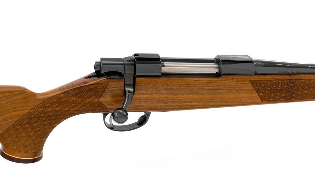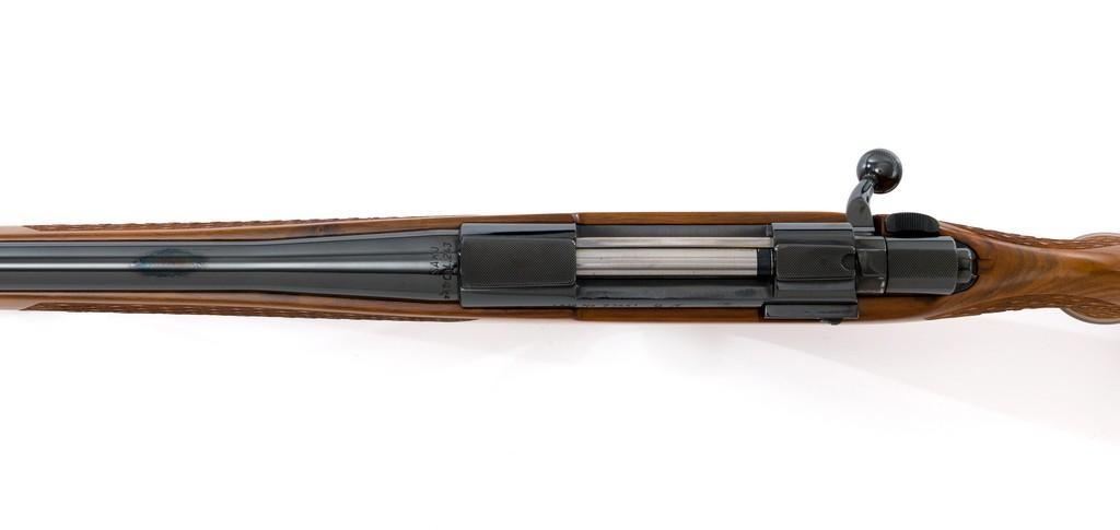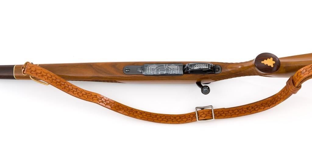 Sako Forester Model L579 Bolt Action Rifle, #23441, .243 Win. cal., 23'' barrel, blue finish. Skipline checkered walnut one-piece Monte Carlo stock with sling swivels, tooled leather rifle sling, inlaid grip cap, rosewood forend tip, and ending with a ventilated rubber recoil pad, providing a 13.75'' LOP. There is no provision for sights but features a factory grooved receiver. Factory markings are clear, with ''MADE IN FINLAND'' on left side of the barrel; ''Bofors Steel'' on the right side. Bolt with matching serial number. Mfg'd 1963. Rifle is in excellent overall condition, retaining approx. 98%-99% factory finish, with only light marks and some dried oil. Stock is excellent, with minor storage marks and fine checkering detail. Action functions smoothly. Bore is mirror bright with excellent rifling. Est.: $900-$1,200. (C&R/PPT)