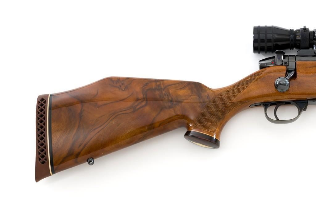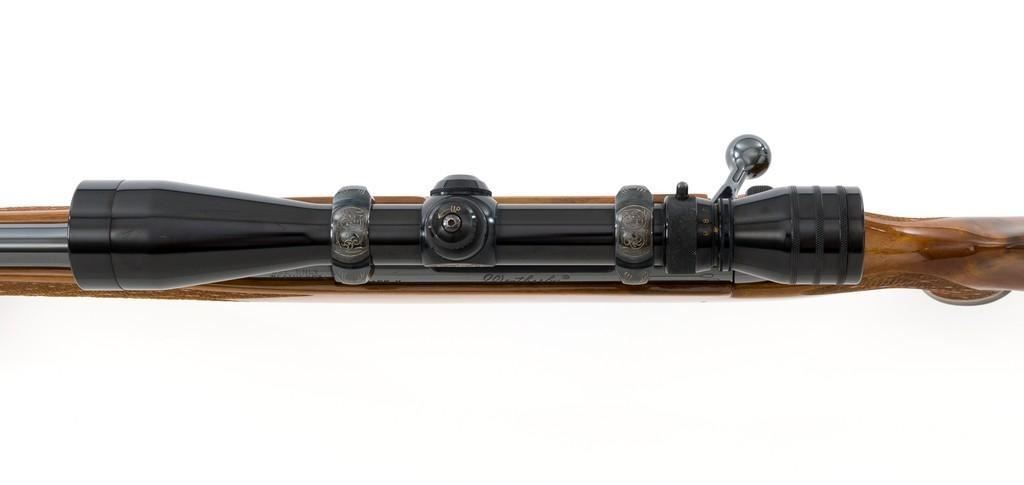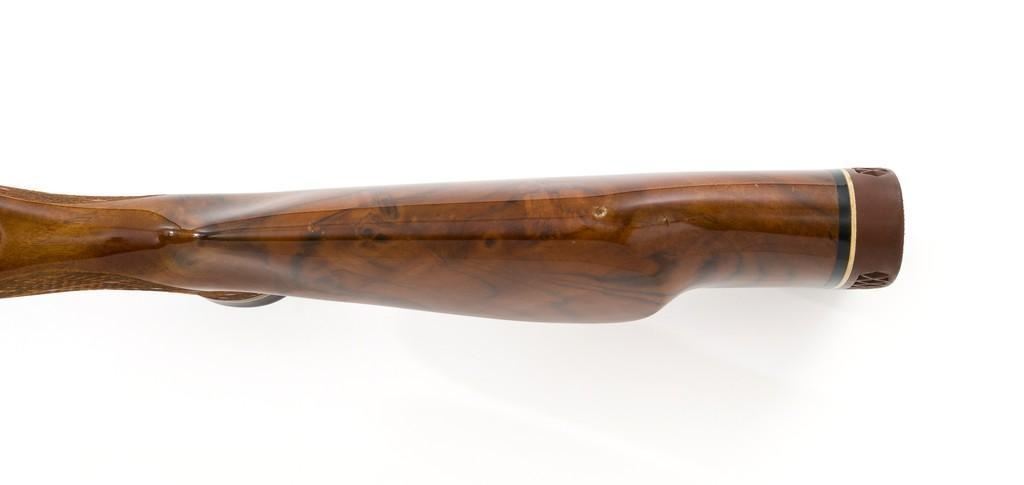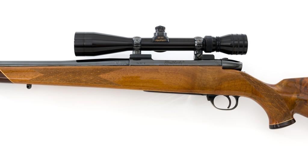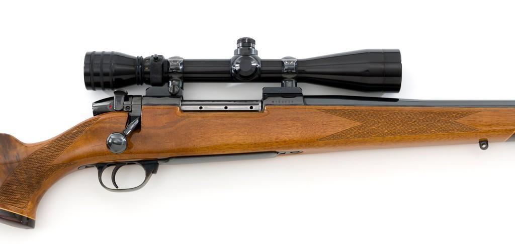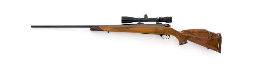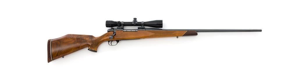 Weatherby Mark V Deluxe Bolt Action Rifle, #H164628, .300 Wby. Mag. cal., 26'' barrel, polished blue finish, no provision for sights. Finely skipline checkered gloss finished French AA walnut one-piece Monte Carlo stock with rosewood forend tip and grip cap, sling swivel studs, ending with a ventilated rubber recoil pad, providing a 13-3/8'' LOP. Left side of the receiver is marked ''MADE IN JAPAN''. Mfg'd 1983. Rifle is topped with a Redfield two-piece bases, engraved rings, and a Redfield 3-9x40mm scope, finished in gloss black with a duplex reticle, and includes a set of rubber lens covers. Scope is in fine condition with minor marks and bright, clear optics. Rifle is in near excellent overall condition, retaining approx. 97-98% factory blue, with an area of scratching on top of the barrel showing bare metal. The bottom metal shows light wear with thinning finish and edgewear on the trigger guard. Stock is also near excellent, with attractive figure and mineral streaking in the buttstock, displaying light scrapes and indentations, primarily on the buttstock. Action functions smoothly and the trigger is crisp. Bore is mirror bright, showing little use. Est.: $1,500-$2,000. (Modern/PPT)