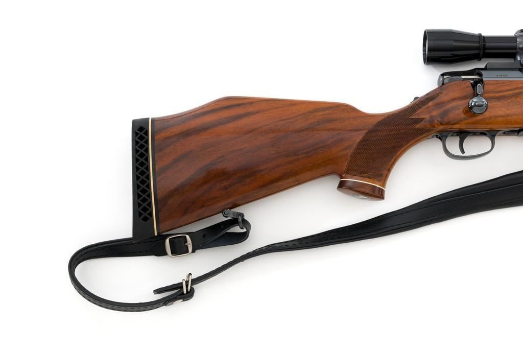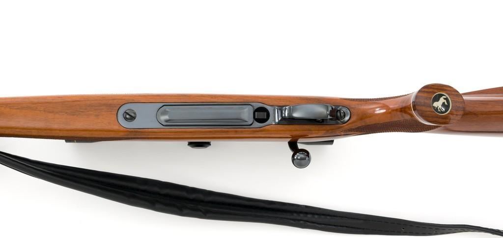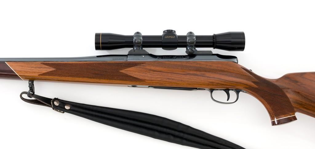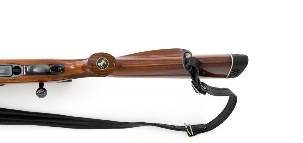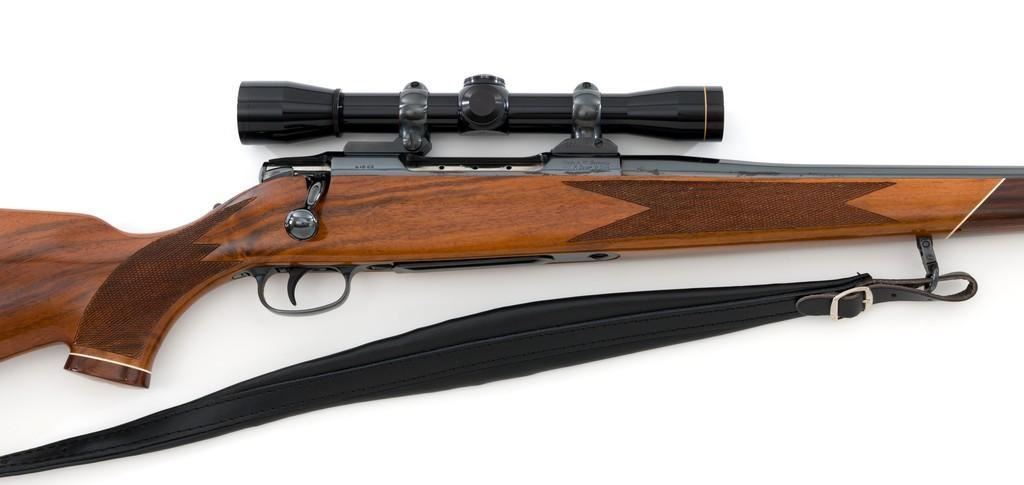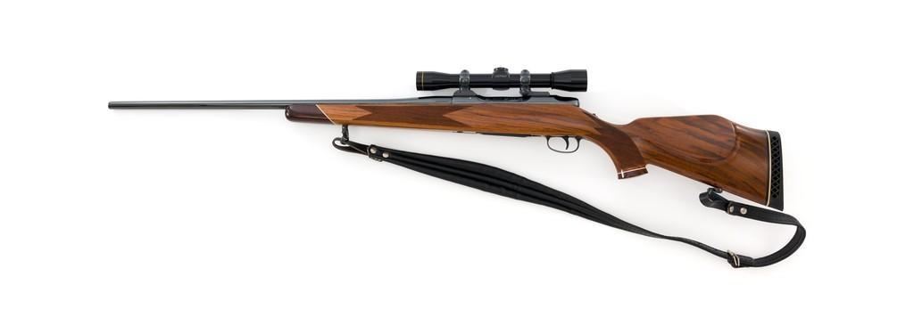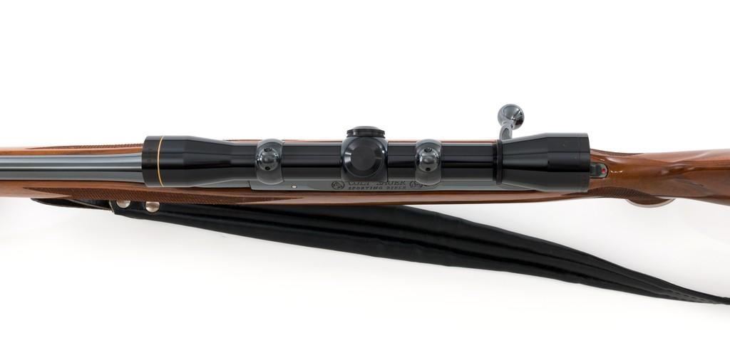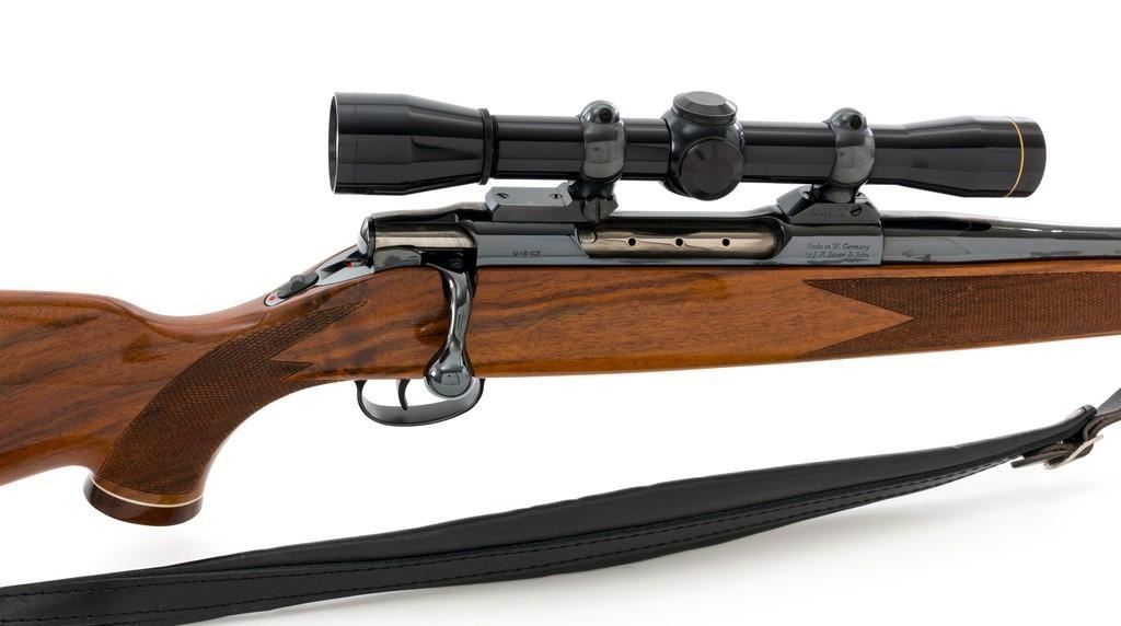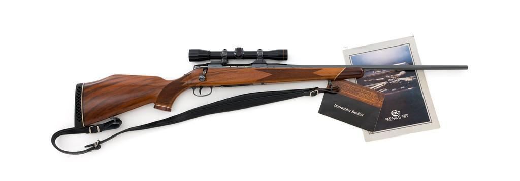 West German Colt Sauer Bolt Action Rifle, #CR24479, .30-06 cal., 24'' barrel, polished blue finish; finely checkered deluxe American walnut one-piece Monte Carlo stock with rosewood forend tip, grip cap with Rampant Colt inlay, sling swivels with black leather sling, ending with a black Colt/Sauer ventilated rubber recoil pad, providing a 13.75'' LOP. There is no provision for sights. Includes one detachable Colt 4-round blue steel magazine. Marked ''Made in W. Germany / by J.P. Sauer & Sohn'' on right side of the receiver, with German proofs. Bolt is stamped with matching serial number. Topped with Buehler two-piece bases, rings, and Leupold M8-4X fixed power scope, with gloss black finish and duplex reticle. Scope is in excellent condition with clear, bright optics. Rifle is in excellent overall condition, retaining approx. 98%-99% factory finish, with only minor handling marks. Stock is excellent, with light storage marks, displaying attractive figure and mineral streaking in the buttstock. Action is smooth with a crisp trigger. Bright bore is excellent with sharp rifling, showing little use. Includes a 1979 Colt catalog and instruction manual. Est.: $1,800-$2,400. (Modern/PPT)