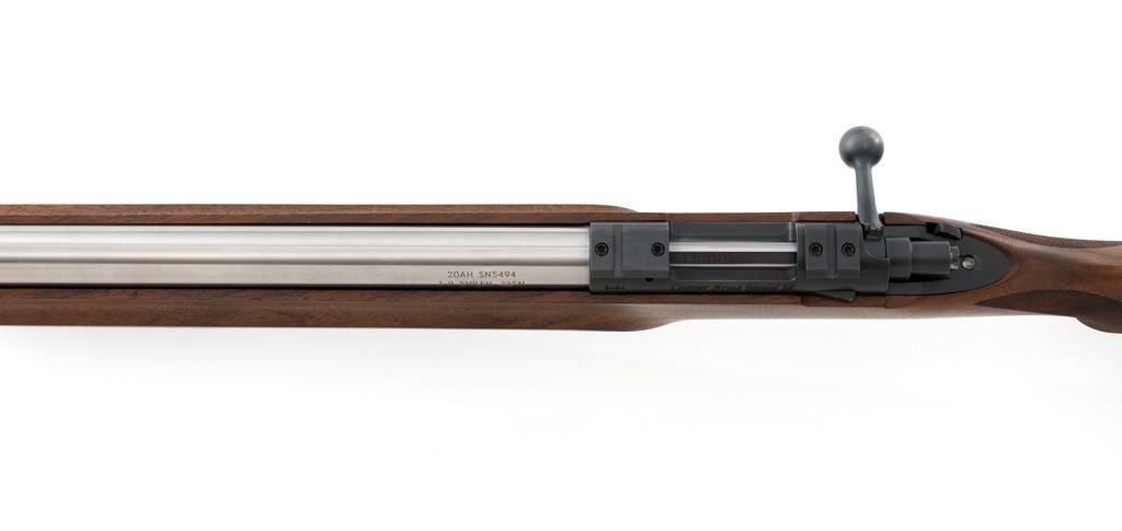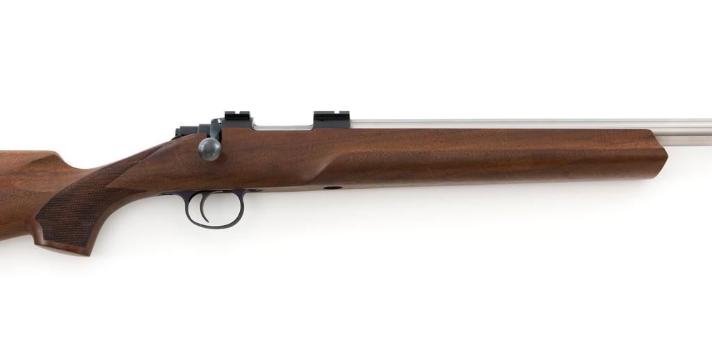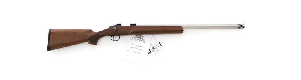 Cooper Arms Model 38 Varminter Bolt Action Single Shot Rifle, #5494, .20 Ackley Hornet cal., 24'' ported stainless steel Shilen heavy barrel, blue finish; checkered select Claro walnut one-piece pistol grip stock with beavertail forend and black basketweave pattern buttpad, providing a 13.75'' LOP. Manufactured without sights. Bolt is etched with matching serial number. Barrel is marked ''1-9 SHILEN .225N''. Receiver is topped with Warne two-piece mounts. Includes the factory manual. Mfg'd circa 2000-2019. Rifle is in excellent overall condition, with a few intermittent light scratches along the barrel. Receiver retains approx. 98%-99% factory blue, with minor storage marks, and a few small nicks on the trigger guard. Stock is excellent with attractive figure in the buttstock. Bore is mirror bright with excellent rifling. Action is extremely smooth and the trigger breaks crisply. Est.: $1,500-$2,000. (Modern/PPT)