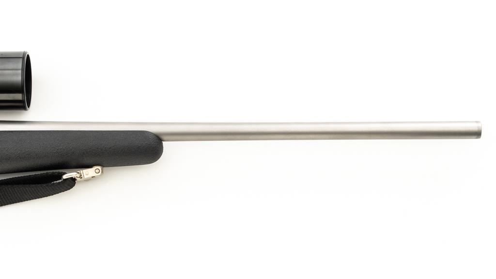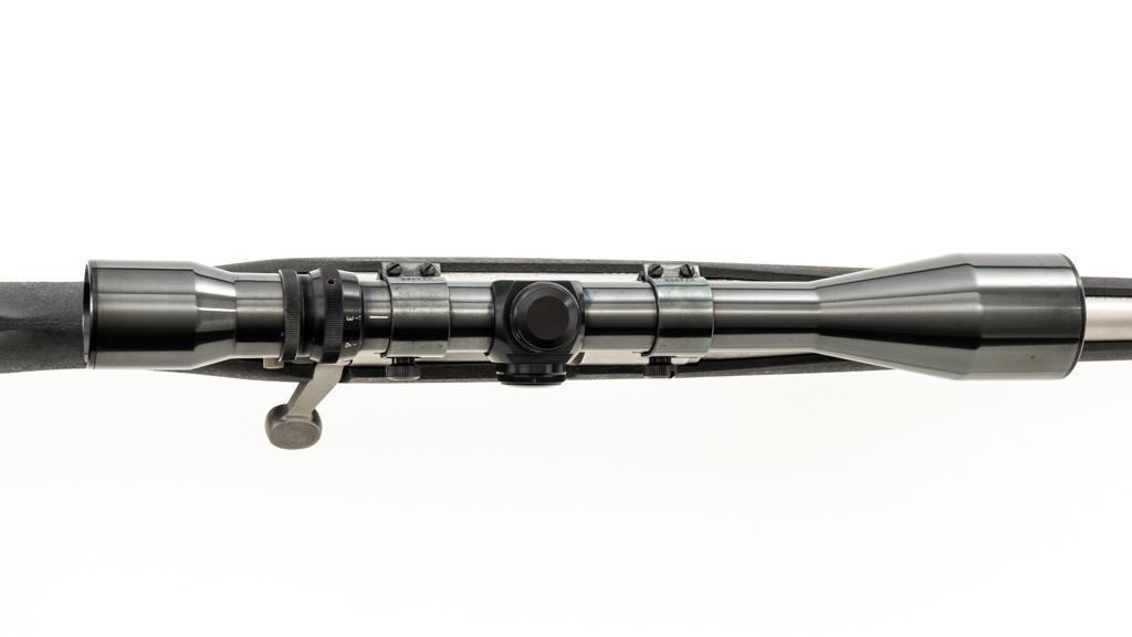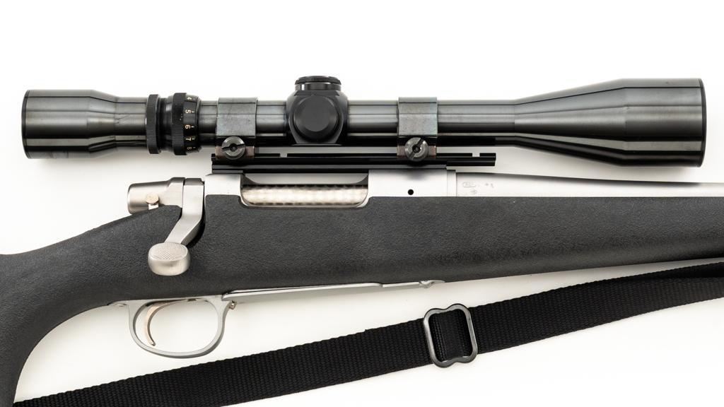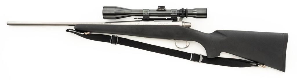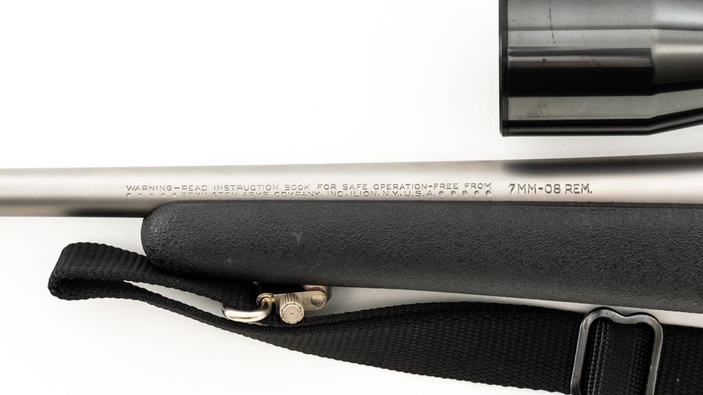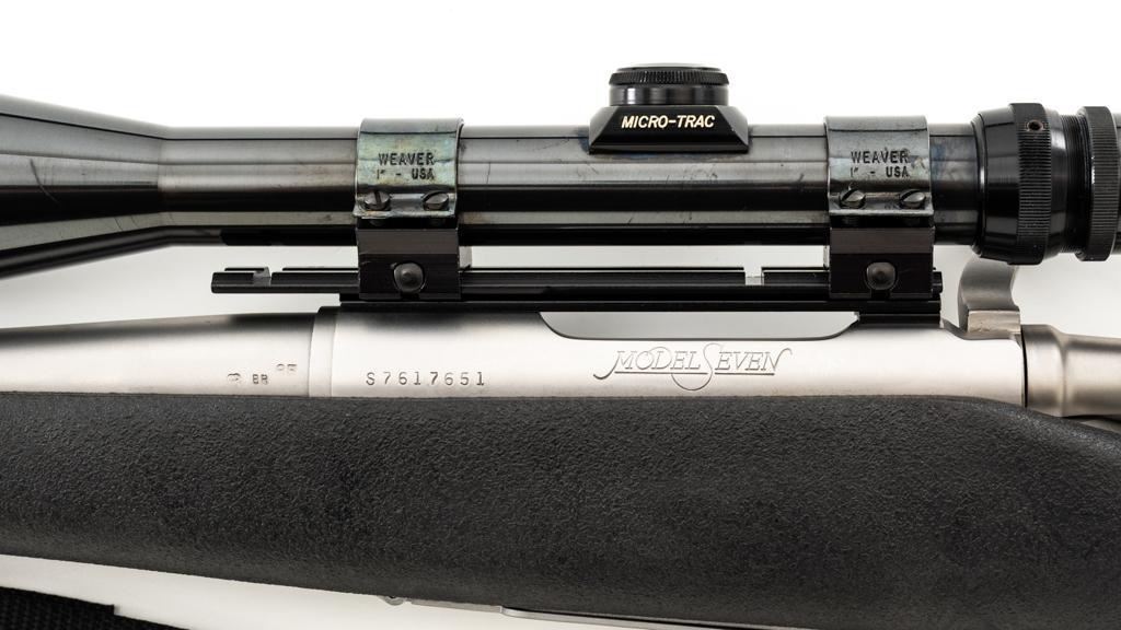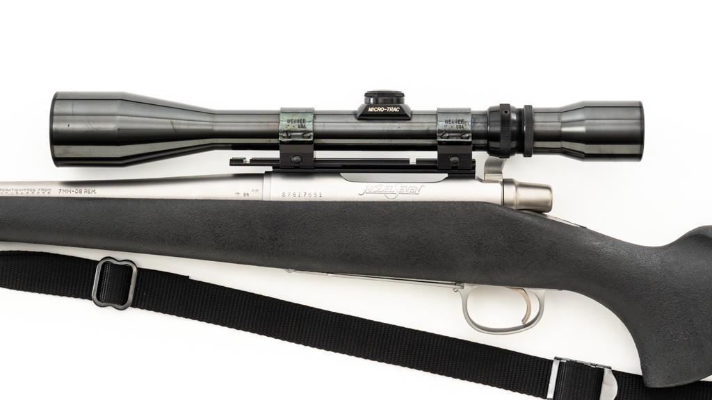 Remington Model Seven Stainless Steel Lightweight Bolt Action Rifle, #S7617651, 7mm-08 cal., 20'' barrel, matte stainless steel finish. Textured synthetic one-piece pistol grip stock with sling swivels, nylon sling, ending with a solid rubber Remington buttpad, providing a 13.5'' LOP. There is no provision for sights. Factory jeweled bolt with matching serial number. Rifle is topped with a Weaver one-piece base, rings, and Weaver Micro-Trac 3-9x scope, with gloss black finish, and duplex reticle. Scope is excellent with clear, bright optics. Rifle is in excellent overall condition, showing only light handling marks and appears little used. Stock with minor storage marks. Action functions smoothly with a crisp trigger. Bore is mirror bright with excellent rifling. Est.: $1,000-$1,500. (Modern/PPT)