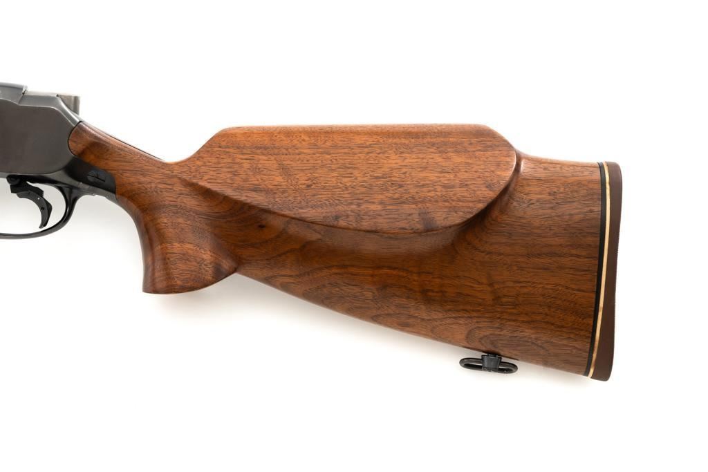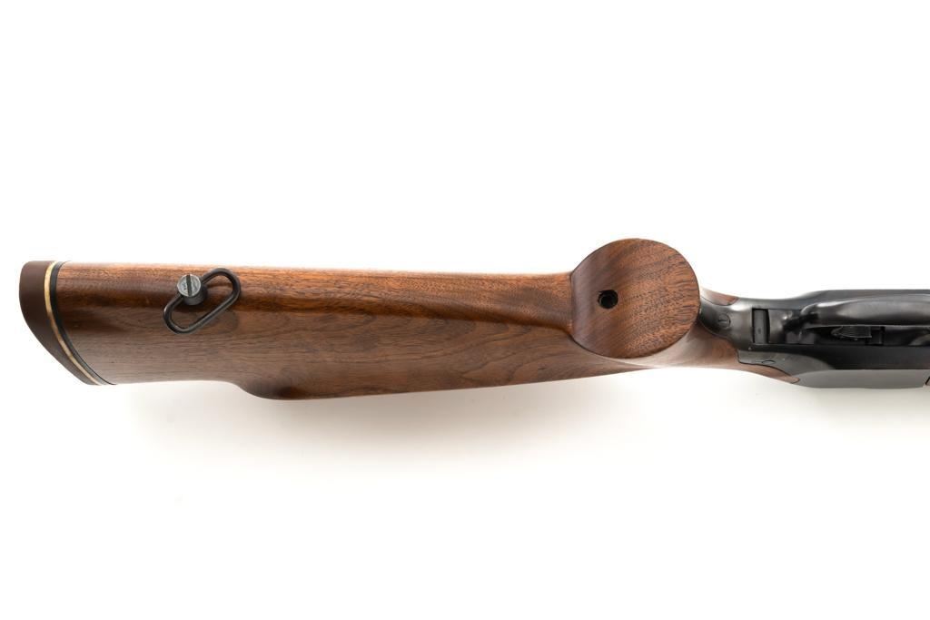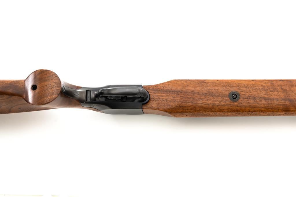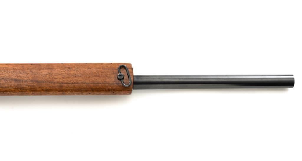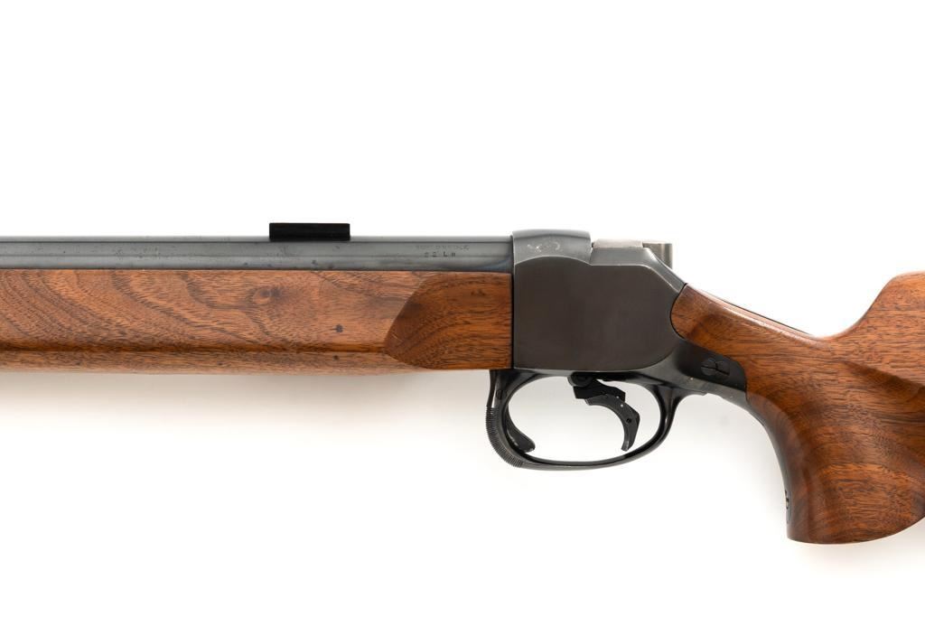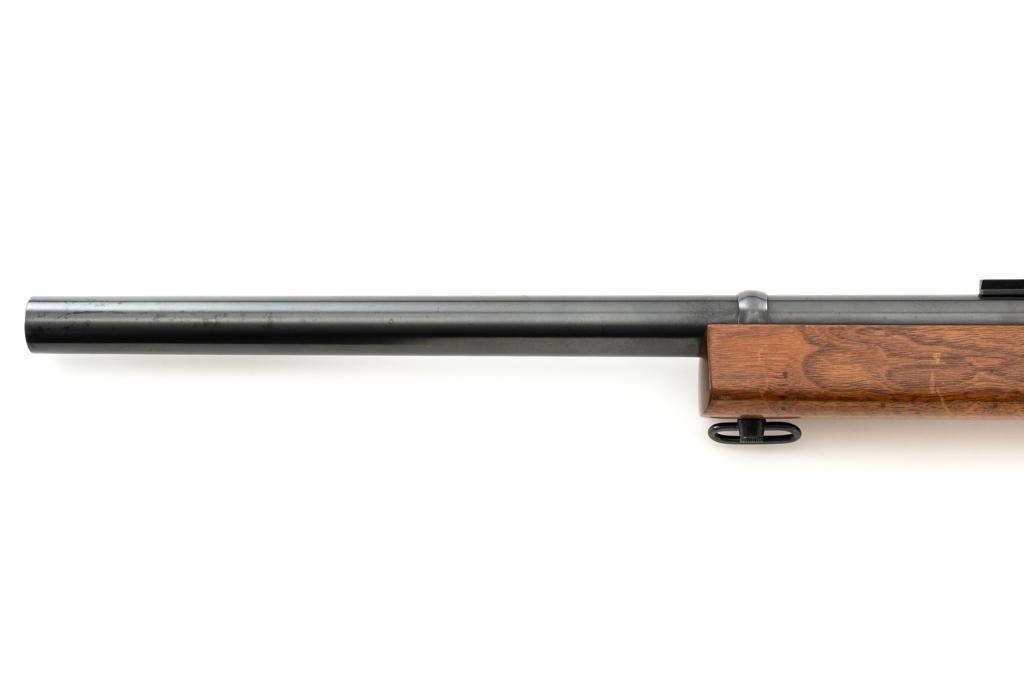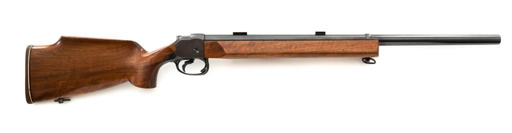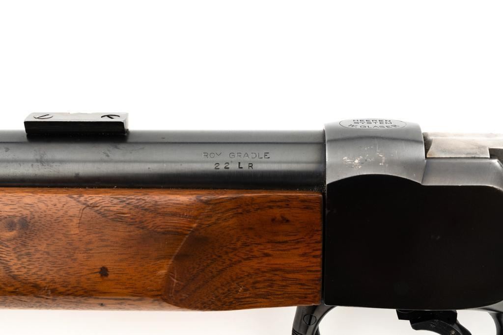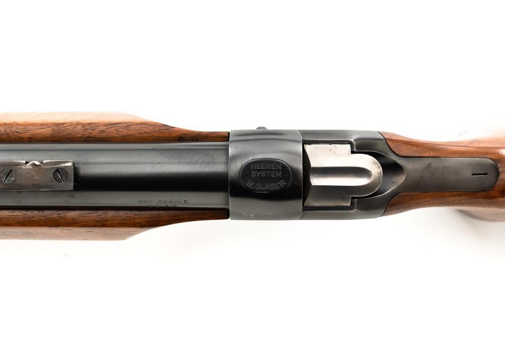 Custom Roy Gradle Glaser Heeren System Single Shot Rifle, #270, .22 LR cal., 28'' heavy Roy Gradle barrel, blue finish, smooth walnut pistol grip target stock with sling swivels and exaggerated comb, 2'' wide beavertail forend, two (2) sight blocks on the barrel, with an added trigger shoe. Buttstock ends with a Roy Gradle recoil pad, providing a 14'' LOP. Factory markings are clear, with ''HEEREN SYSTEM / W. GLASER'' on top of the action, and ''ROY GRADLE'' on the barrel. Rifle is in fine overall condition, retaining approx. 95%-96% thinning finish with light wear at the muzzle, minor marks, and light scratches. Stock with intermittent indentations and storage marks. Action is crisp and functions smoothly. Bore is near excellent with well-defined rifling. Wilhelm Glaser was a noted Swiss gunsmith/gunshop owner in Zurich, Switzerland who began building custom rifles on Heeren actions, built by the Omega Watch Co. in the late 1940's. Roy Gradle was a noted Santa Barbara gunsmith in the 1950's and 60's. An interesting rifle that deserves further research. Est. : $1,500-$2,000. (Modern/PPT)